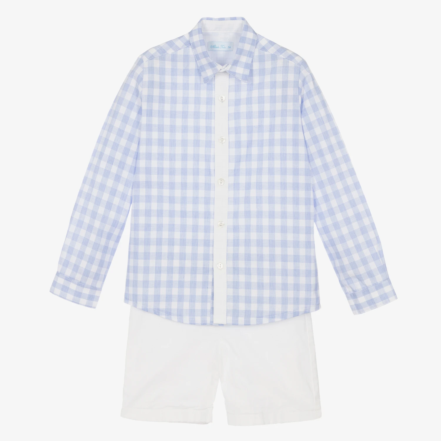 Blue shirt and shorts set for boys by Spanish brand Abuela Tata, made in a lightweight cotton and linen blend. The classic shirt is patterned in a lavender blue gingham check with a block white button placket. It has a smart pointed collar and buttoned cuffs. Completing the traditional set, the plain white shorts are fully lined and have a useful adjustable waistband. They have belt loops on the waist and fasten with a button and zip on the front.