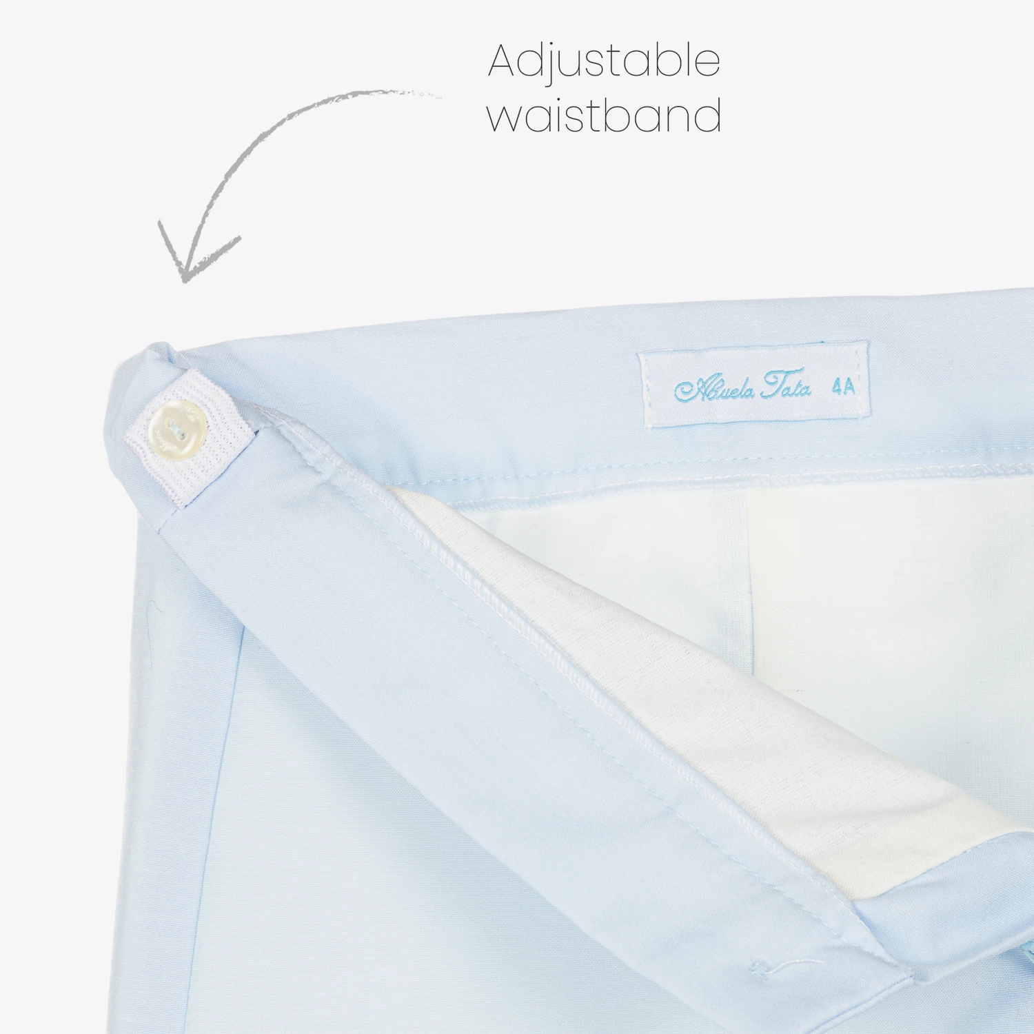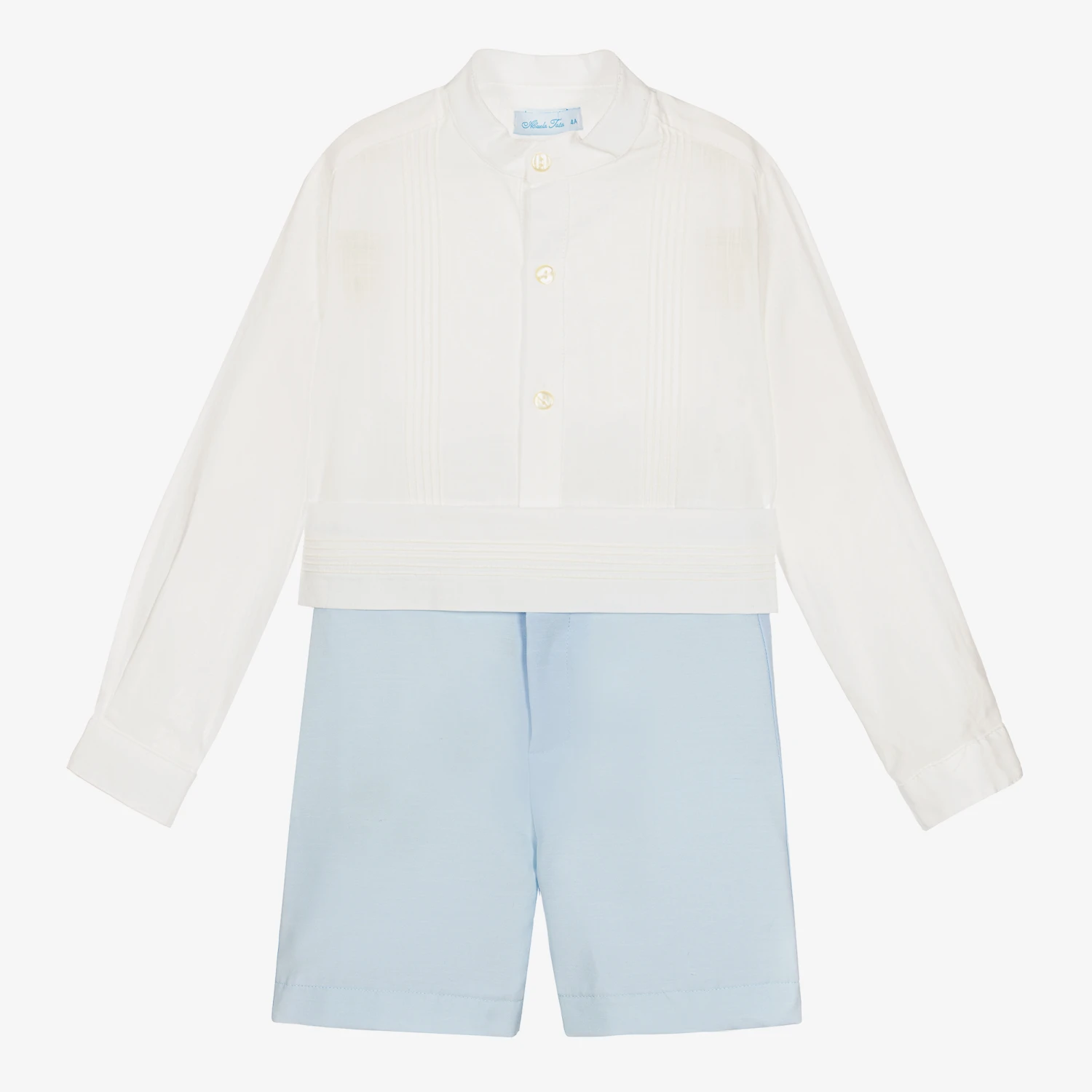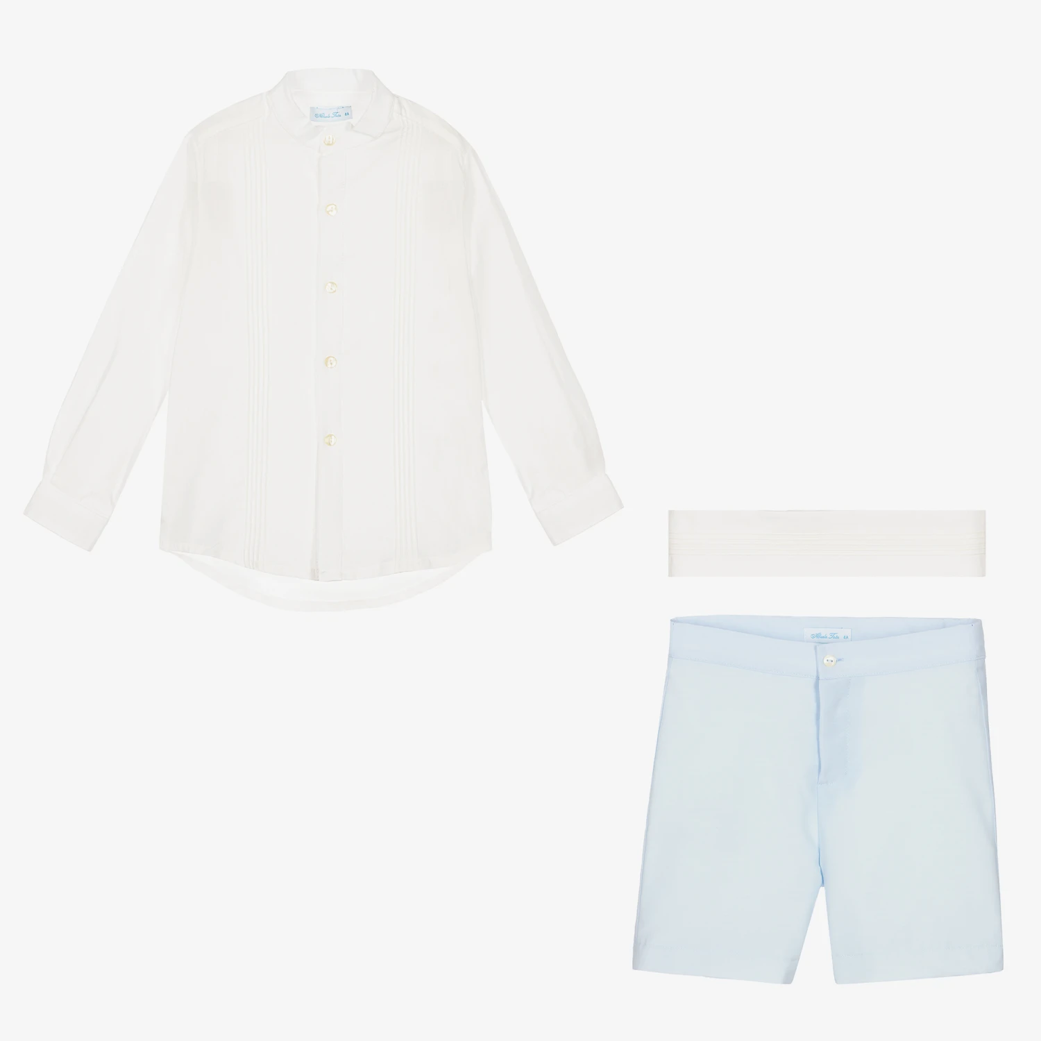 Lovely three piece shorts set for boys by Spanish brand Abuela Tata, ideal for a special occasion. With a linen look, the white, collarless cotton shirt has smart stitching detail on the front with logo button fastenings. It comes with pale blue, lined shorts that have a useful, adjustable waistband and fasten with a front button and zip. A smart, coordinating white cummerbund completes the set, fastening with concealed poppers.