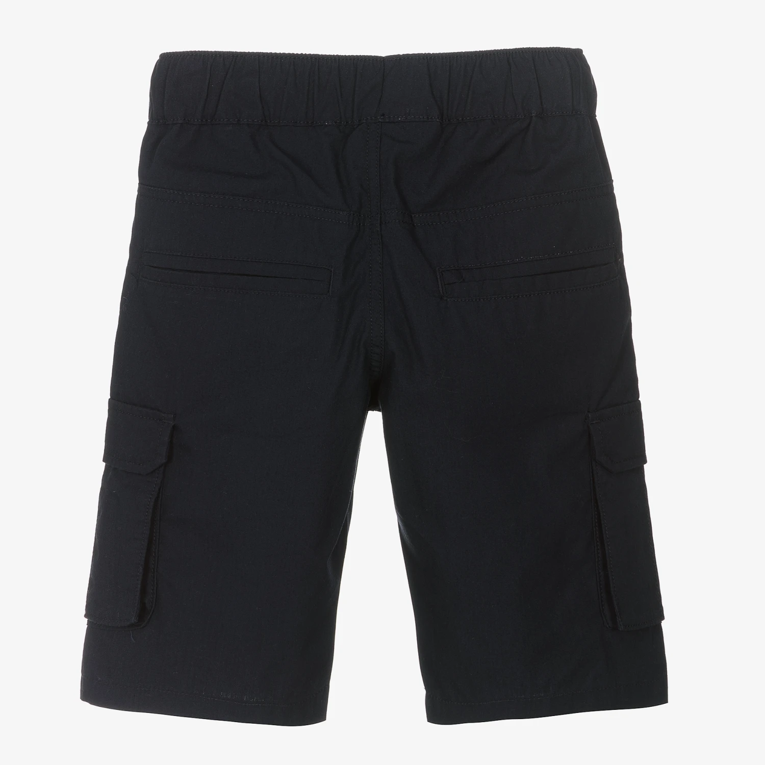 Navy blue cargo shorts for boys by AIGNER, with a white logo embroidered on the front. These Bermuda length shorts are made from soft cotton with slanted front pockets, cargo pockets with velcro fastening flaps and two back pockets. Easy pull-on, they have an elasticated waistband with a logo branded white drawstring.