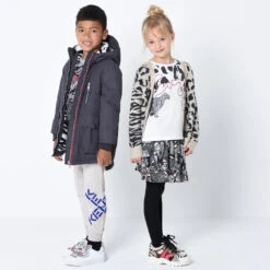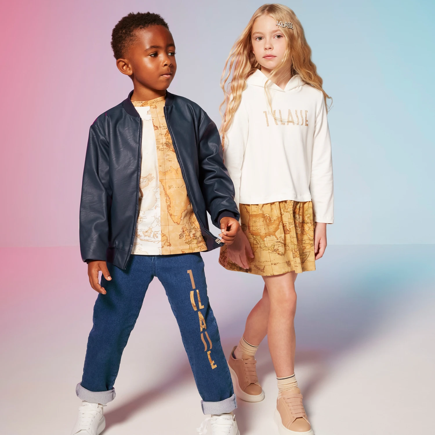 Boys mid-blue jeans from Alviero Martini, with the brand’s 1a Class logo on one leg in dark beige Geo map print. Made in a soft cotton blend, they have the look of denim and the comfort of stretchy jersey. A classic five-pocket style, they fasten with a zip and branded button and have an adjustable waist for a good fit. There is a branded jacron on the back waistband.