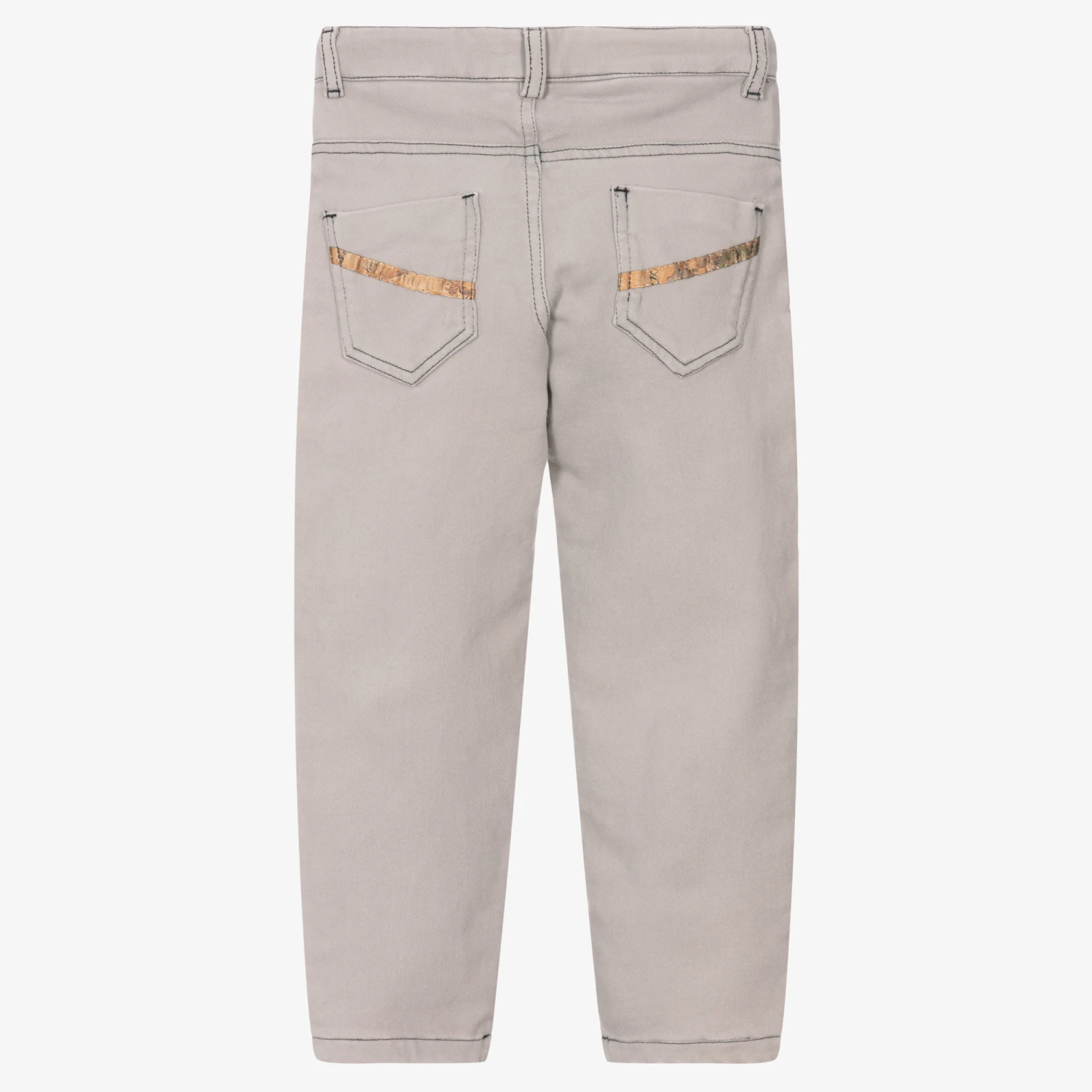 Boys grey jeans from Alviero Martini, with the brand’s distinctive dark beige Geo map trim on the front and back. Made with soft cotton, they have the look of denim and the comfort of stretchy jersey. A classic five-pocket style, they fasten with a zip and branded button and have an adjustable waist for a good fit.