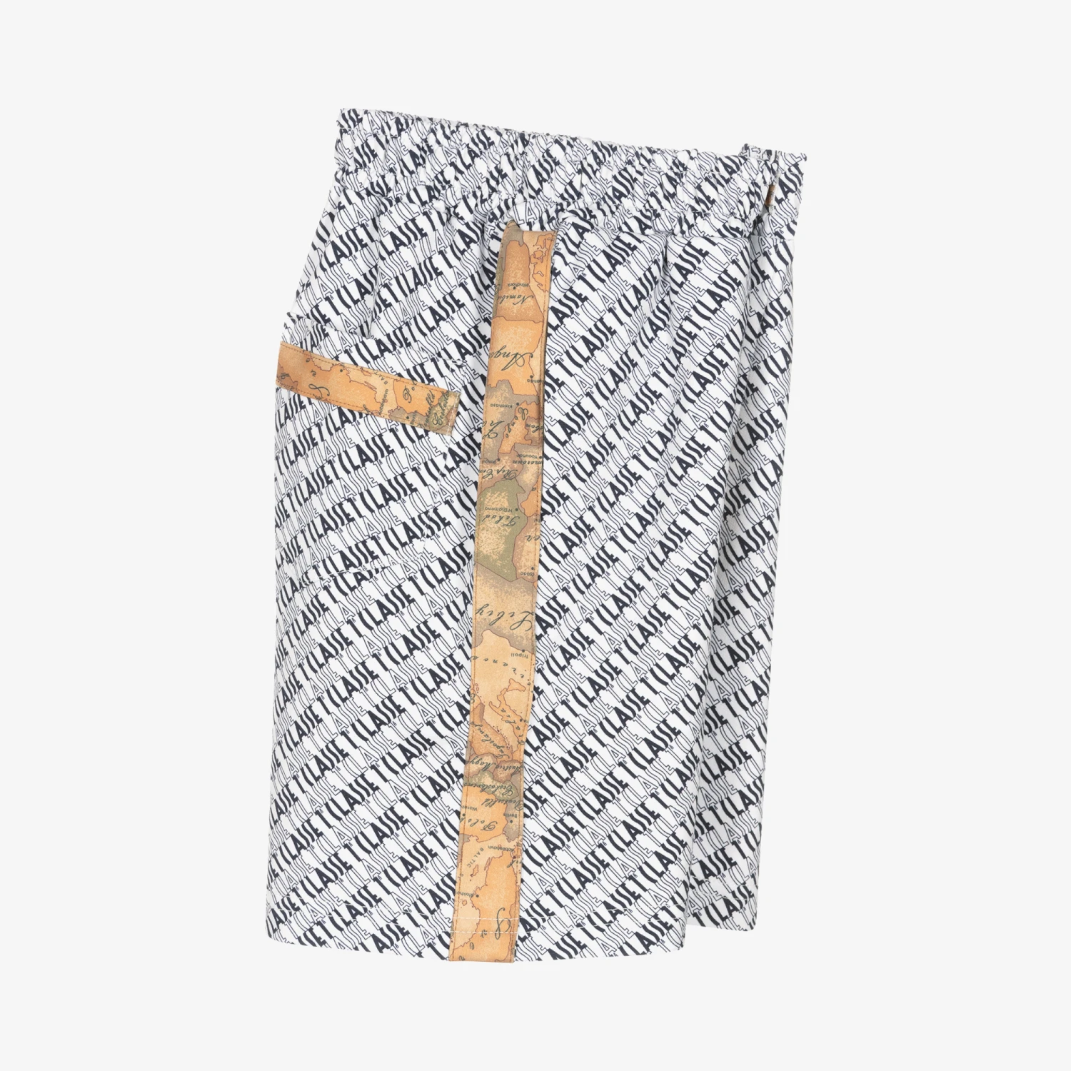 Boys white cotton shorts by Alviero Martini, crafted from a soft, stretchy, and lightweight jersey. An unmistakable design from the Italian label, these shorts have an all-over 1a Classe logo pattern in navy blue with dark beige Geo map print trims. They have useful side seam pockets and an elasticated waistband with drawstrings for a comfortable and casual fit.