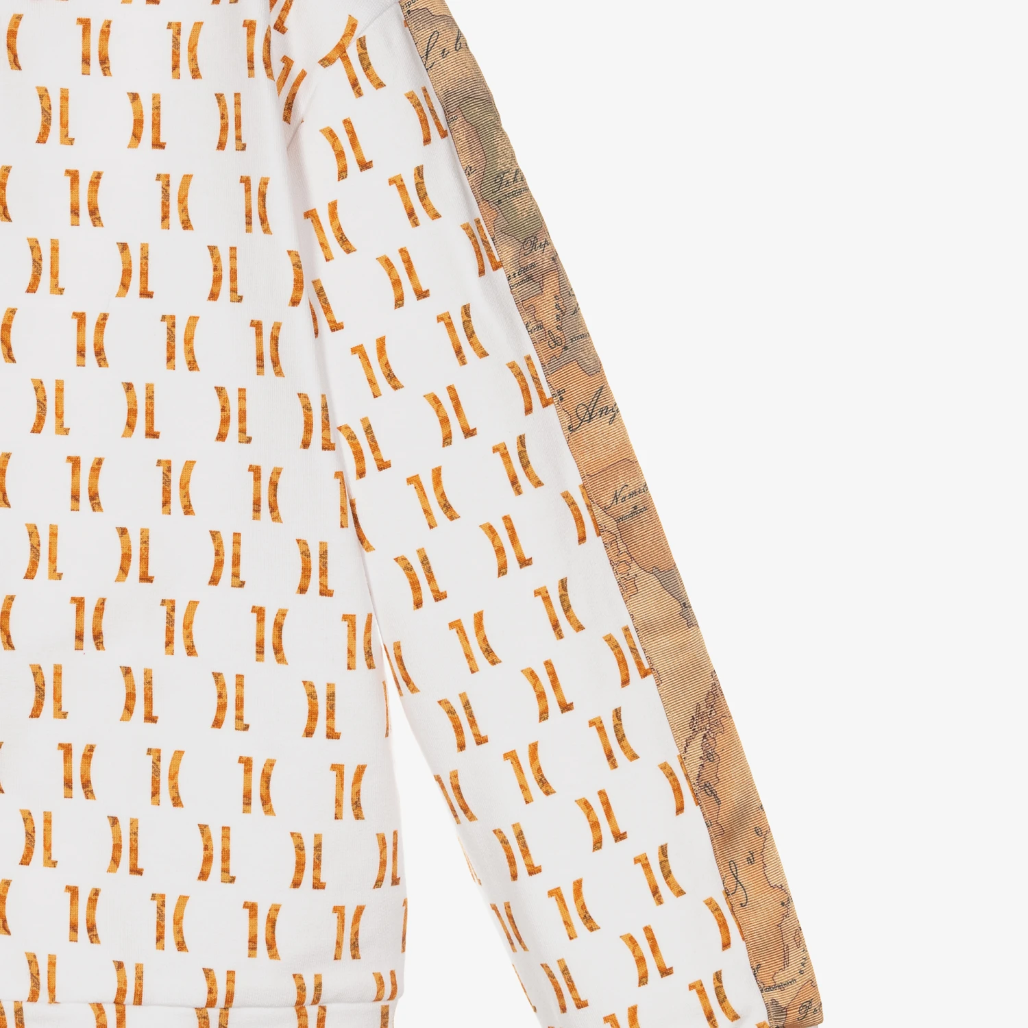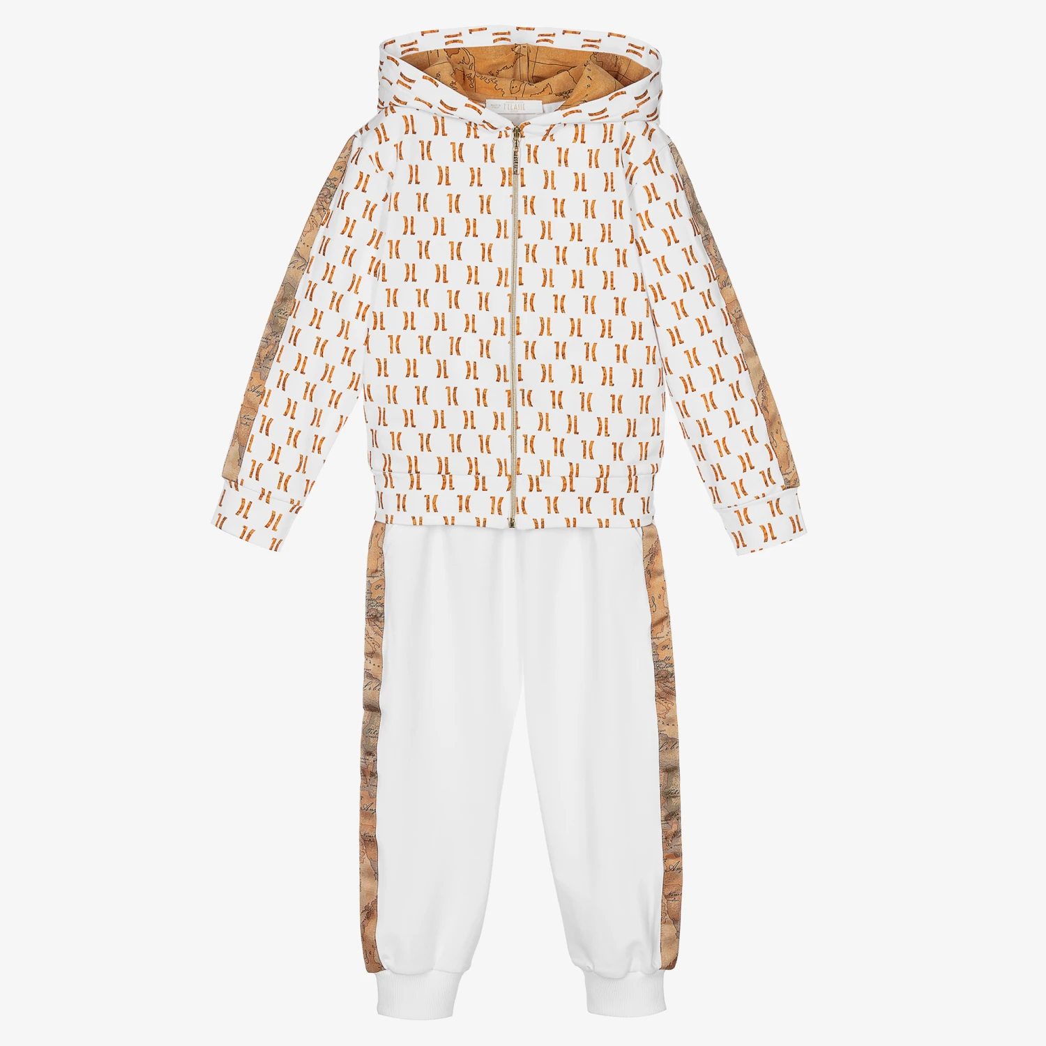White hooded tracksuit for boys by luxury brand Alviero Martini, made in soft cotton jersey. The top has an all-over 1C logo print in a dark beige Geo map print, with both pieces having matching Geo map print trims. The top is zip fastening and the trousers have an elasticated waistband with two front pockets.