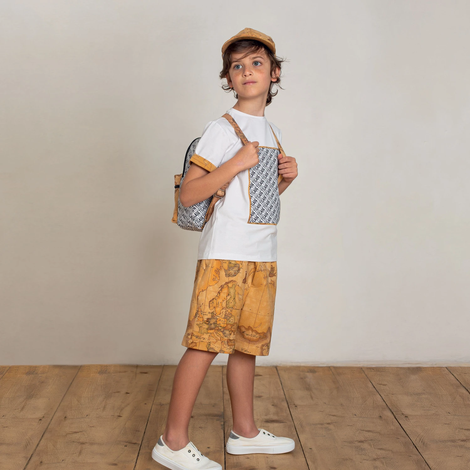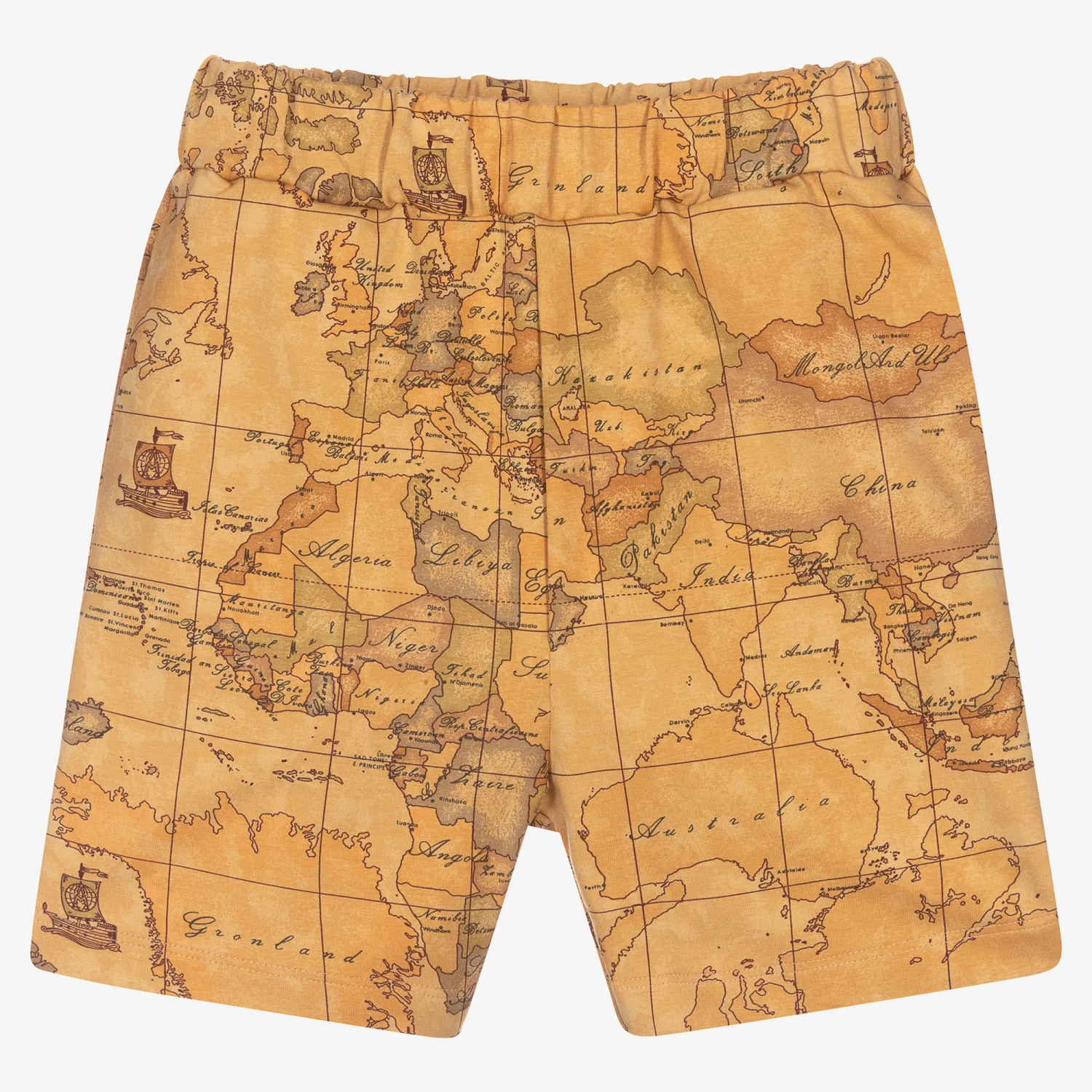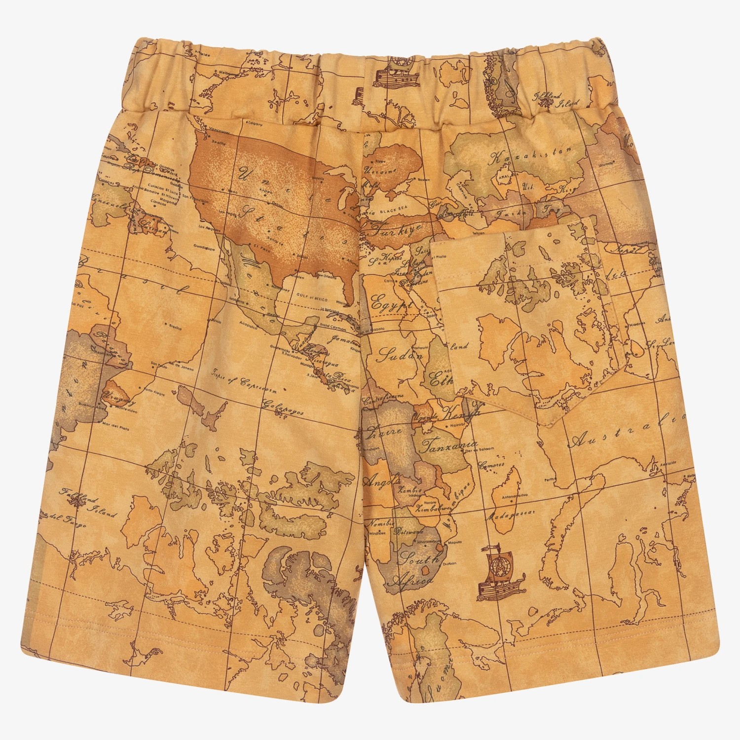 Younger boys dark beige Geo map print shorts by luxury brand, Alviero Martini. Styled in a Bermuda length, they have an elasticated waistband and side pockets.