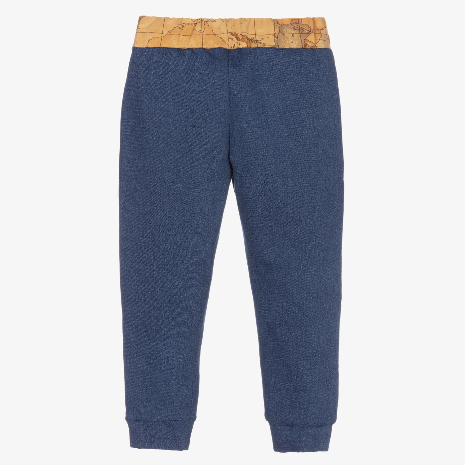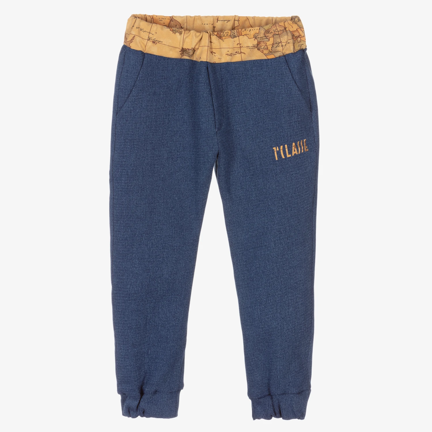 Younger boys blue joggers from luxury Italian designer, Alviero Martini, made in soft and stretchy denim jersey. They have signature dark beige Geo map print on the elasticated waistband and a matching 1a Classe logo print on the front. This comfortable, pull-on style has slanted front pockets and elasticated cuffs.
