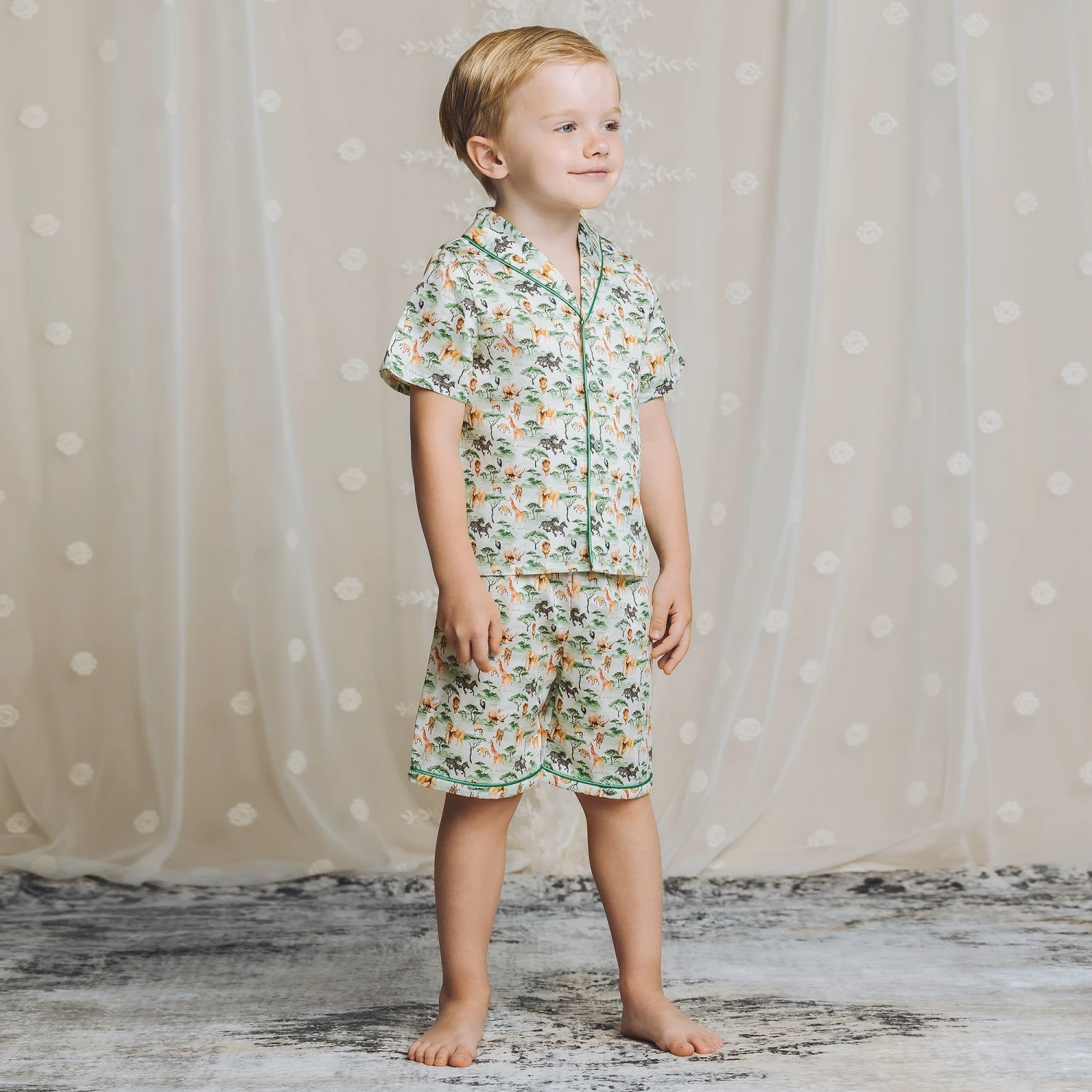 Fun green short pyjamas for boys by AMIKI Children, made in lightweight cotton. They have a jungle animal print, including elephants, lions, zebra and giraffe, with green satin piping. The top has a revere collar and front button fastenings, whilst the shorts have a comfortable, elasticated waistband.