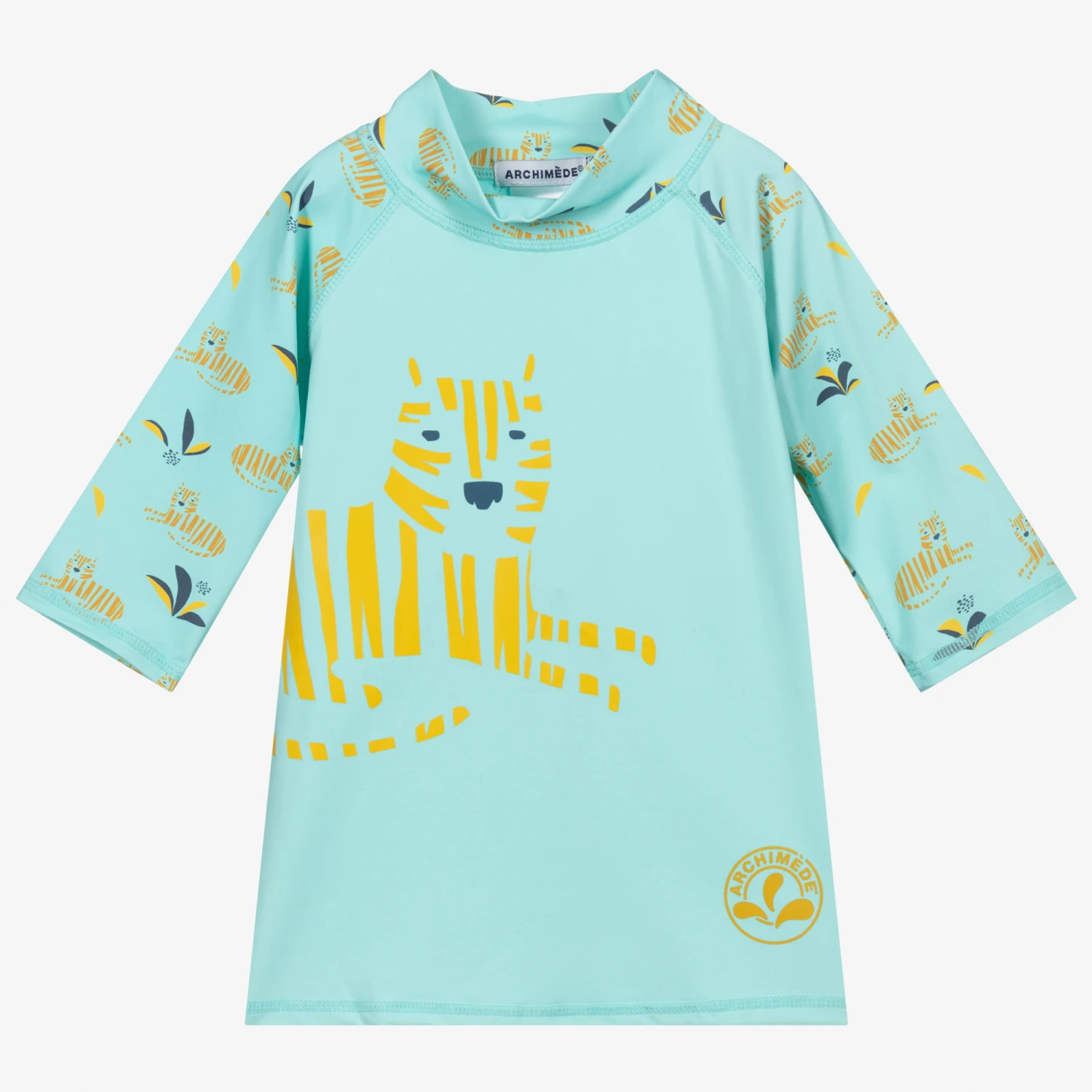 Little boys blue sun-protective top by Archimede, with SPF50+ and cute tiger print. This soft and stretchy top provides protection from the sun during water play and adventures and simply pulls on over-the-head.