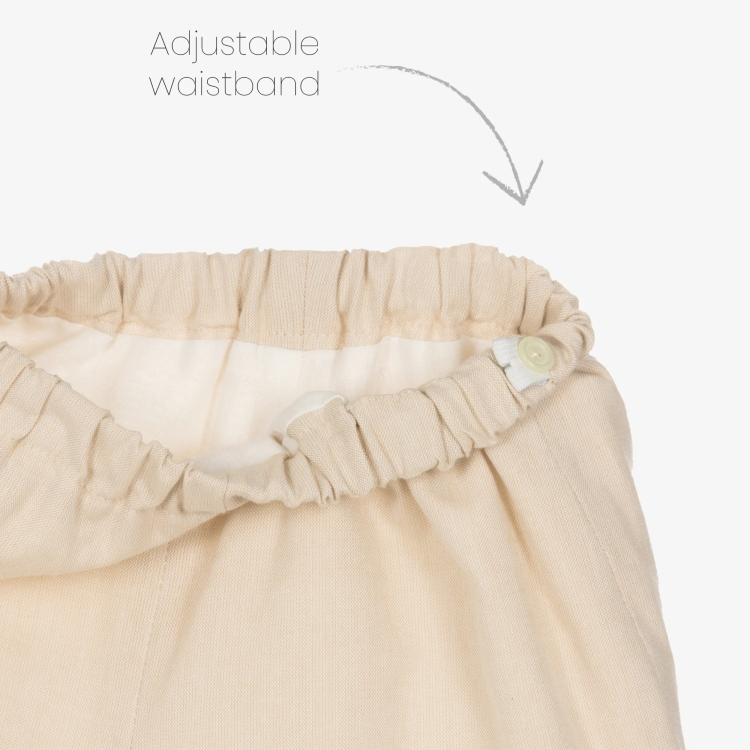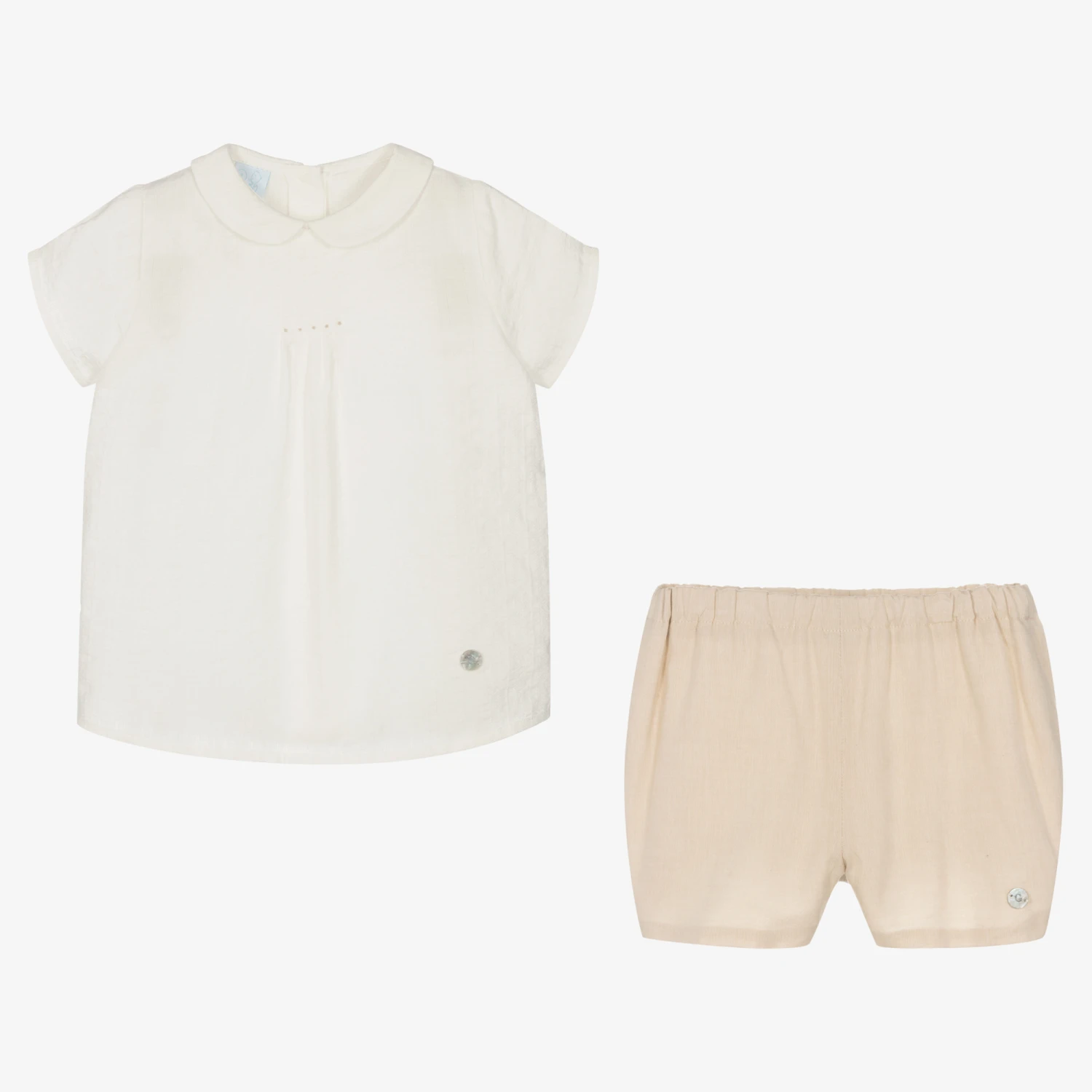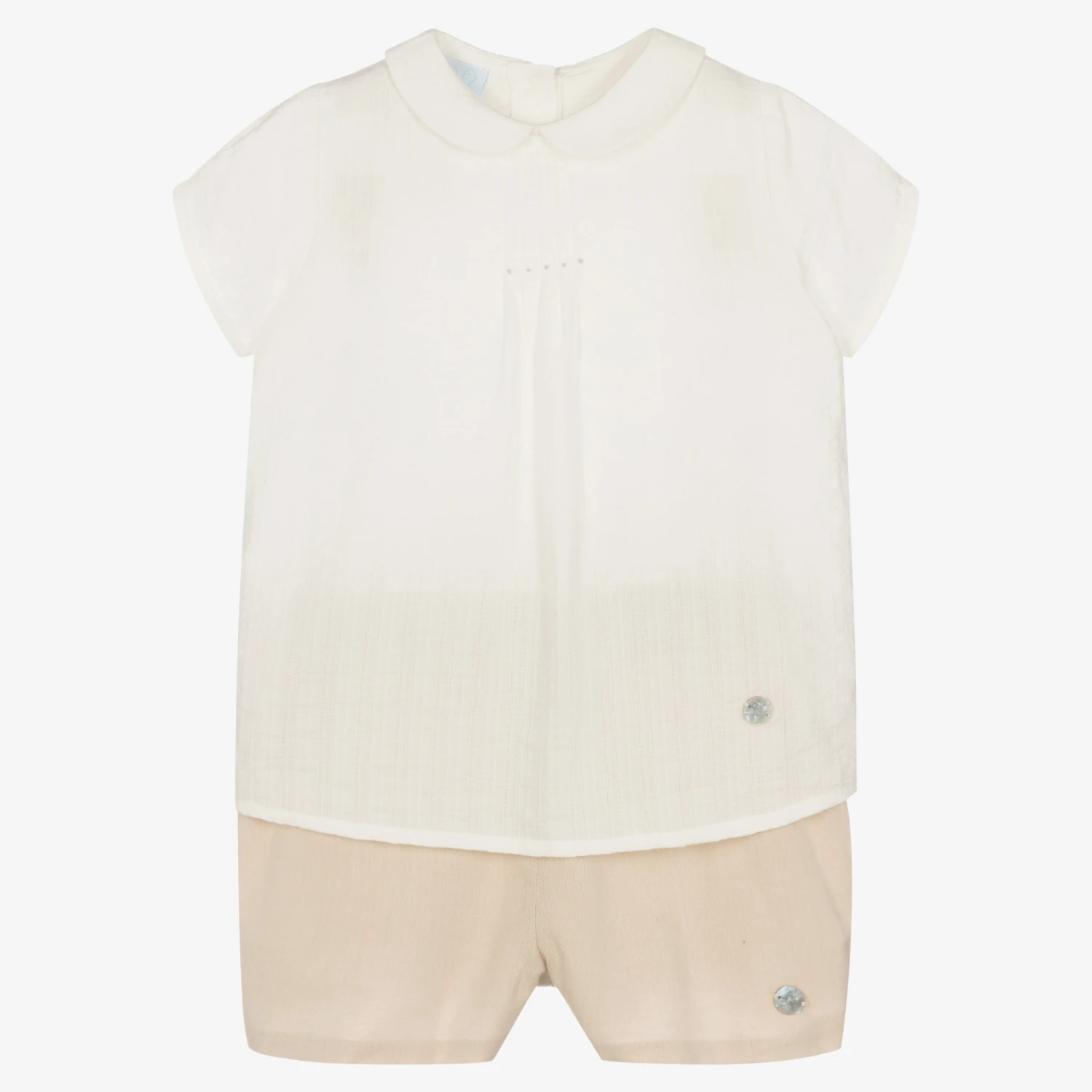 This traditional beige shorts set for little boys is made in a soft and breathable cotton, by Spanish brand Artesania Granlei. Patterned with subtle interwoven stripes, the ivory shirt has a Peter Pan collar, embroidered spots on the pintuck chest. There are useful button fastenings on the back. To complete this charming style, the shorts have adjustable waist to create the best fit.
