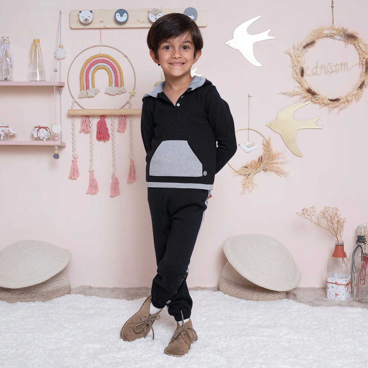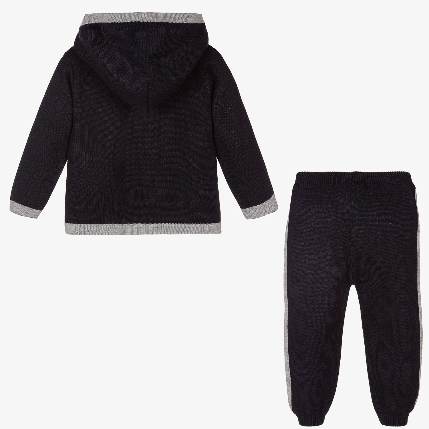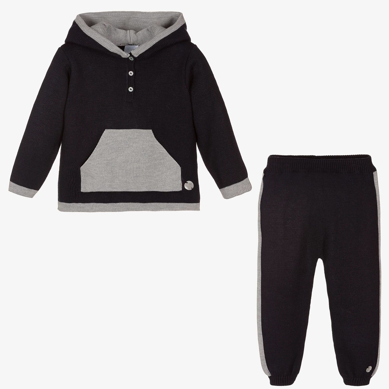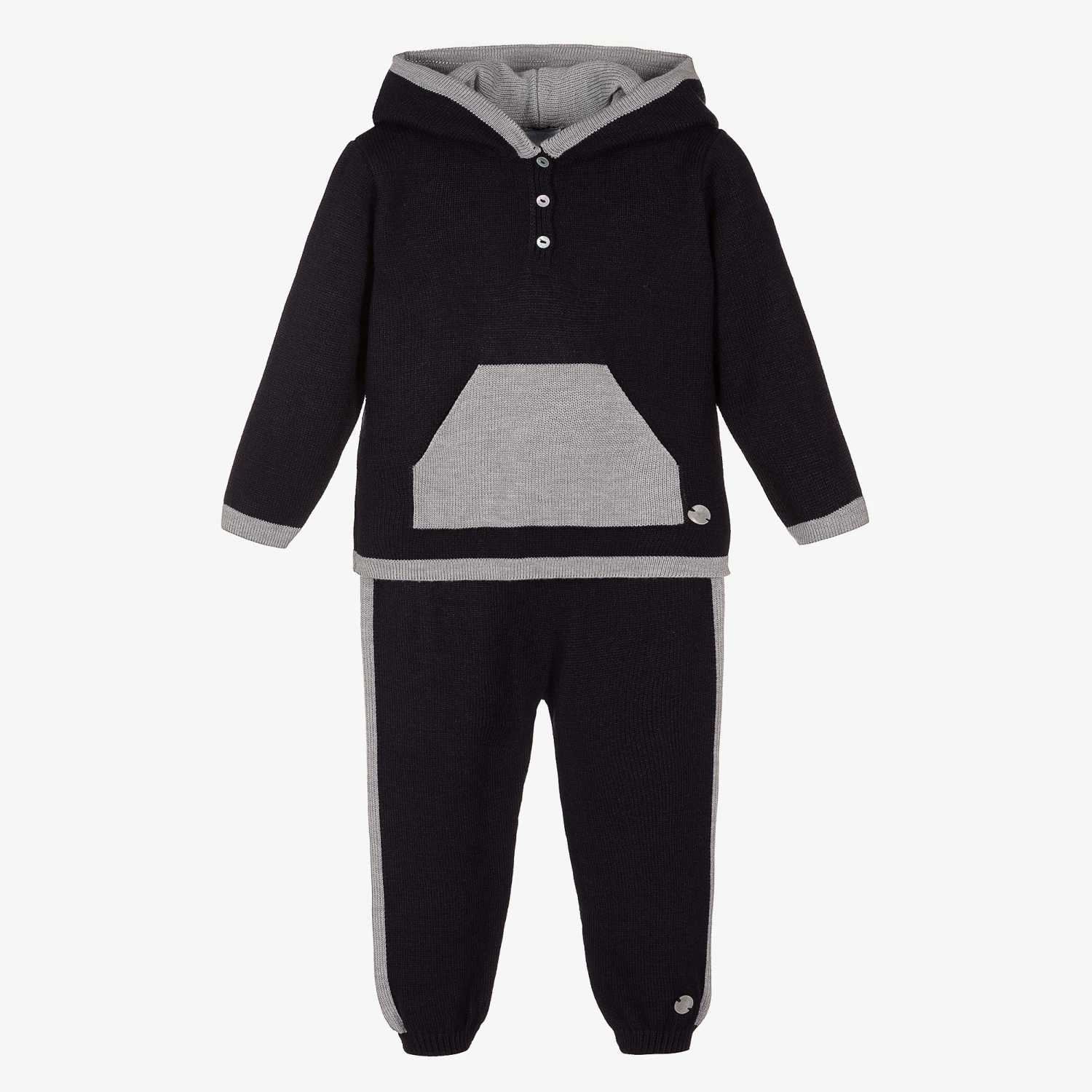 Cosy and comfortable navy blue tracksuit for boys by Artesania Granlei, knitted in soft acrylic. The hoodie has pearlized button fastenings on the front, with grey trims throughout, including the front pouch pocket. The matching bottoms have an elasticated adjustable waist for a good fit.