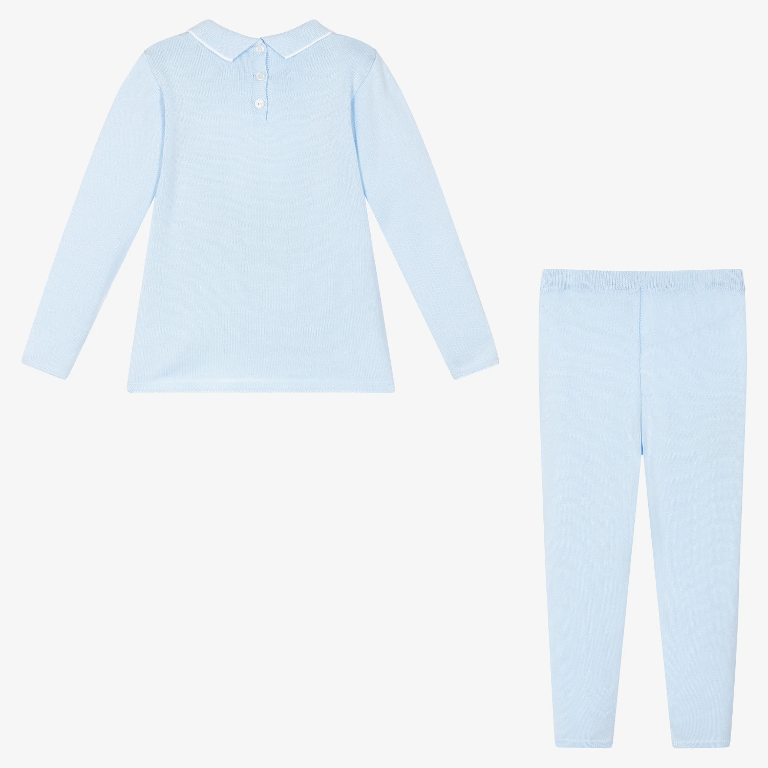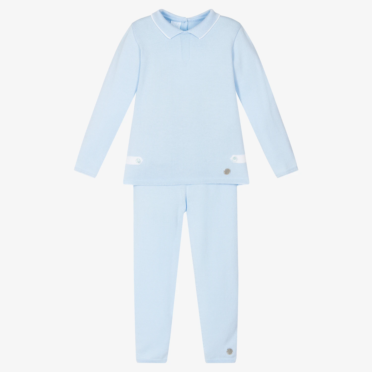 Pale blue top and trousers set for boys by Spanish brand Artesania Granlei. Finely knitted in a soft cotton blend, this classically styled outfit is easy and comfortable to wear. The top has a pointed collar trimmed in white, knitted button tabs at the sides, and back button fastenings. The trousers have a gently elasticated waist that is adjustable for a good fit.