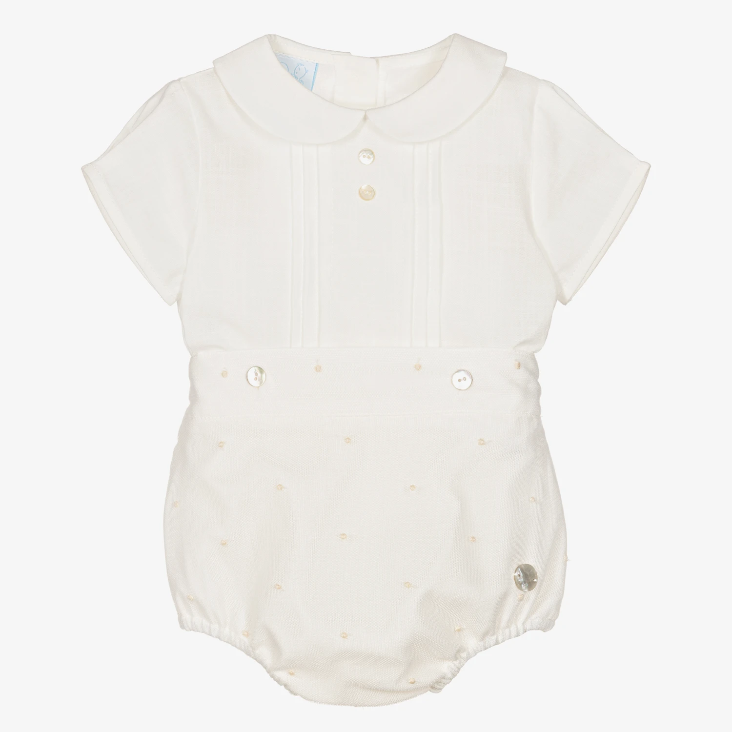 A handsome ivory buster suit for little boys by Spanish brand Artesania Granlei. The soft cotton voile shirt has a rounded collar, decorative mother-of-pearl buttons and a charming pleated chest. There are button fastenings on the back. Decorated in polka dot embroidery tulle, the shorts fasten onto the shirt with matching buttons for a traditional style.
