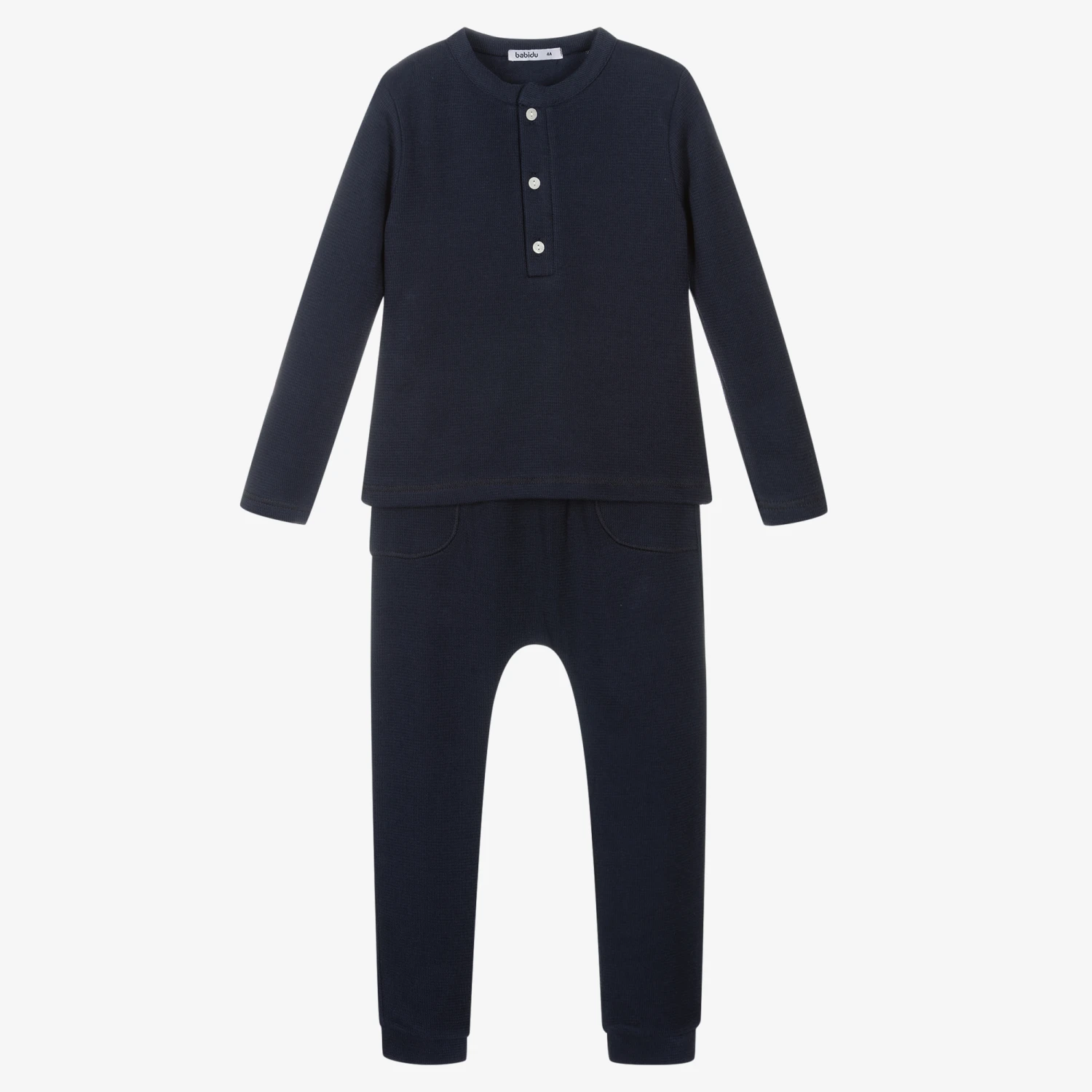 Navy blue tracksuit for boys by Babidu, made in softly ribbed cotton jersey. The top has front button fastenings and the trousers have an elasticated waist, with patch pockets on the front.