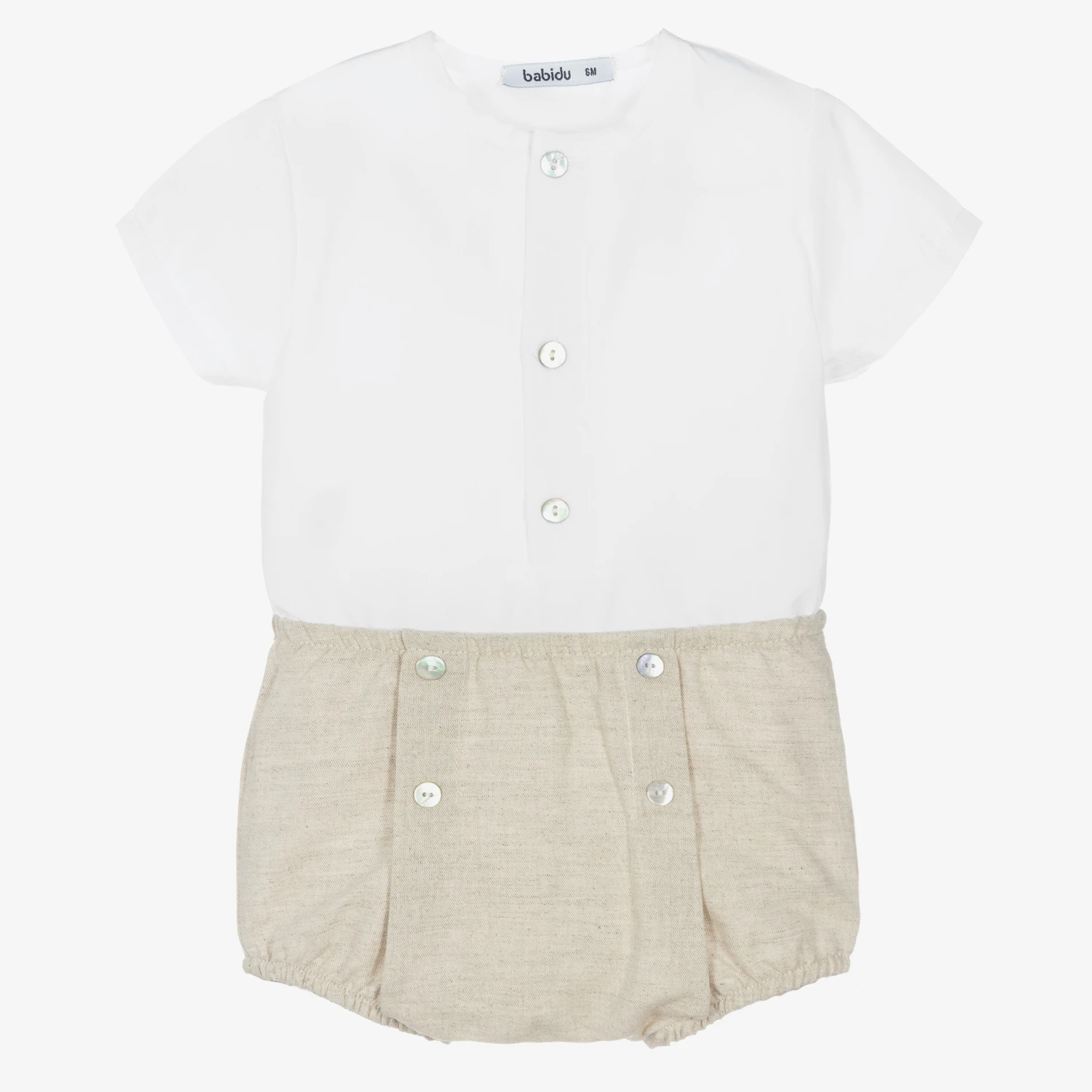 Classically styled white and beige shorts set for baby boys by Babidu, made in soft cotton. The lightweight shirt has a round neckline and traditional mother-of-pearl button fastenings on the front. The linen-feel shorts have pleats and decorative buttons on the front, and are comfortably elasticated around the waist and legs.