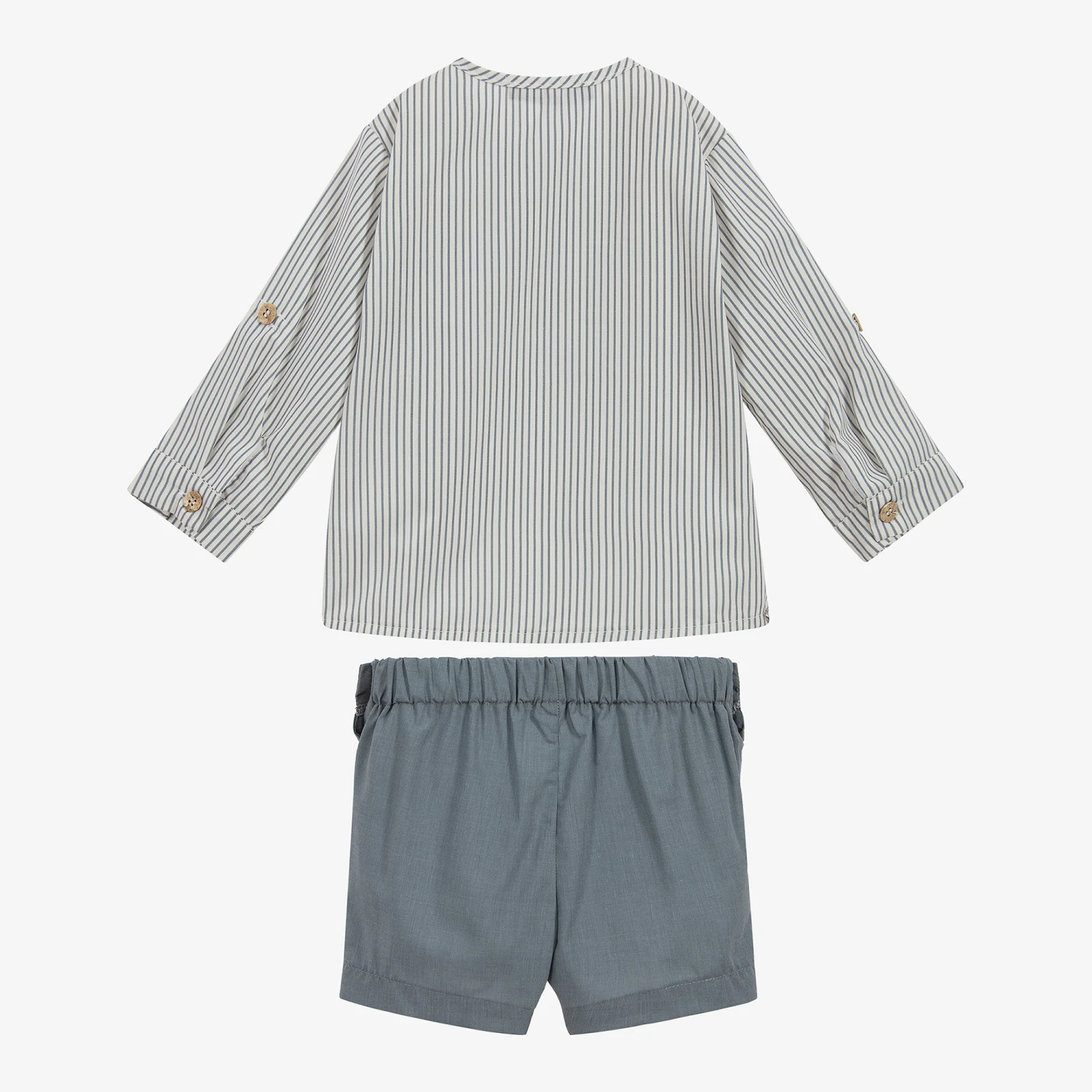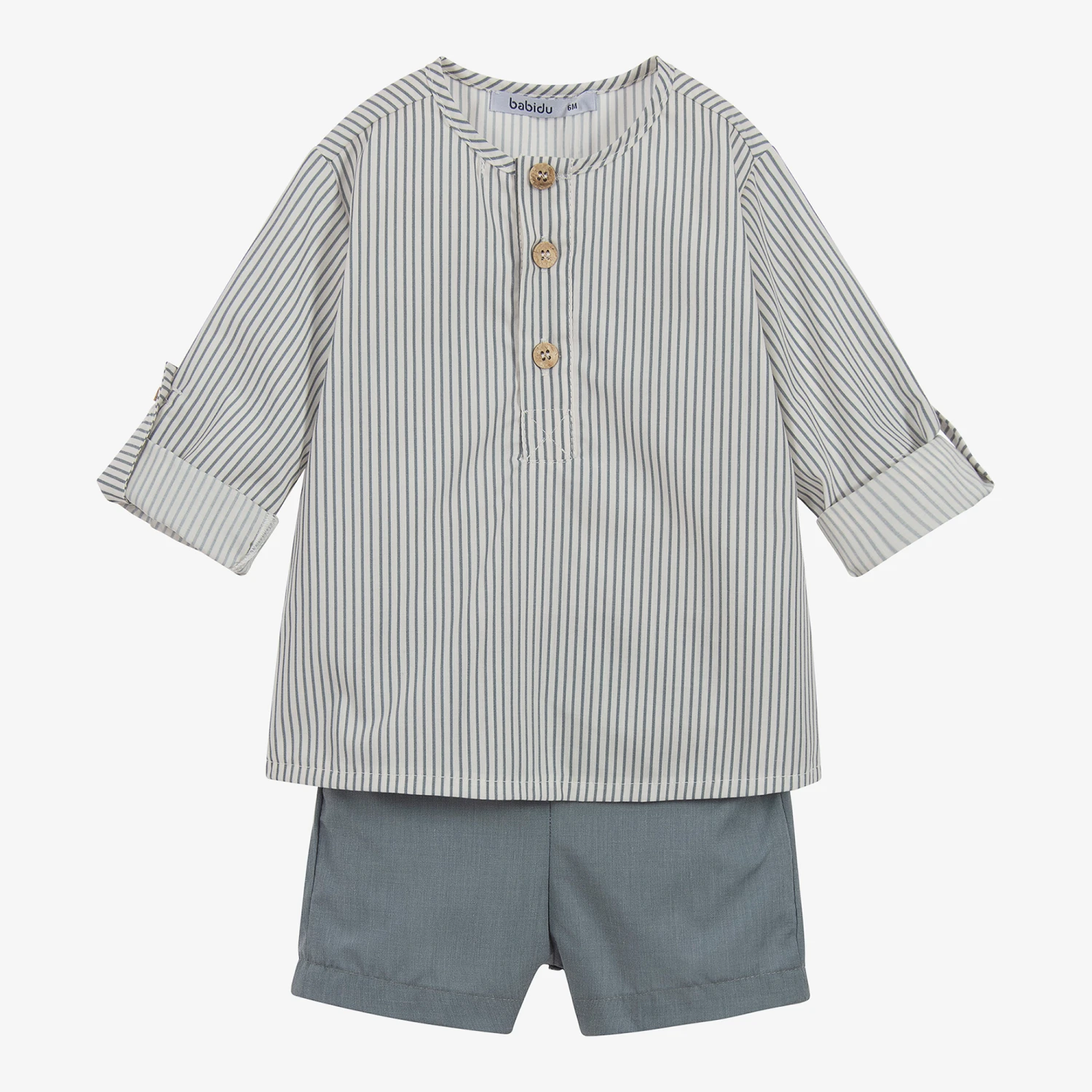 Boys grey and ivory shorts set from Babidu, made in a soft and lightweight polycotton. The striped shirt has front button fastening and the shorts fasten with buttons on the sides.