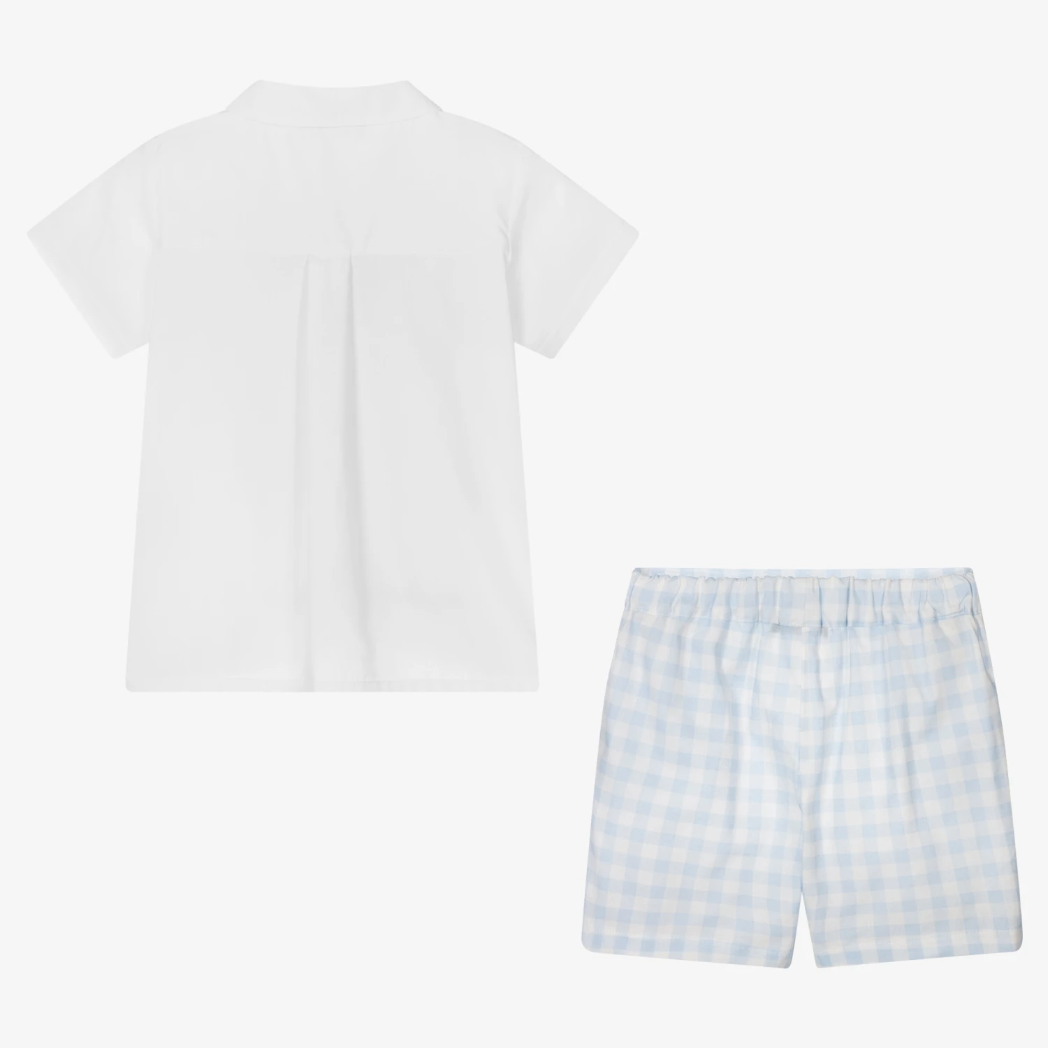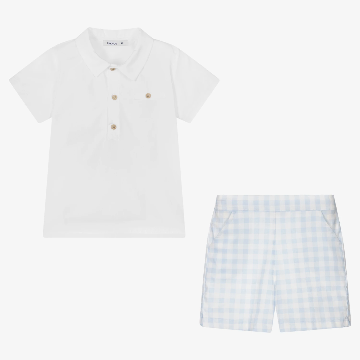 Smart-casual white and blue shorts set for boys by Babidu, made in lightweight cotton poplin. The white short sleeve shirt fastens with wooden buttons on the front and has a faux chest pocket for a traditional finish. The gingham checked shorts have an elasticated waist for a comfortable fit and easy dressing.