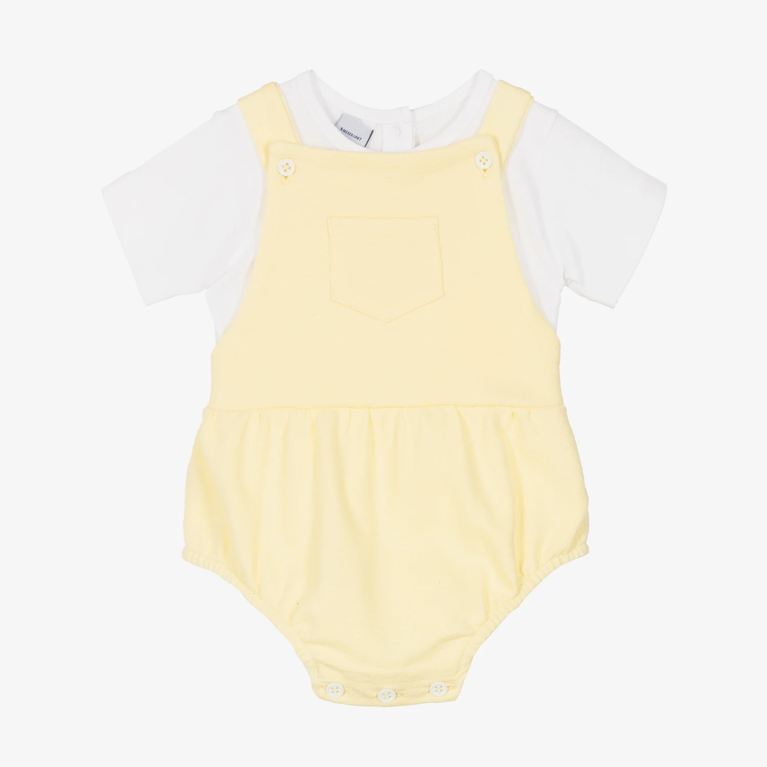Sweet white and yellow dungarees set for little boys, by Spanish brand Babidu. Made in soft cotton jersey, the white bodyvest has wooden faux buttons detailed on the front and useful poppers between the legs. It comes with a pastel yellow dungarees to layer over the top, with cute cross-over straps and a tiny bib pocket. The dungarees fastens with buttons between the legs.