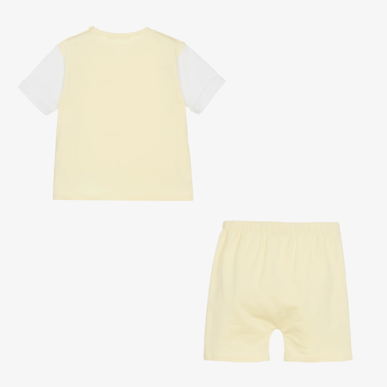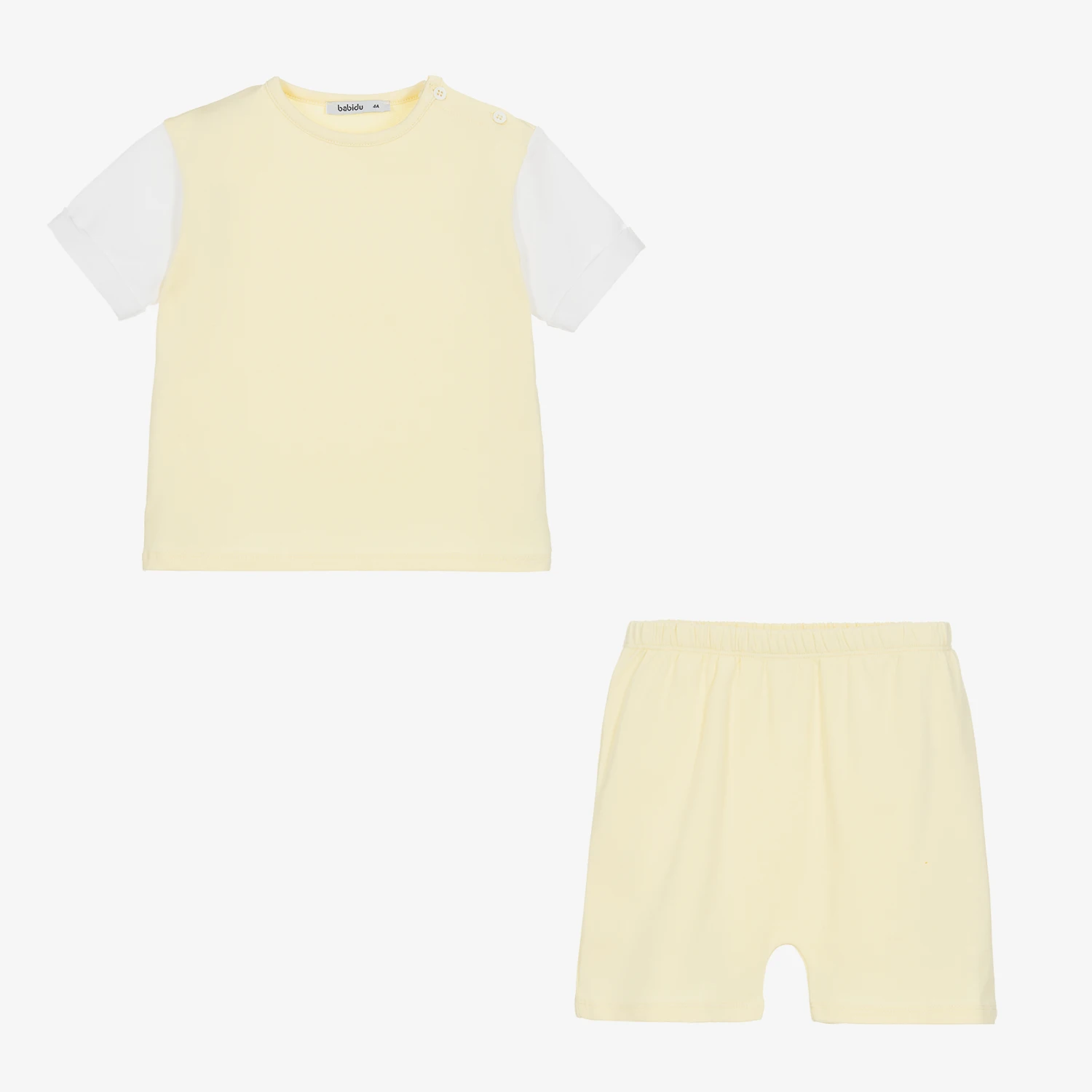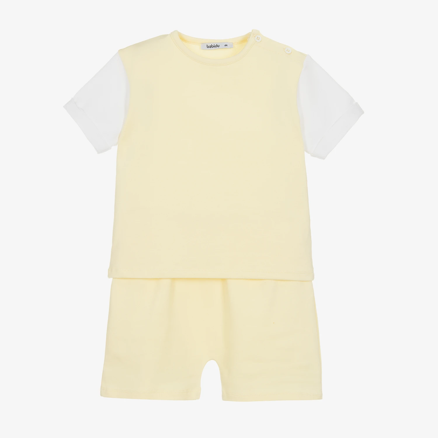 Pale yellow shorts set for boys by Babidu, made in soft and stretchy cotton jersey. Ideal for casual wear, the T-shirt has contrasting white short sleeves and button fastenings on one shoulder for a sweet finish. The matching shorts are easy to pull on with an elasticated waist which also ensure a comfortable fit.