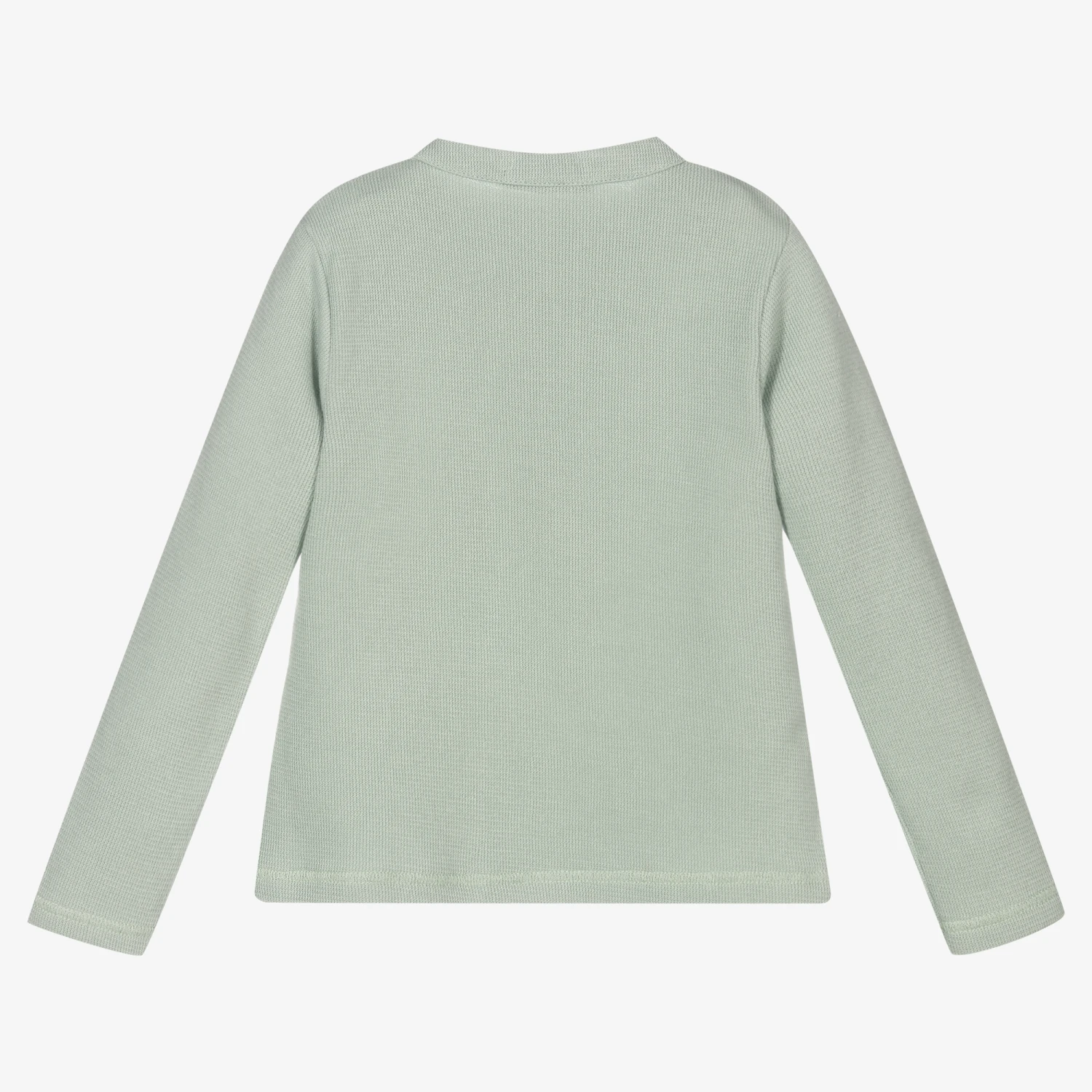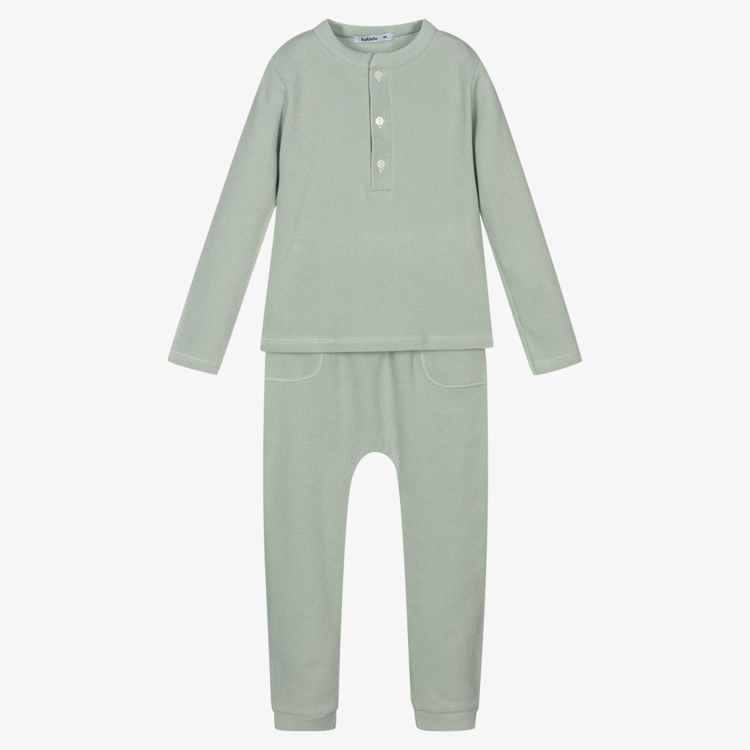 Pale green tracksuit for boys by Babidu, made in softly ribbed cotton jersey. The top has front button fastenings and the trousers have an elasticated waist, with patch pockets on the front.