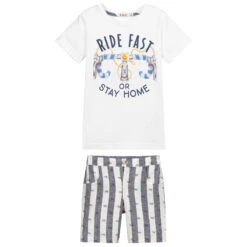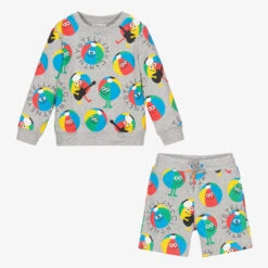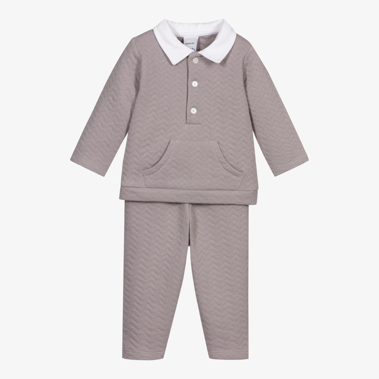 Little boys grey soft cotton jersey trousers set by Babidu, with a quilted herringbone design. The rugby style top has a white collar, button fastenings and a front pouch pocket. The matching bottoms have a comfortable elasticated waist.