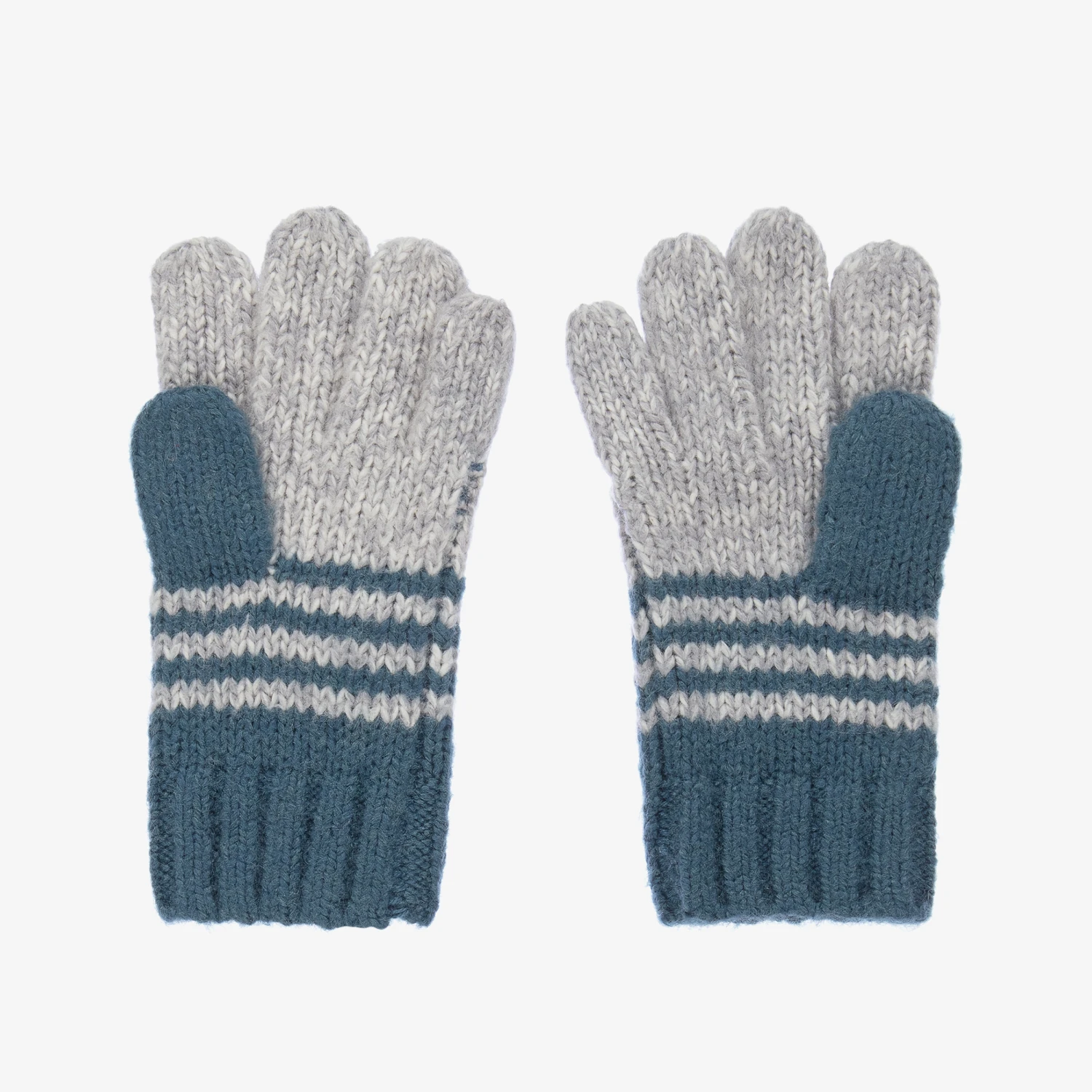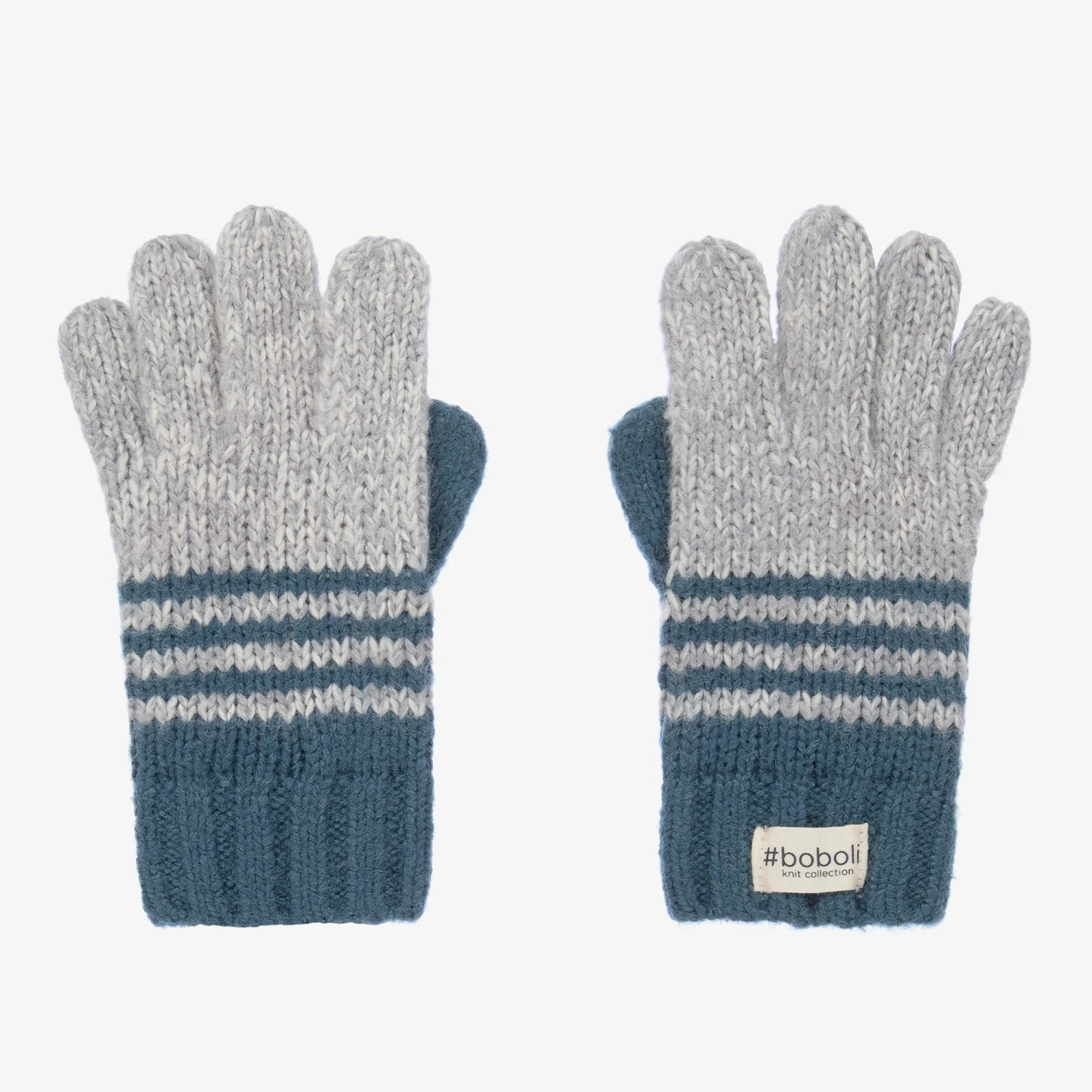 Boys and girls grey and blue striped gloves from Boboli, knitted in a mid-weight cotton blend. Soft and stretchy, they have the designer’s logo tab sewn onto the ribbed cuffs.