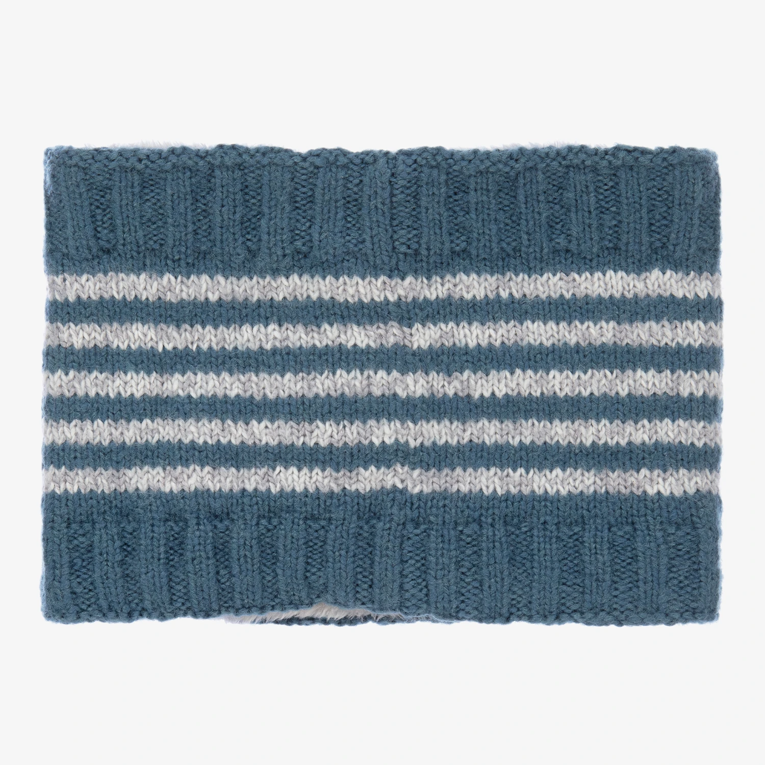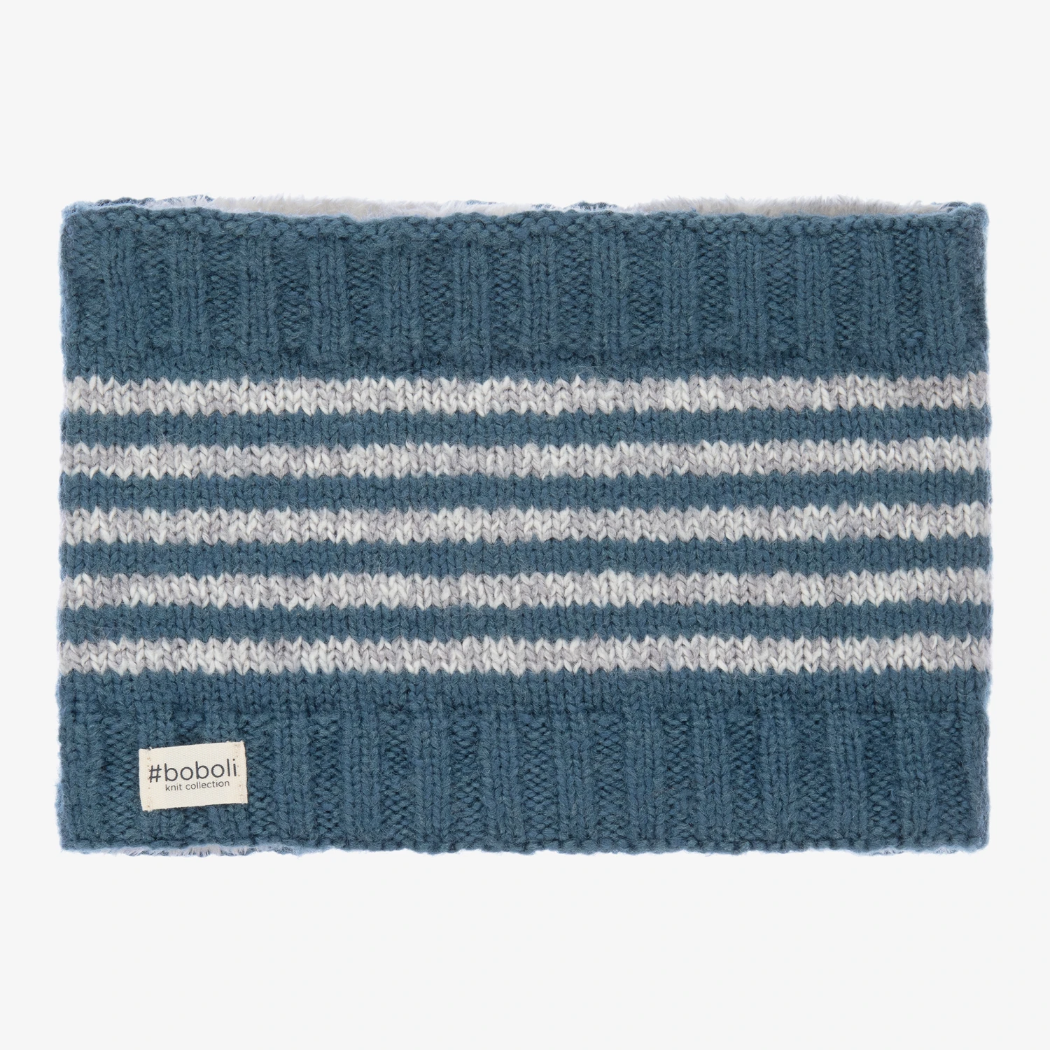 Mid-blue knitted snood scarf for boys and girls by Boboli, knitted in a soft cotton and mohair blend. It is striped in light grey and lined in a soft faux fur for warmth. The brand’s logo patch can be found on the front.