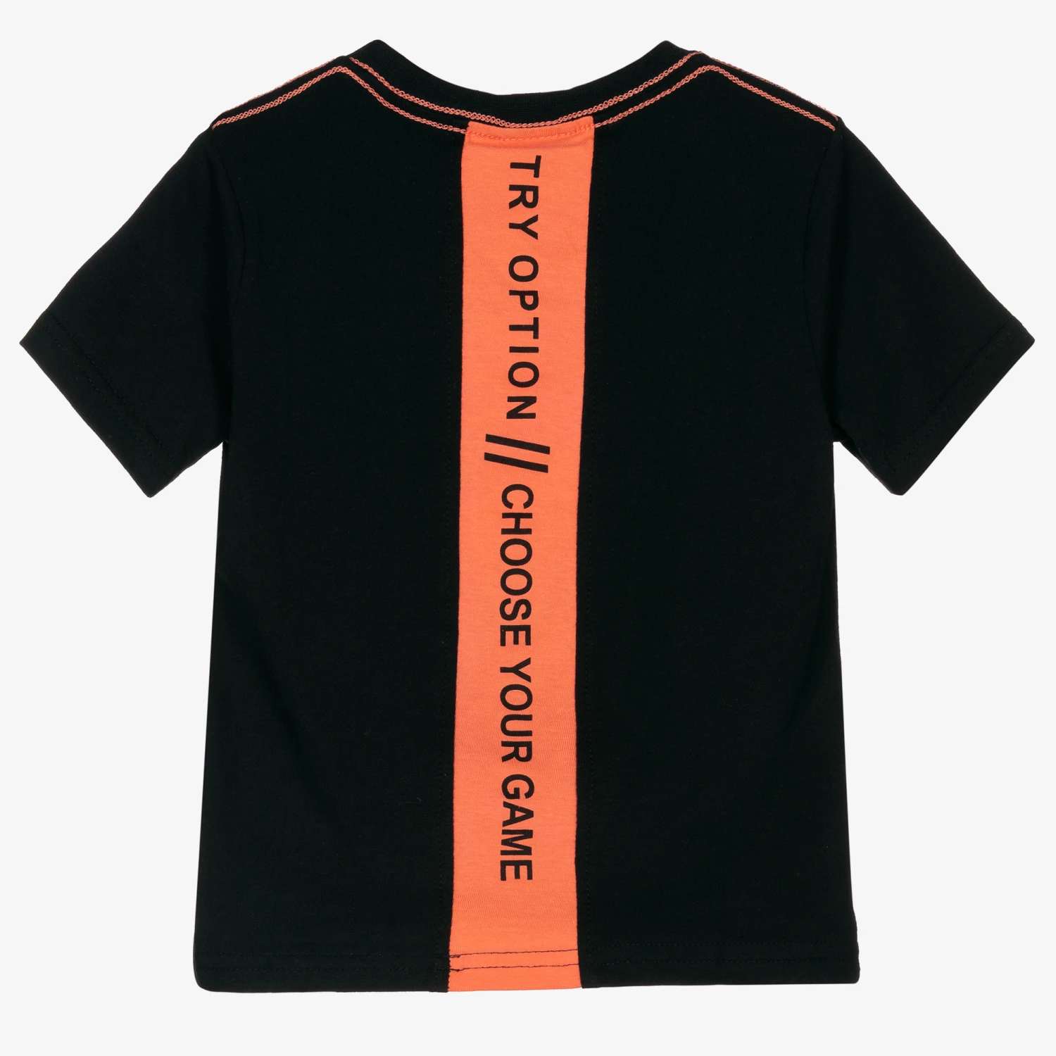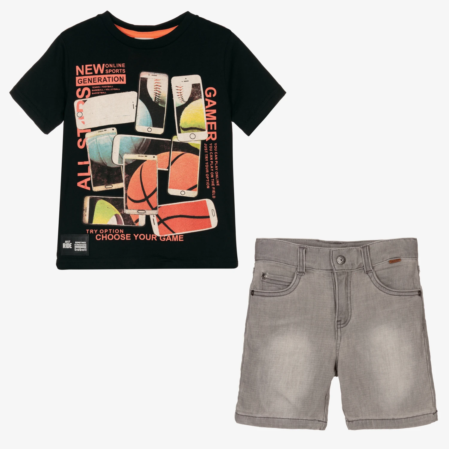 Black T-shirt and grey shorts set for boys by Boboli. The black cotton jersey T-shirt has a colourful phone and ball graphic with orange printed slogans. It has a rubberised logo patch on the front hem and an orange slogan stripe down the back. The grey jersey denim shorts have five pockets, branded tabs on the front and back, and an adjustable waistband.