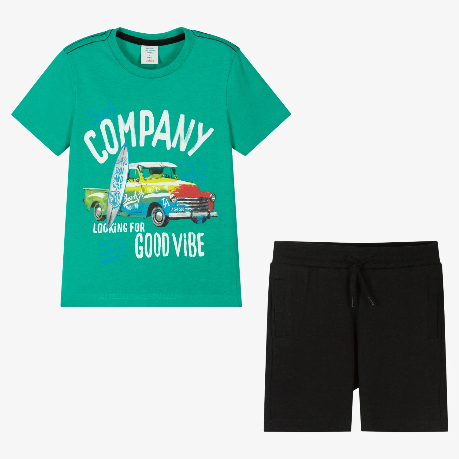 Casual cotton shorts set for boys by Spanish brand Boboli, just right for relaxed days in the sunshine. Made in comfortable jersey, the green T-shirt has a colourful surf boarding print on the front. The navy blue jersey shorts have a drawstring waistband for a good fit and useful, front pockets. Both pieces have a logo badge around the back.