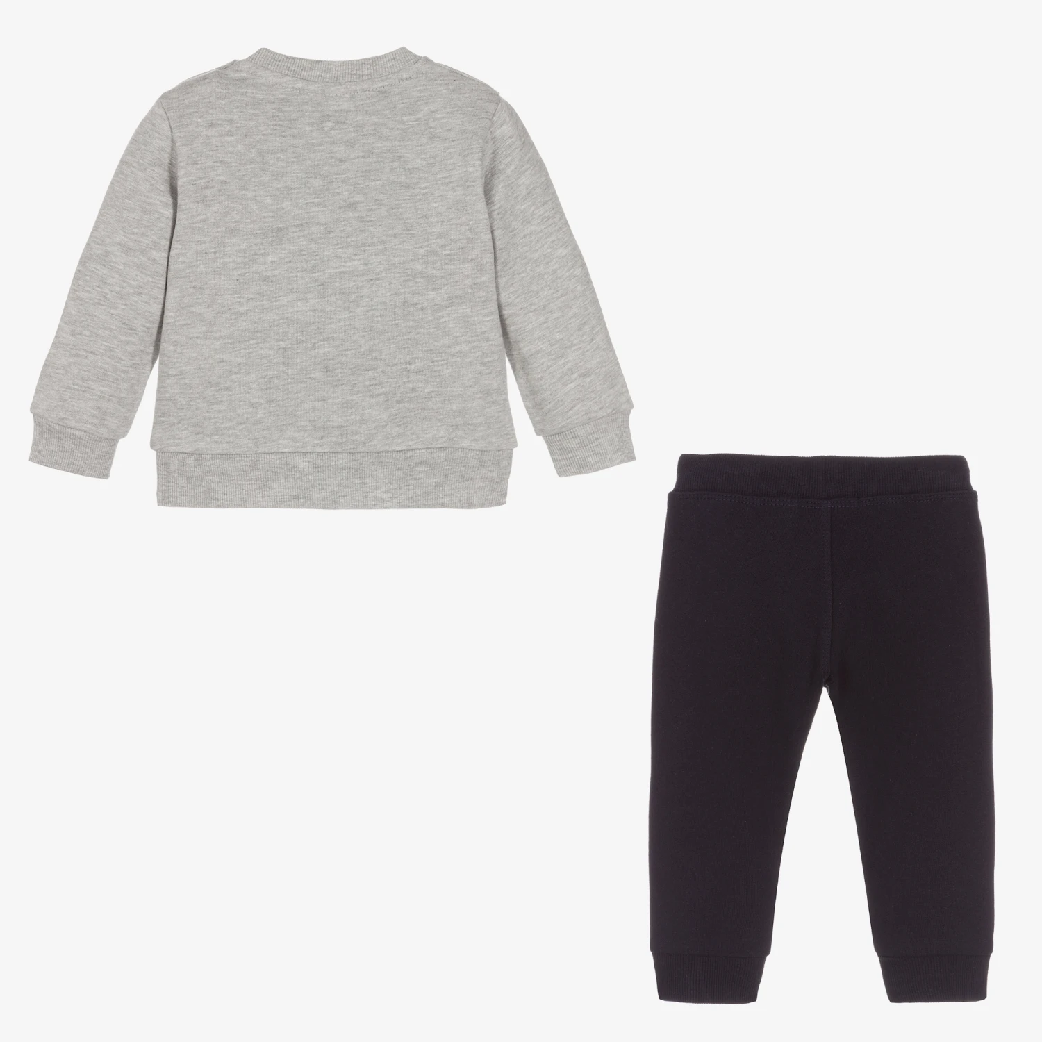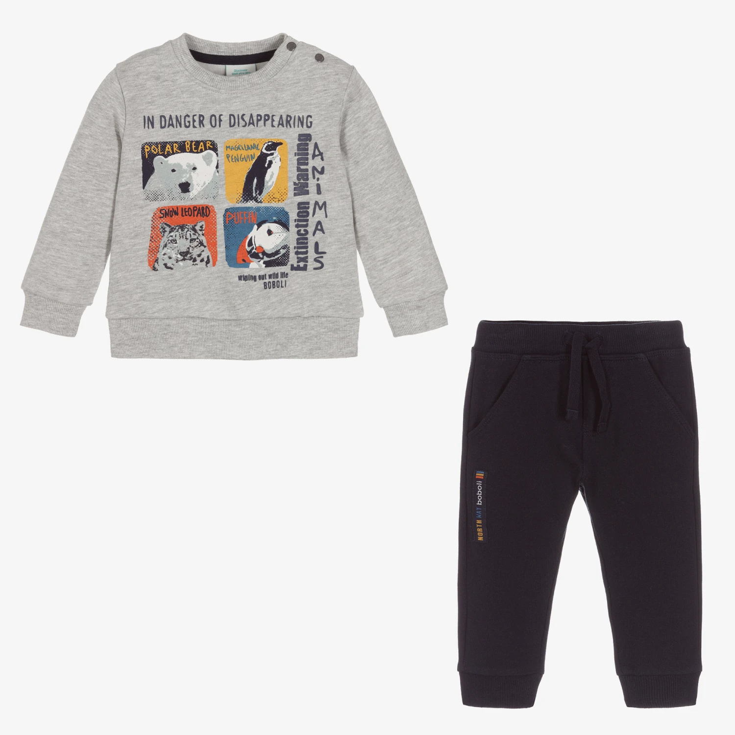 Blue and grey marl tracksuit for boys by Spanish brand Boboli, made in soft and comfortable cotton jersey. The sweatshirt has a colourful wildlife themed print on the front, with poppers on the shoulder for easy dressing on smaller sizes. The joggers have an elasticated drawstring waist and useful front pockets, with a logo label on one leg.