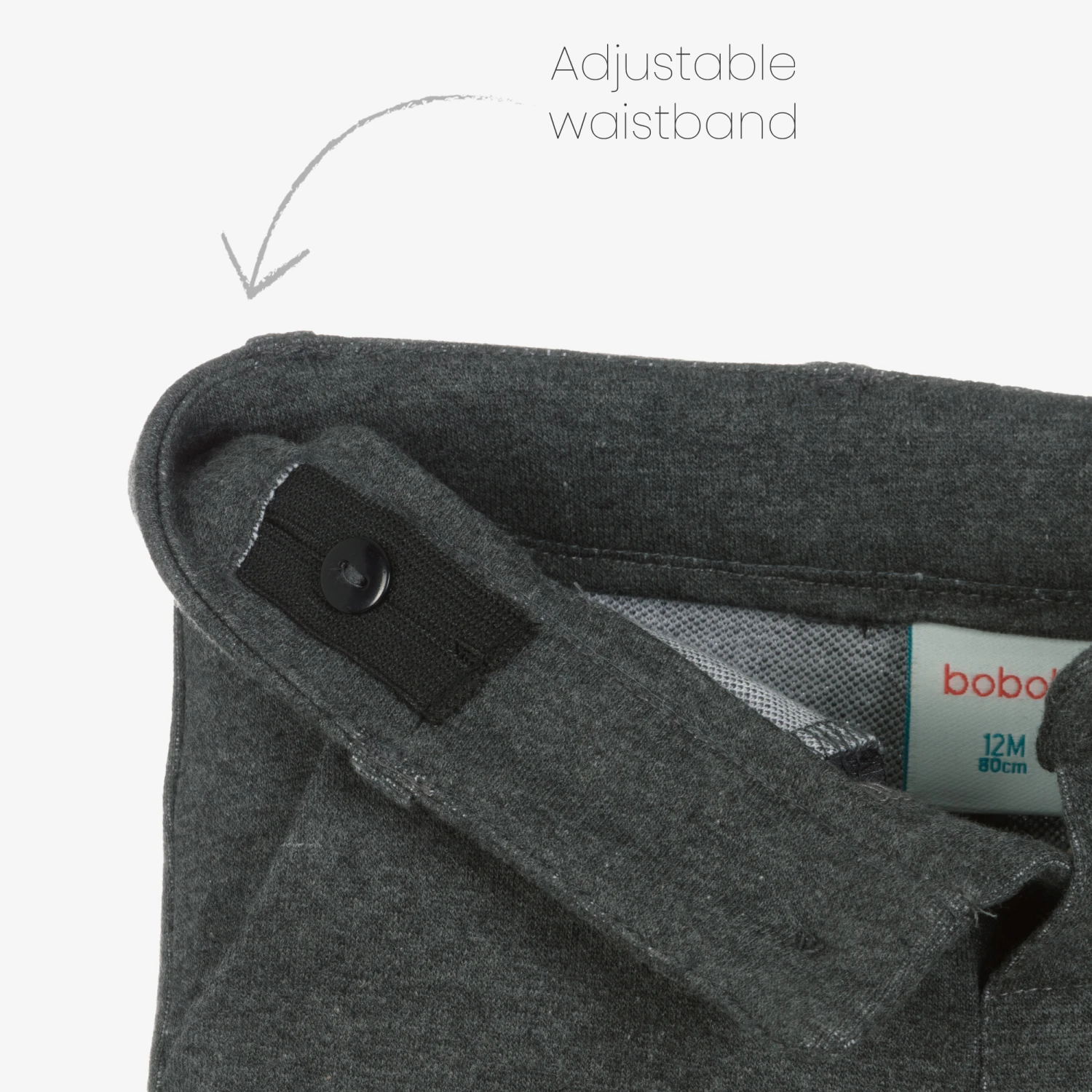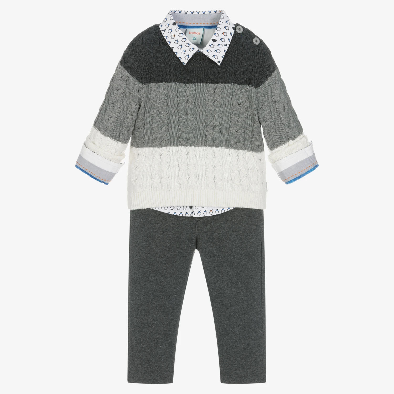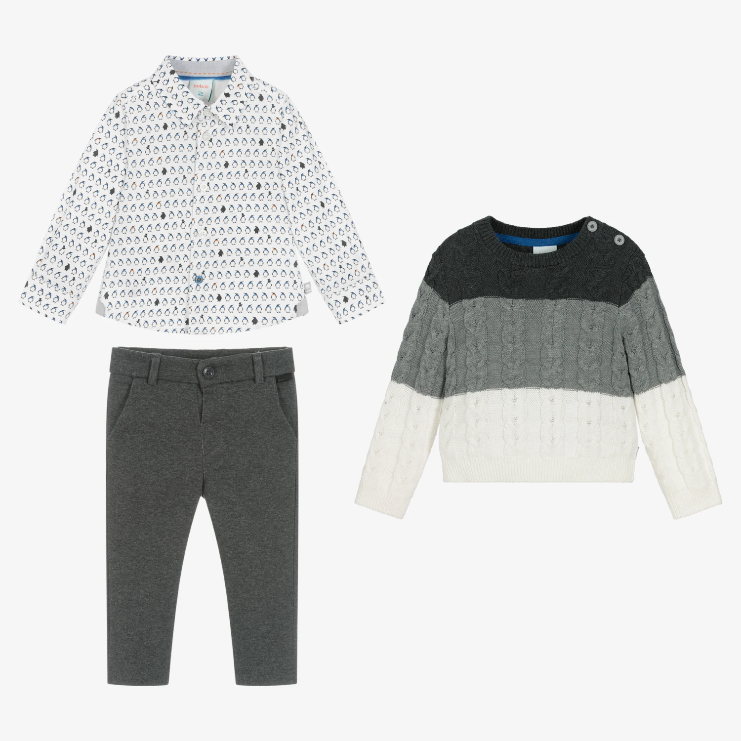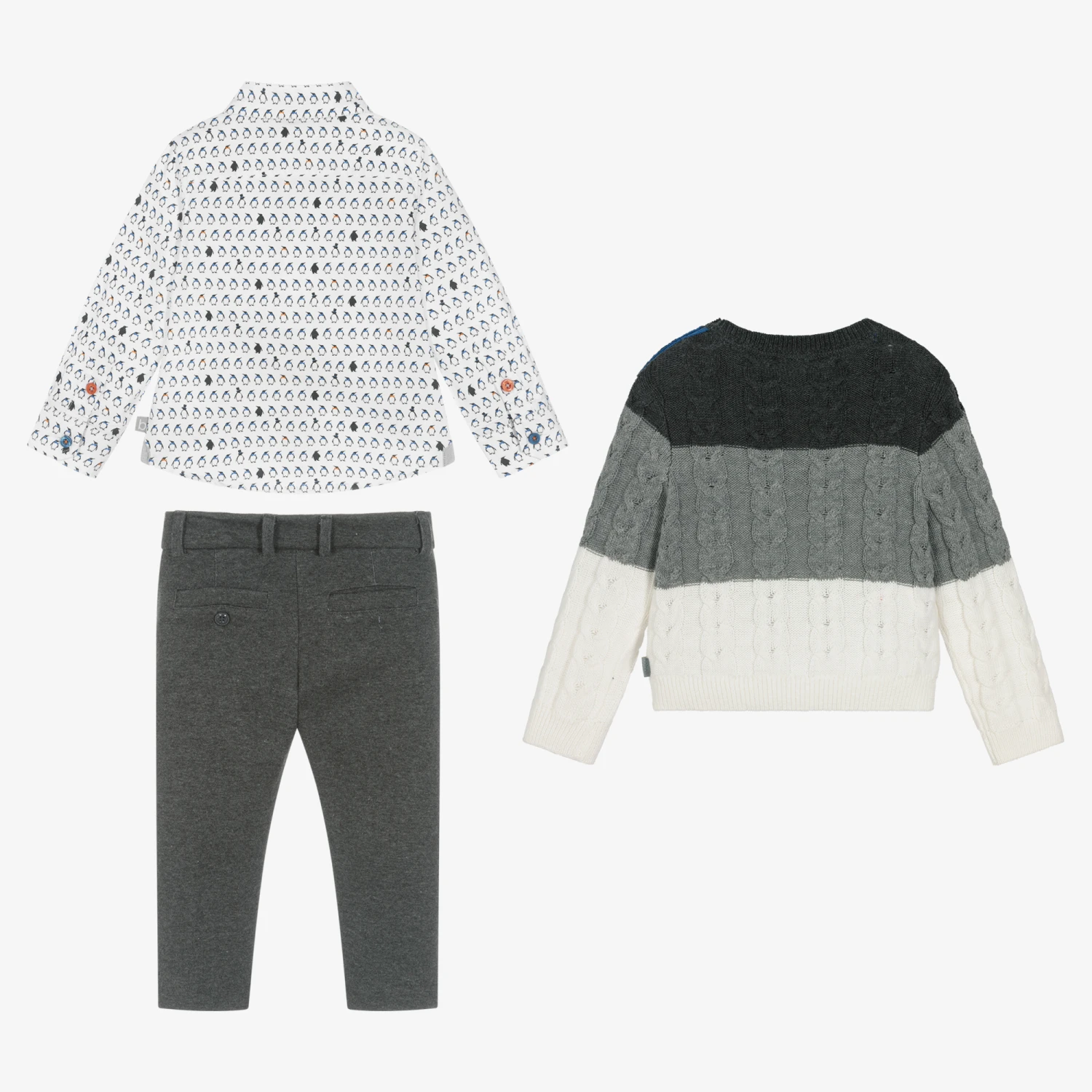 Smart-casual three-piece trouser set for boys by Spanish brand Boboli. Knitted in soft cotton, the grey and white sweater is in a lovely cable stitch. The white cotton shirt is patterned in blue and black penguins and has multicolour button fastenings. The grey jersey trousers have front and back pockets, with an adjustable waist for a comfortable fit.
