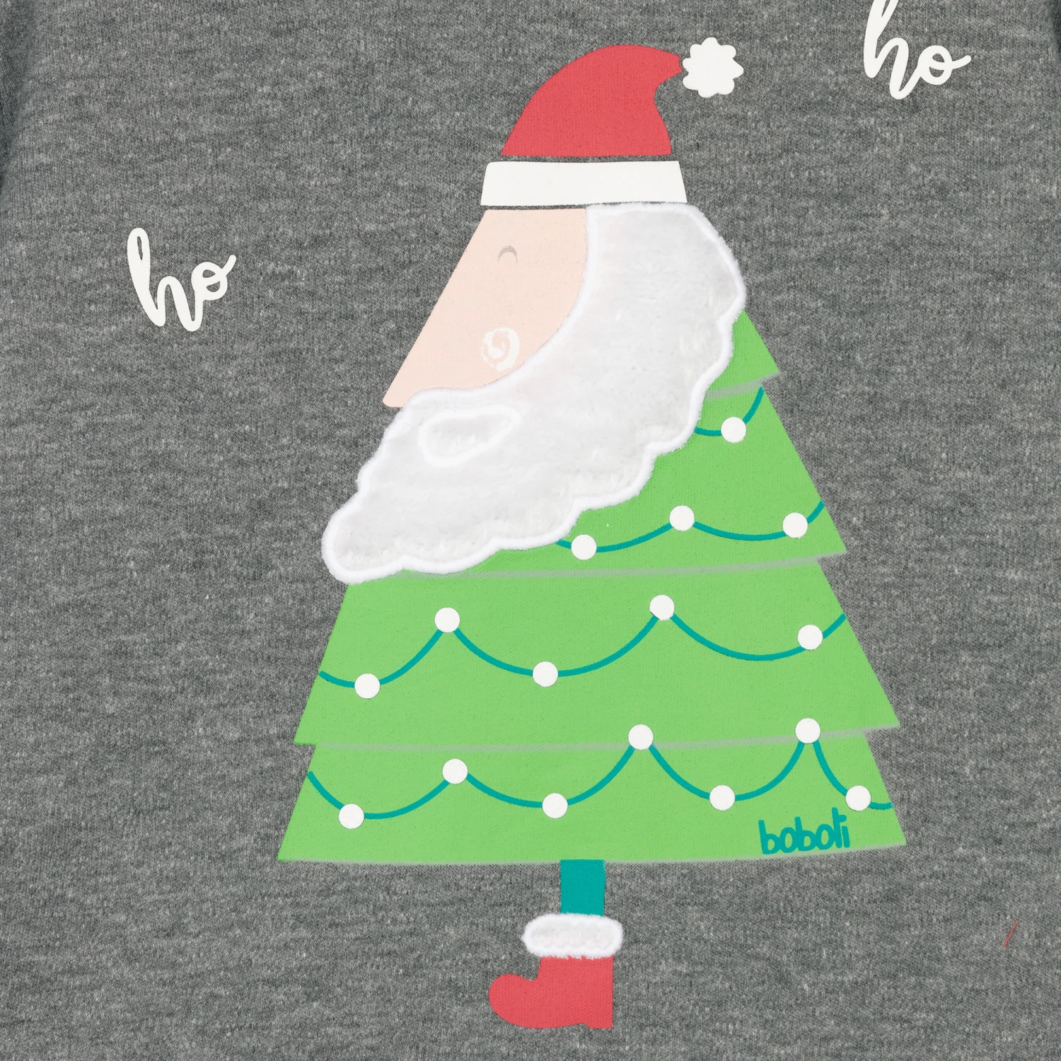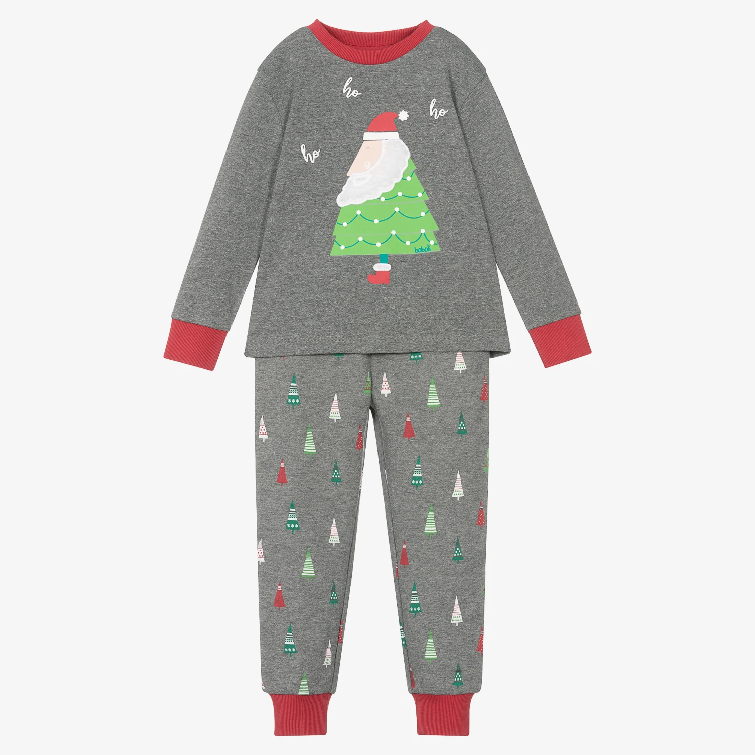 Grey marl pyjamas for boys and girls by Boboli, made in soft and comfortable cotton jersey with red trim. The front of the top has a fun Father Christmas tree print and the bottoms are patterned with Christmas trees. There is a comfortable elasticated, drawstring waistband and the ribbed cuffs on the legs help keep warmth in.