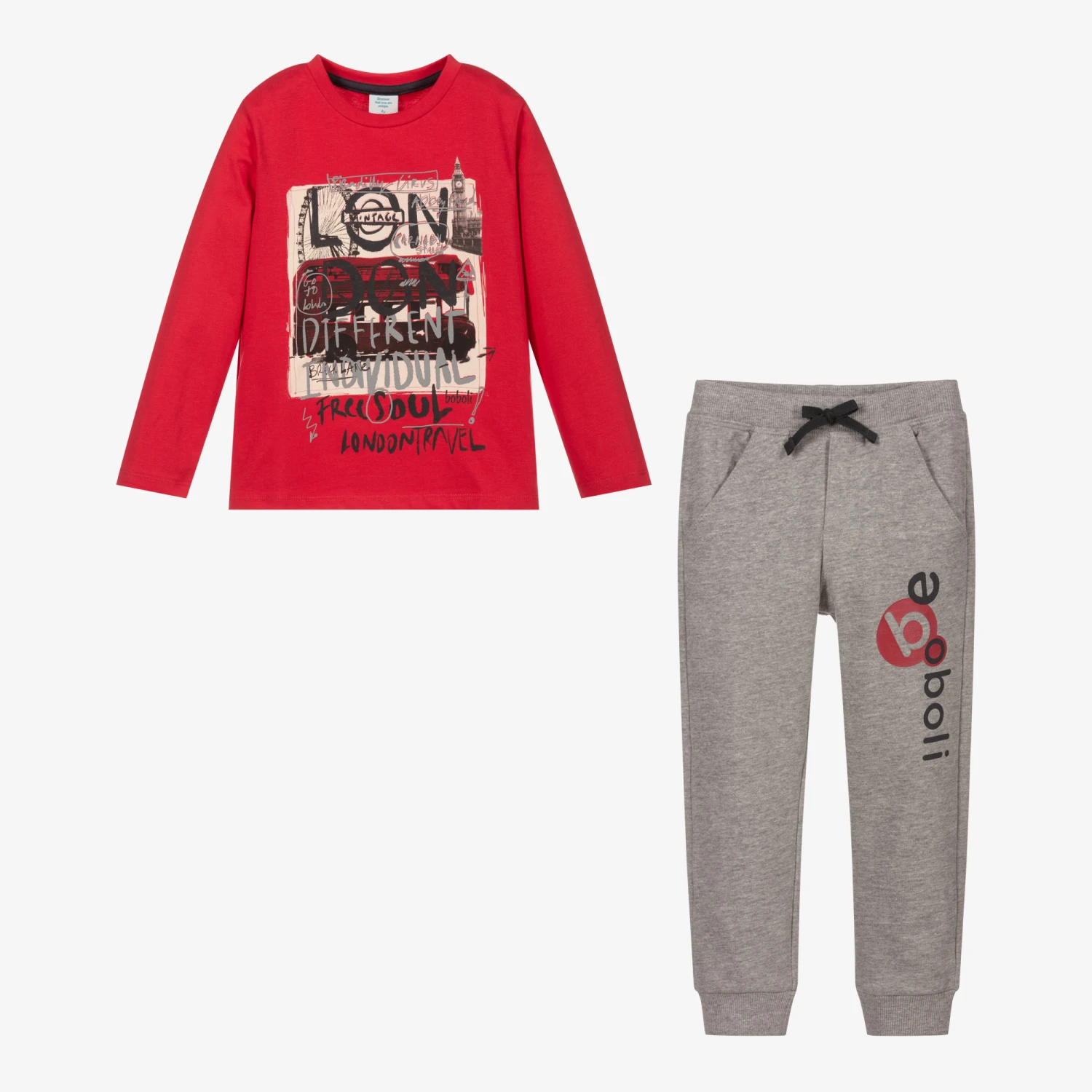 Boys red and grey joggers set from Boboli. The red cotton jersey top has a black, grey and ivory London print on the front. The grey joggers are made in mid-weight jersey, with a fleecy feel inside and a drawstring waistband. They have front pockets and a bold red and grey logo print on one leg.