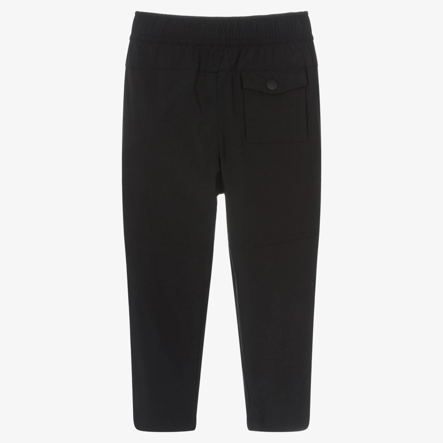 Black cargo trousers for boys by BOSS, made in a lightweight, matte fabric. Great for outdoors, these versatile trousers have flap pockets on the knees, a single pocket on the back, and hidden side seam pockets on the hips. They have an elasticated waistband, paired with a button and zip fastening for a great fit. Tonal logo detailing on the leg lends a subtle signature touch.