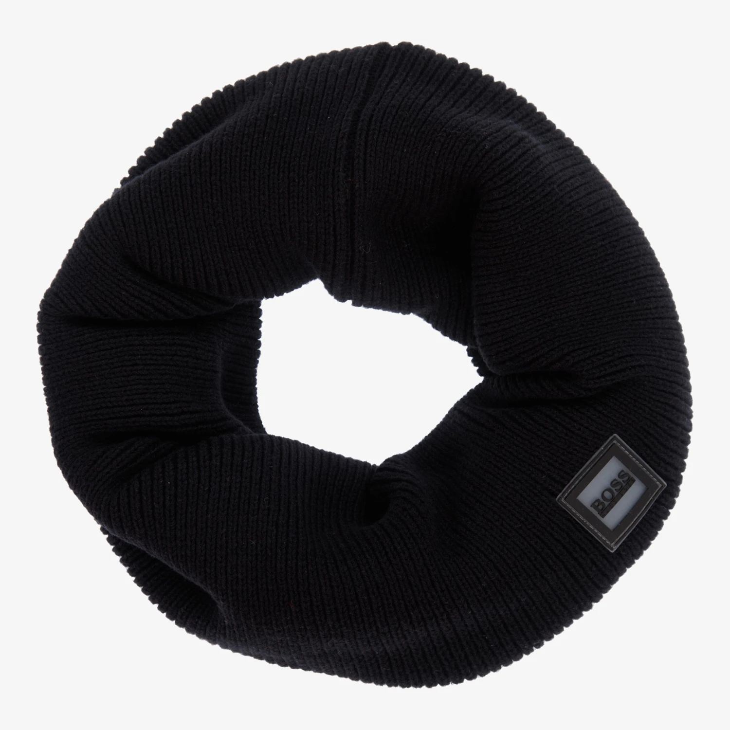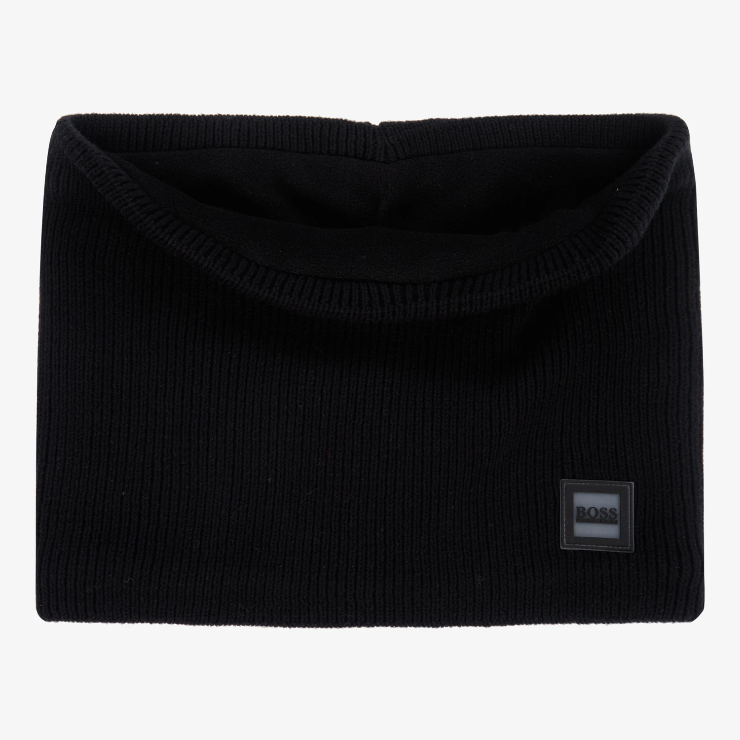 Black snood for boys by BOSS Kidswear, with a black rubber logo patch on the front. It is knitted in soft cotton and has a warm fleecy lining.