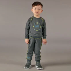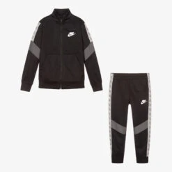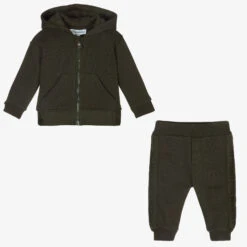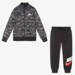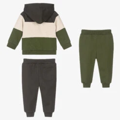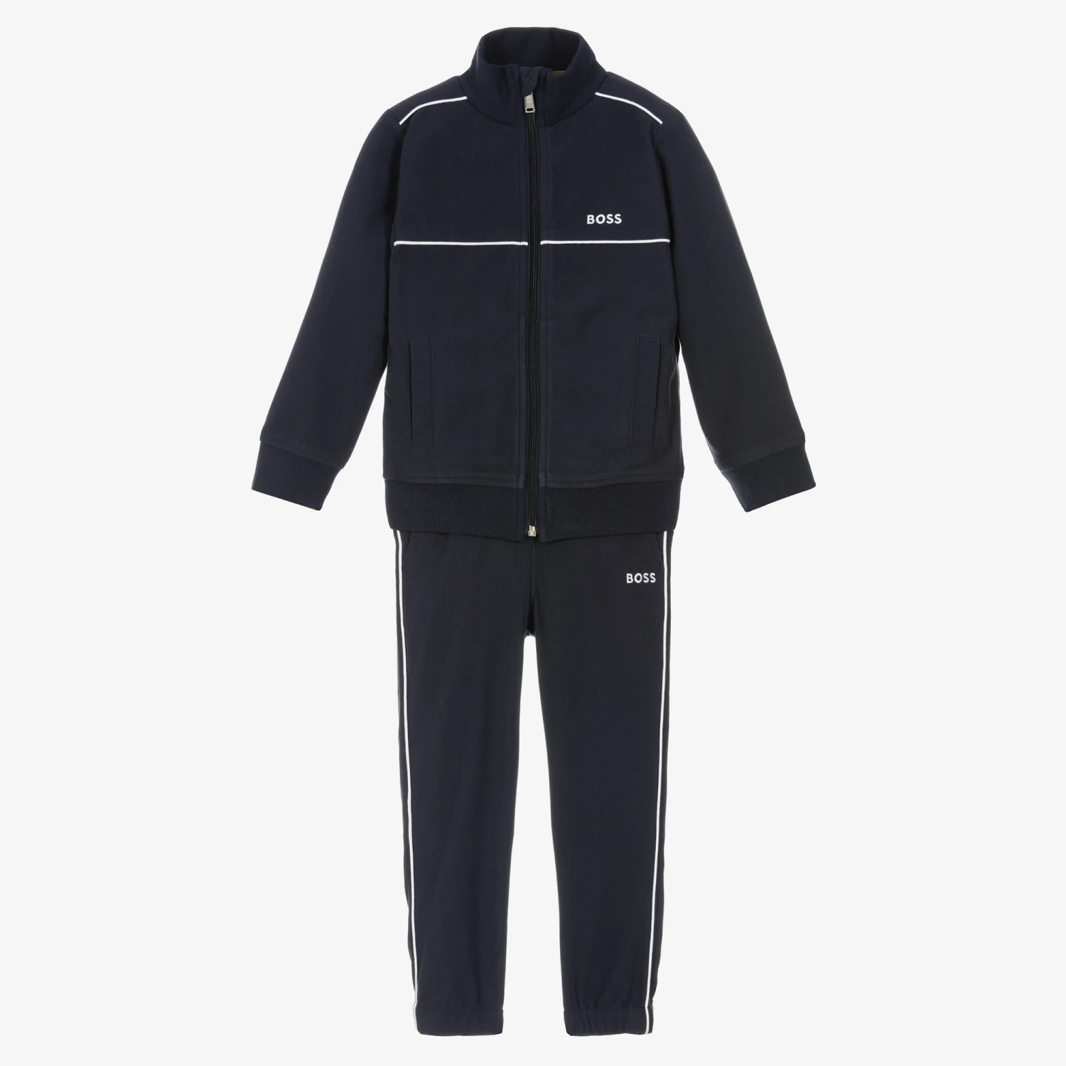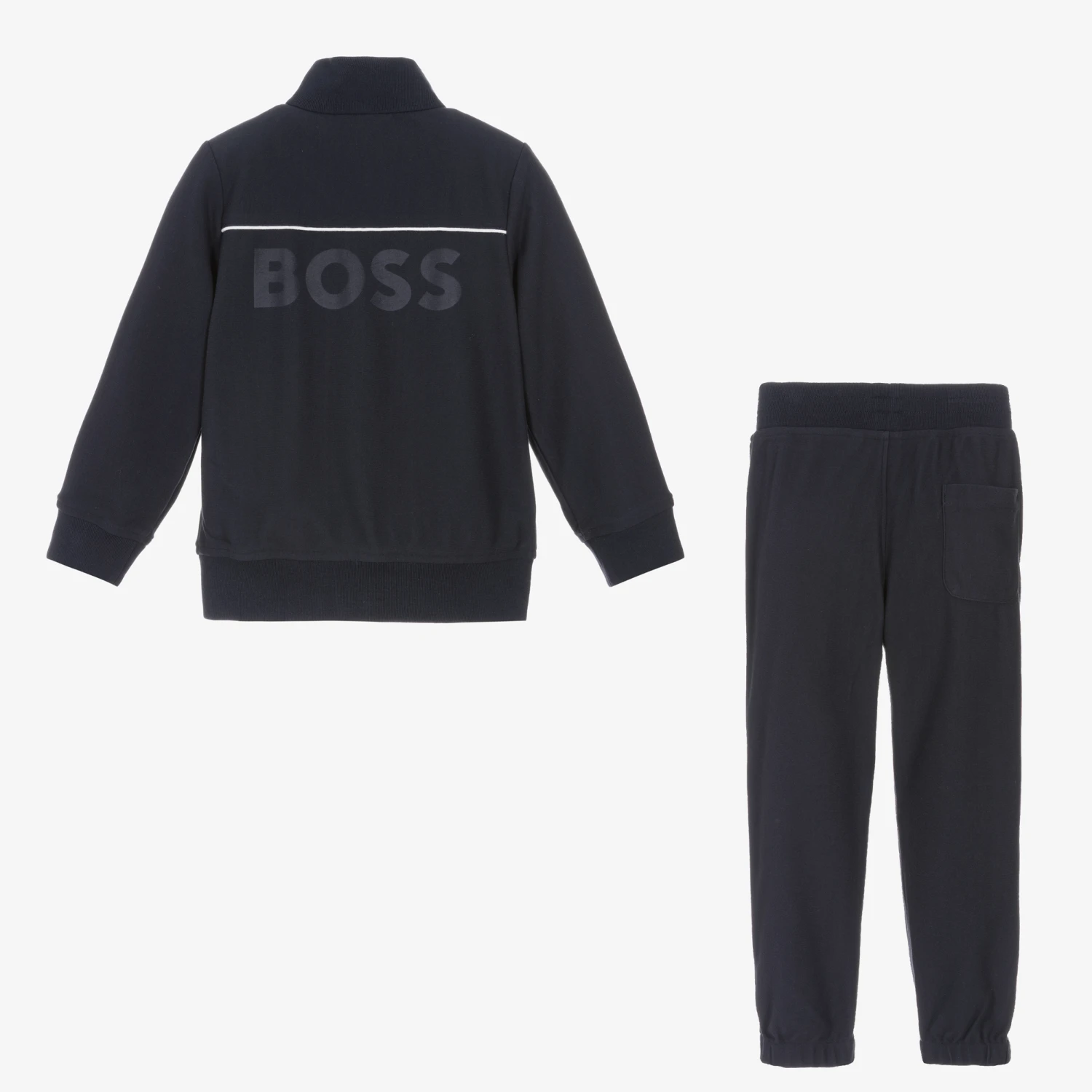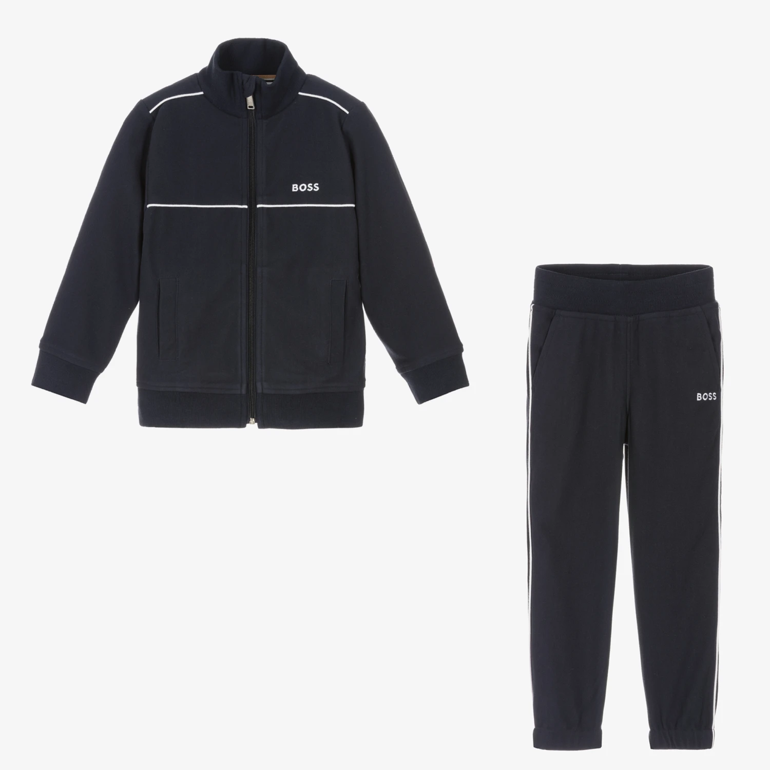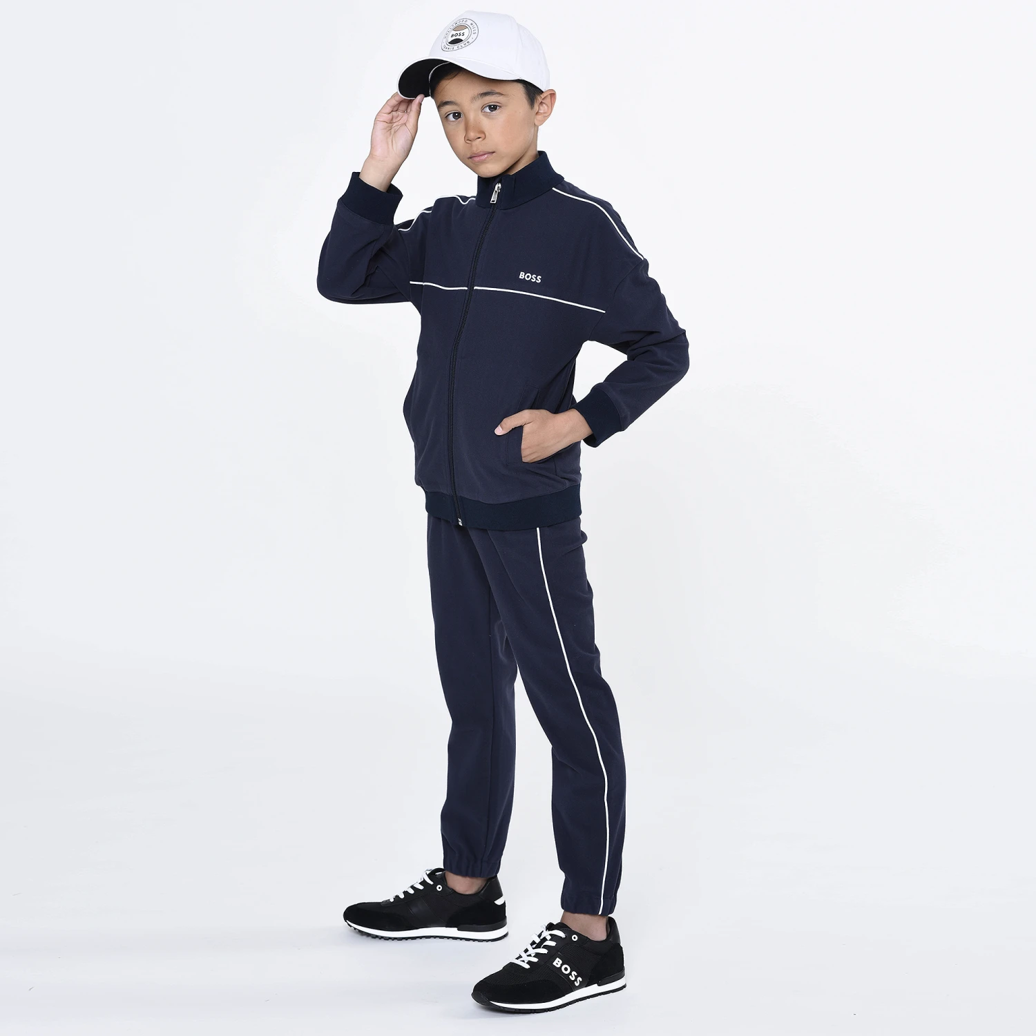 A cool navy blue tracksuit for boys by BOSS, made in soft brushed cotton jersey. The zip-up top has a white logo embroidered on the chest with a large tonal logo on the back. White piping and a high ribbed collar add a sporty element. Comfortable to wear, the matching bottoms have an elasticated waist and slanted pockets on the hips. They taper at the ankle with elasticated trims.