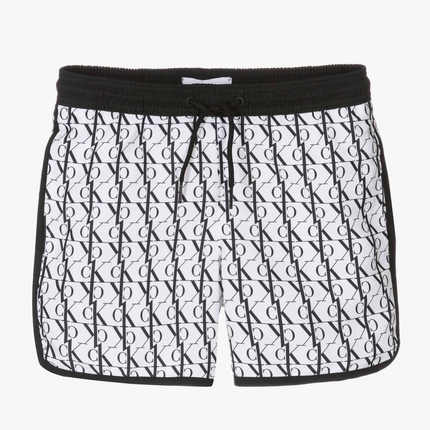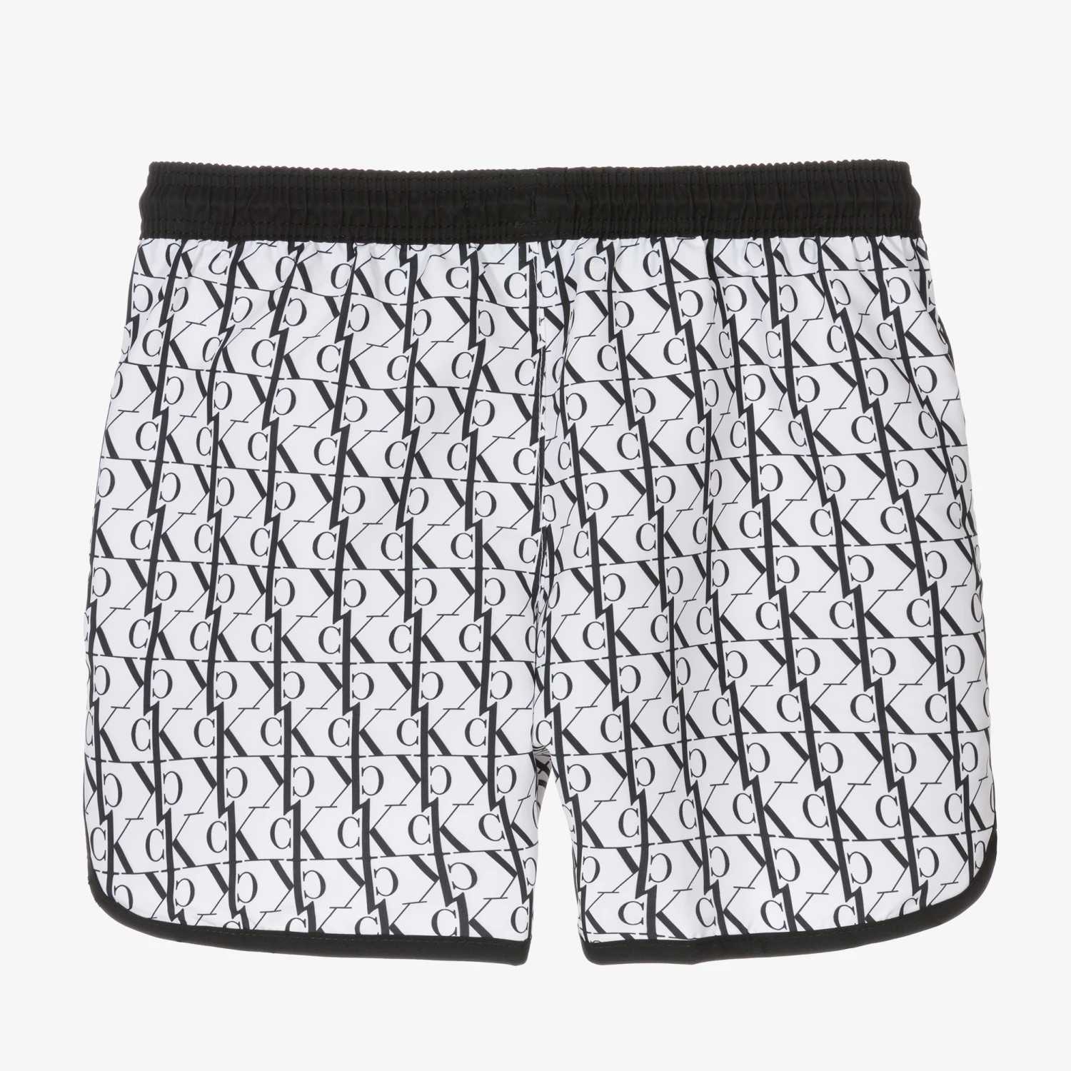 White and black swim shorts for boys by Calvin Klein, with an all-over monogram logo print. Made from lightweight recycled polyester with a white mesh lining, they are water-repellent for quicker drying and have sporty shaped leg cuffs. The elasticated waistband has an adjustable drawstring for a good fit and there are useful concealed side pockets.
