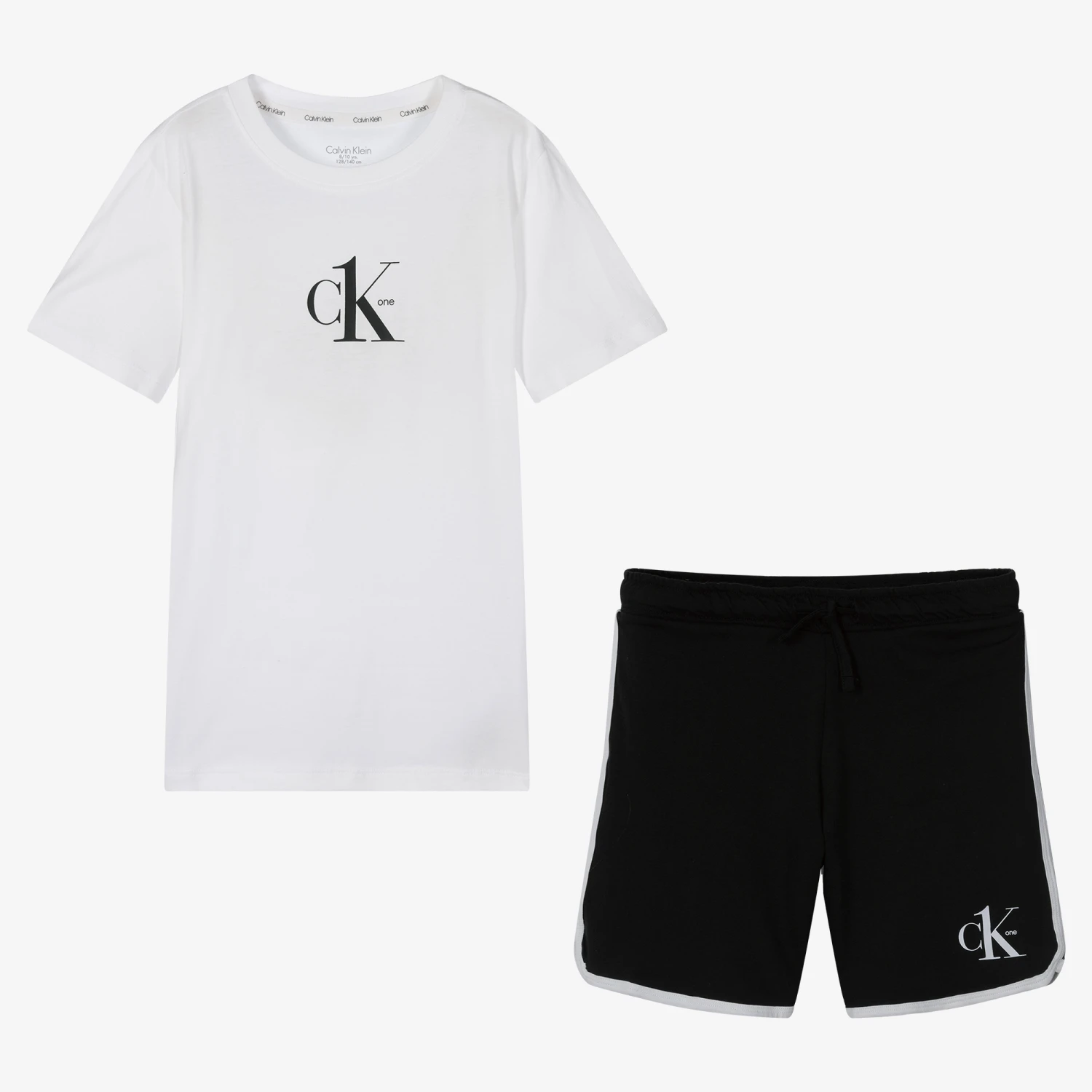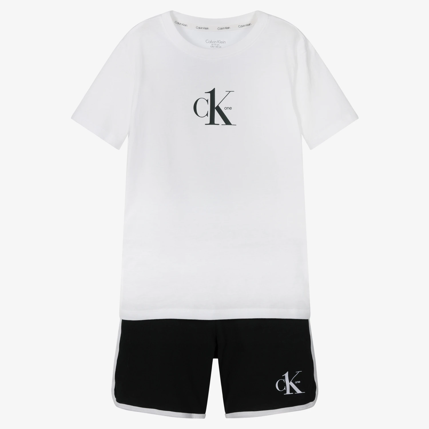 Stylish white and black short pyjama set for boys by Calvin Klein, made in soft and comfortable cotton jersey. Ideal as nightwear or relaxing loungewear, both pieces have contrast logo prints and the shorts have a drawstring waist and sporty white trim.