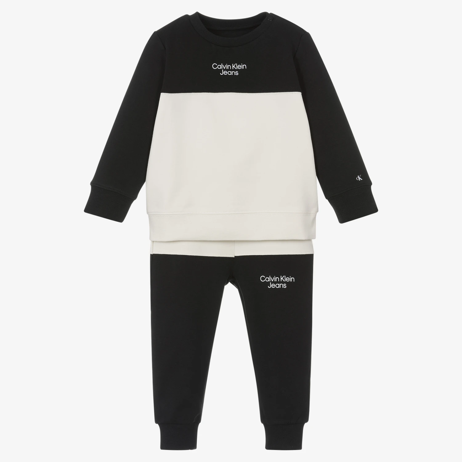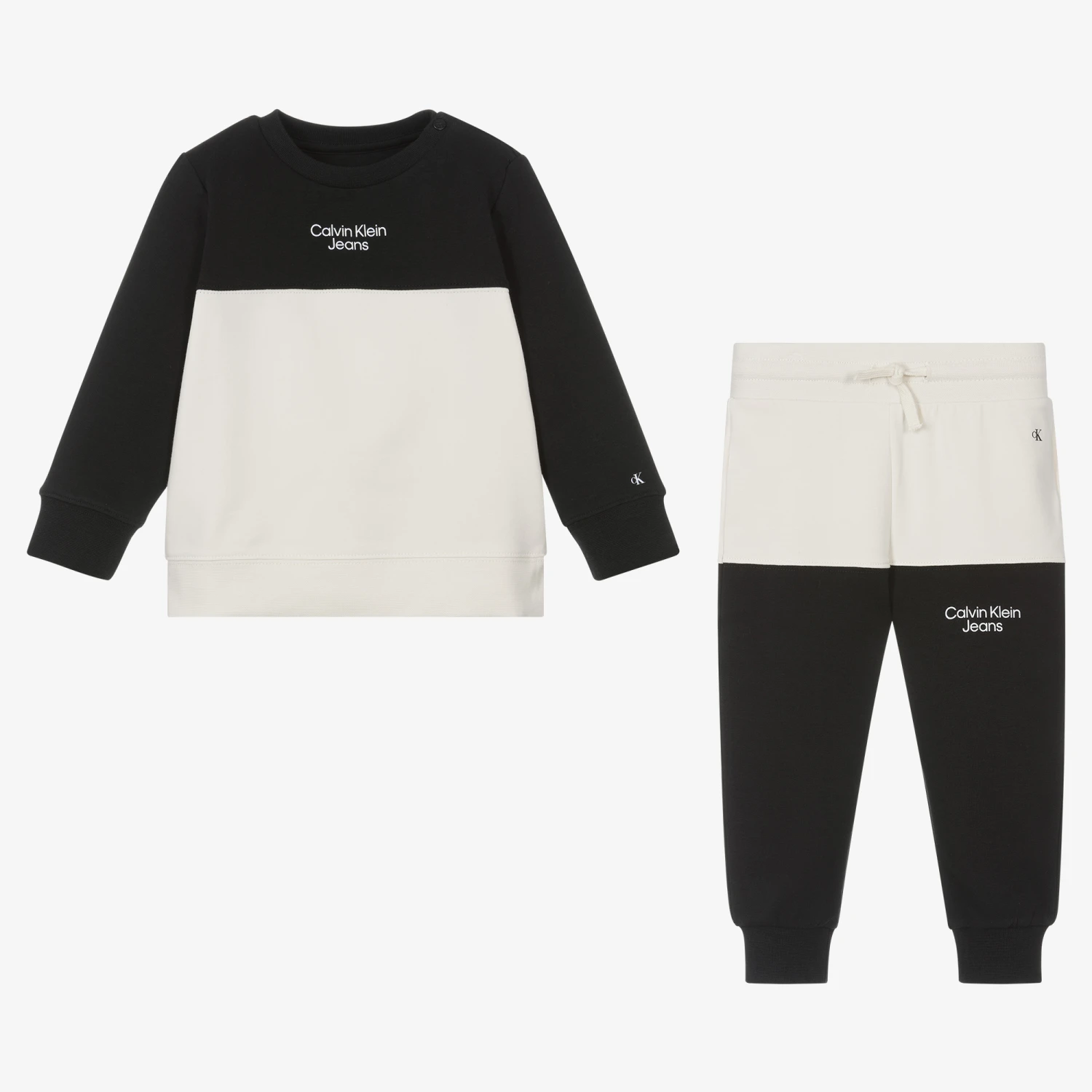 Black and ivory colourblock tracksuit for little boys and girls by Calvin Klein Jeans. Made in lightweight cotton sweatshirt jersey, both pieces have ivory logo prints. The top has poppers on one shoulder for ease and the joggers have a drawstring tie for a comfortable fit. Made with at least 50% organic cotton.