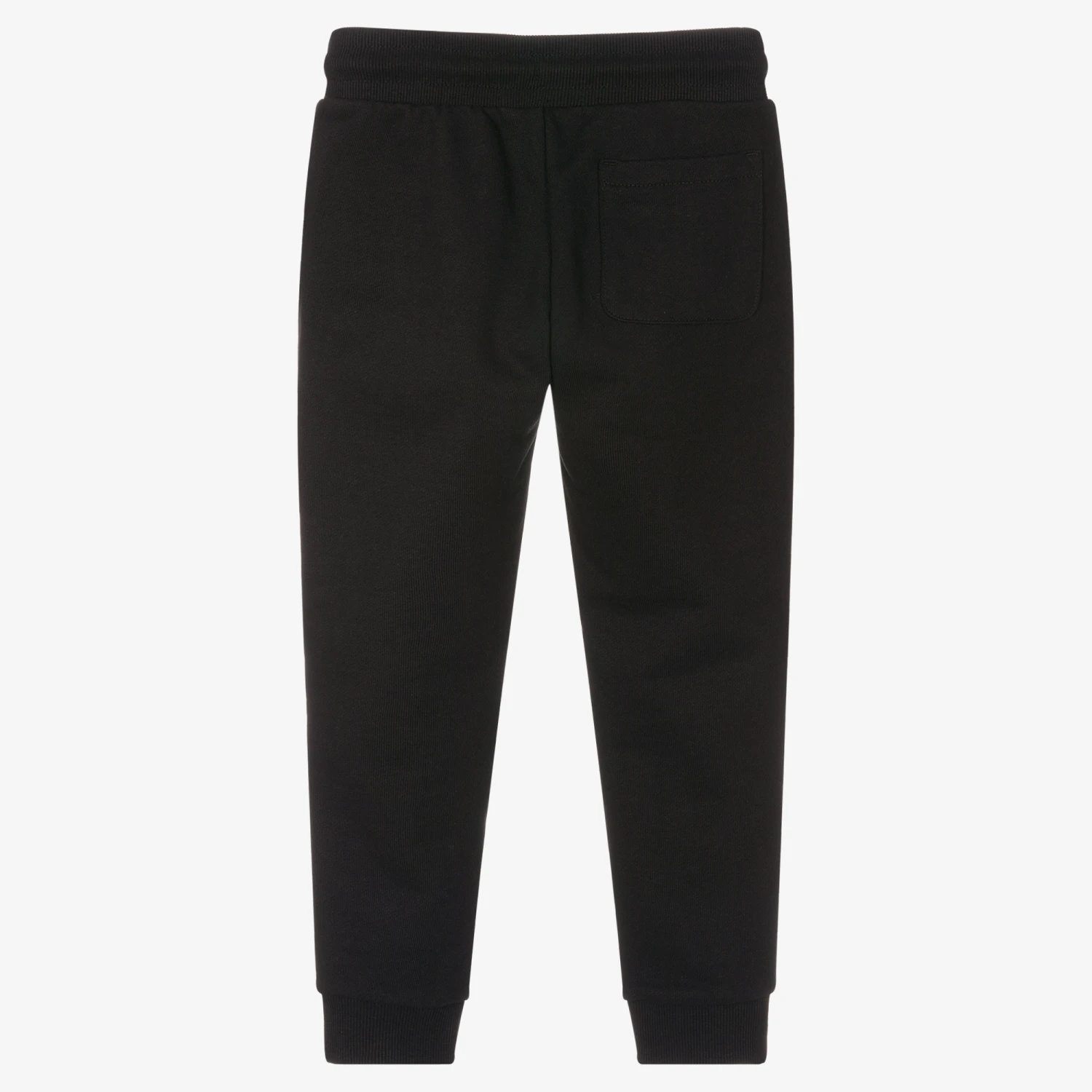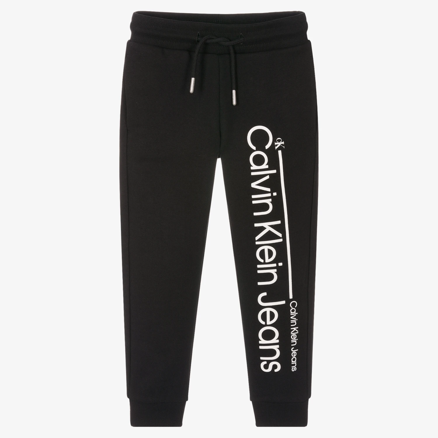 Black joggers for boys by American brand Calvin Klein Jeans, with a bold white logo and monogram logo printed on one leg. They are made in sweatshirt cotton jersey with concealed side pockets and one back pocket. They have a useful drawstring waistband and ribbed trims.