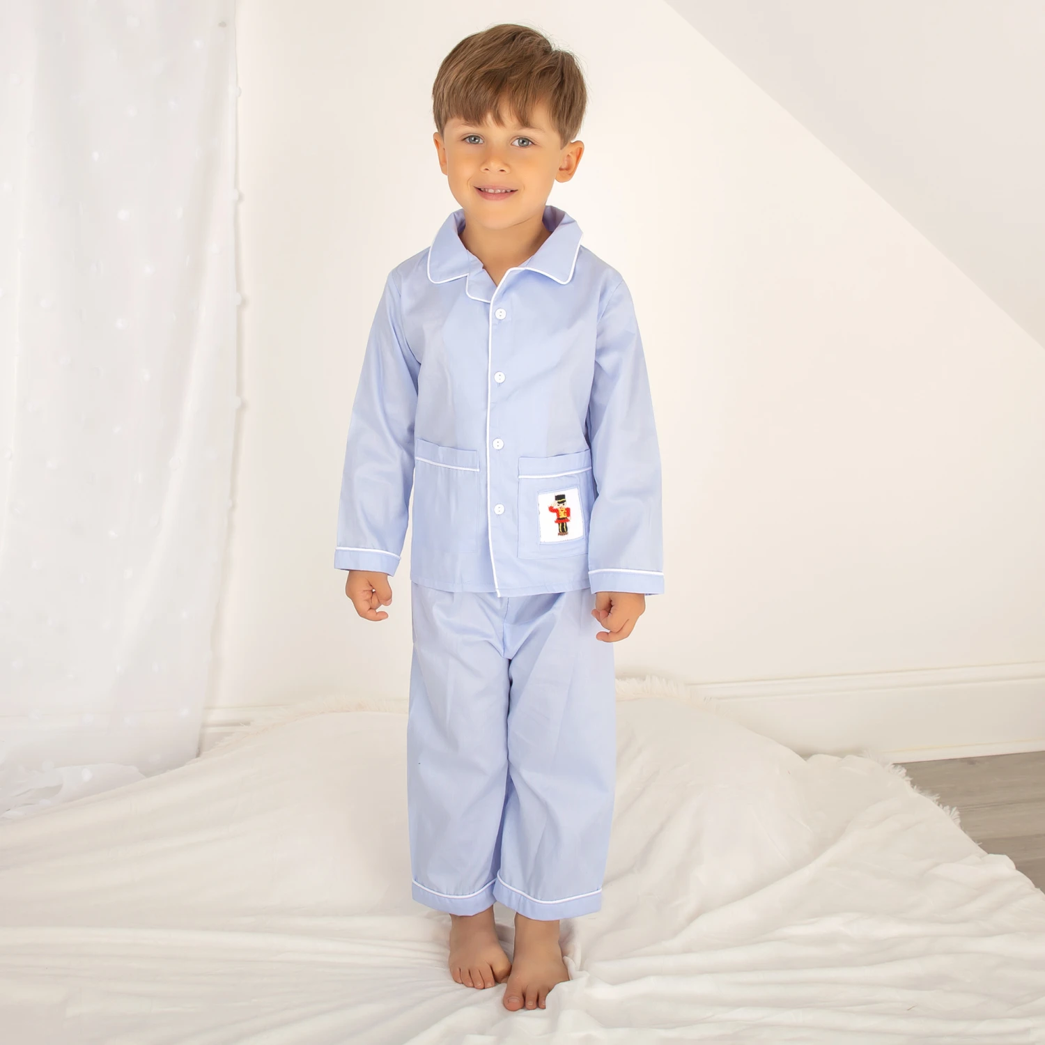 Boys blue pyjamas from Caramelo Kids, made in soft and lightweight cotton. They have a hand-smocked and embroidered soldier on the pocket and white piped trim.