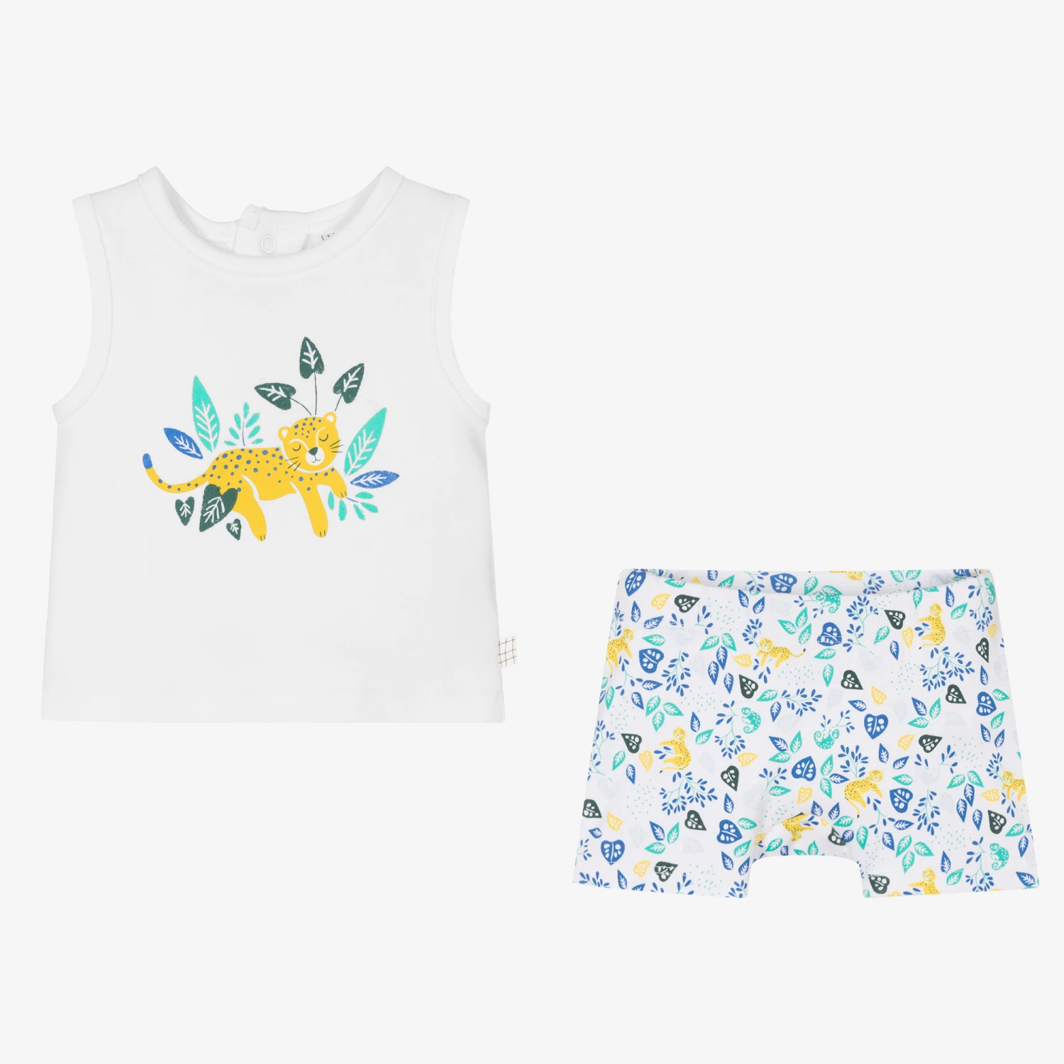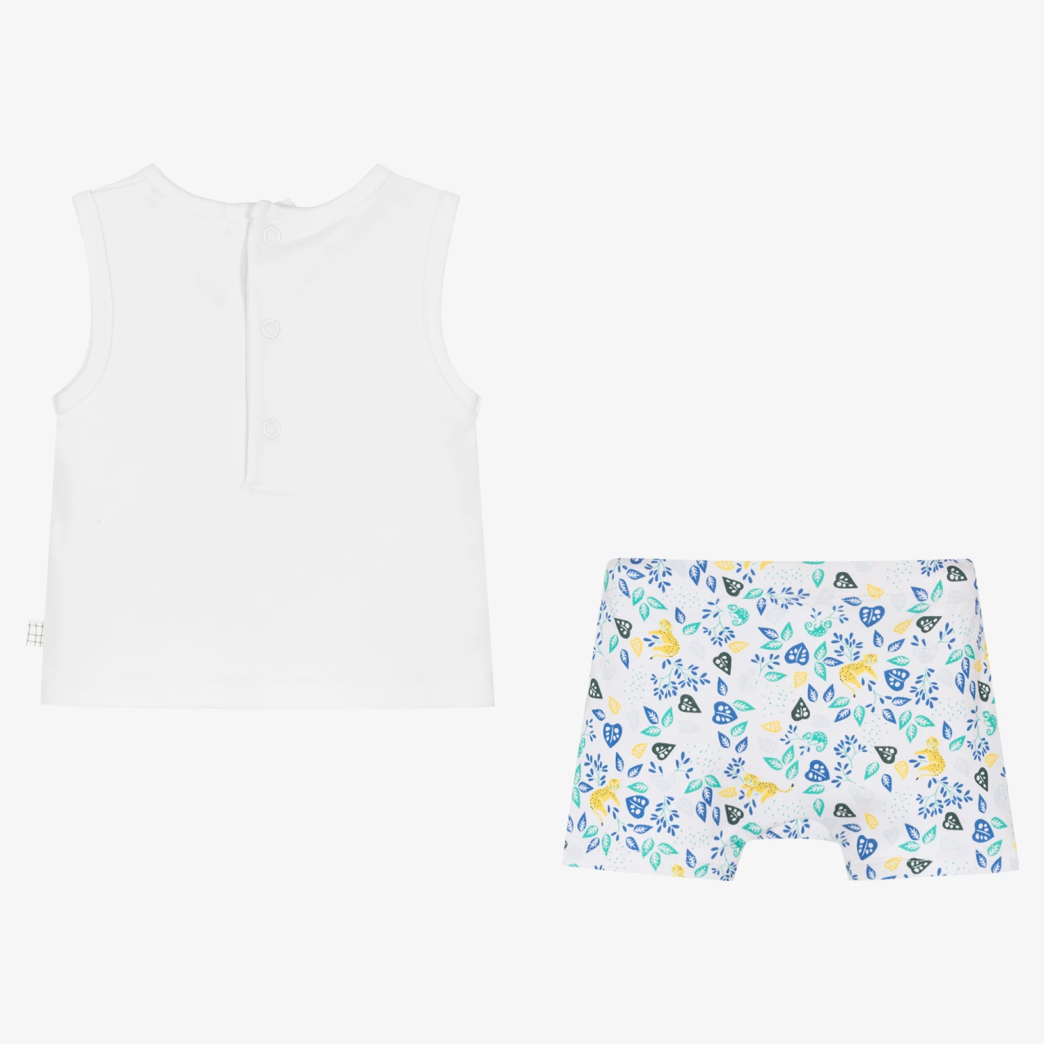 White top and shorts set for little boys by French brand Carrément Beau, with a fun jungle theme print in yellow, green and blue. Easy and comfortable to wear, both pieces are made in soft organic cotton jersey. The white sleeveless top fastens with poppers on the back, and the patterned shorts have a gently elasticated waist.