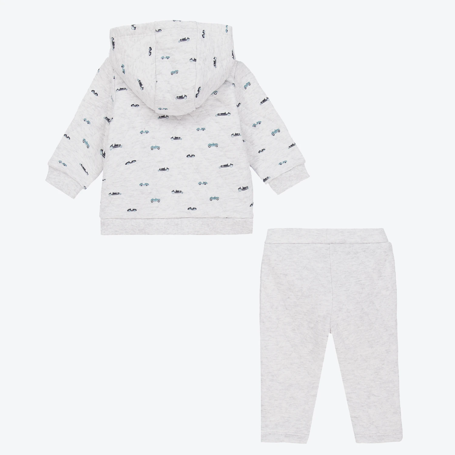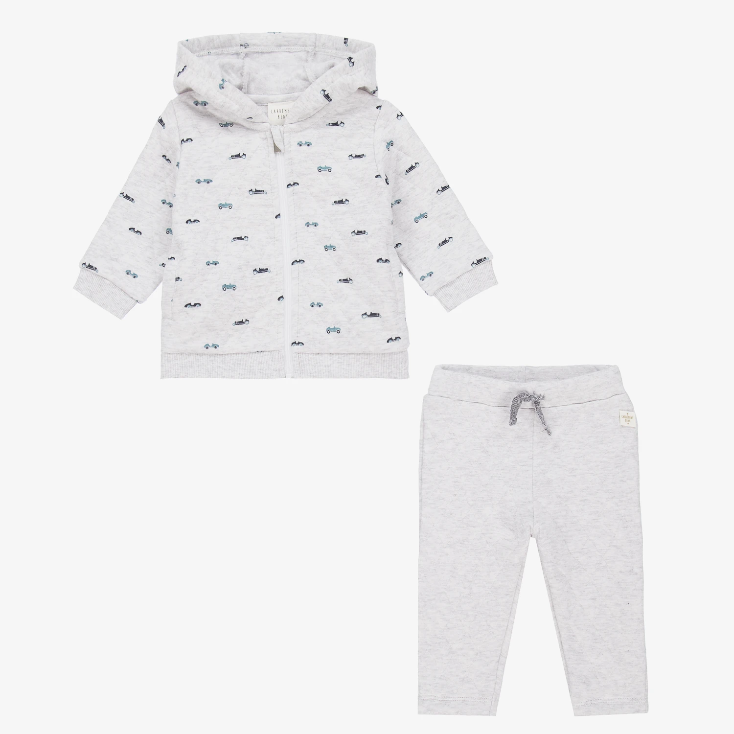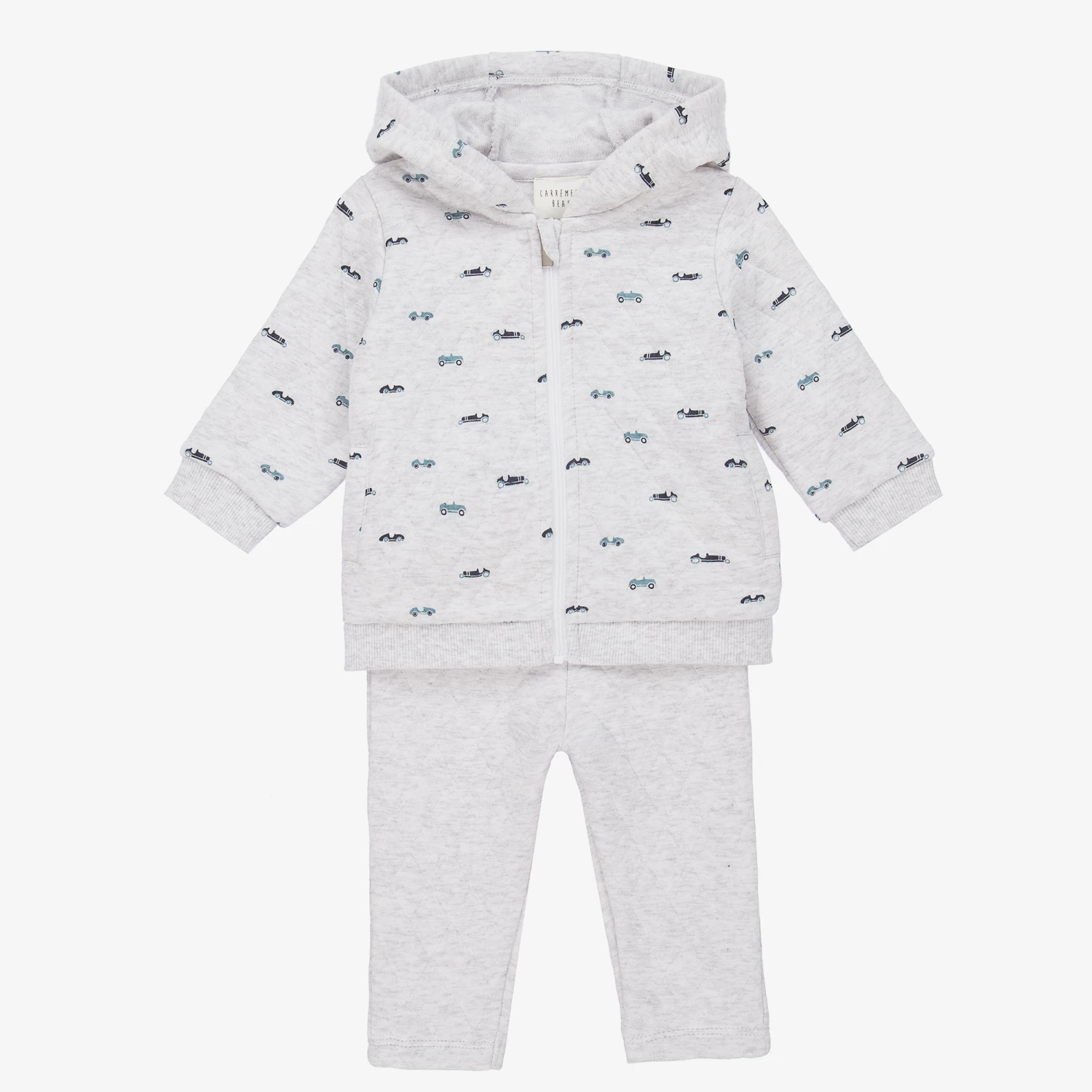Made in comfortable organic cotton jersey, a grey marl tracksuit for younger boys by Carrément Beau. Softly quilted, it has an all-over car pattern in shades of blue. The hooded top fastens with a zip and has hand pockets. The matching joggers have a gently elasticated waistband.