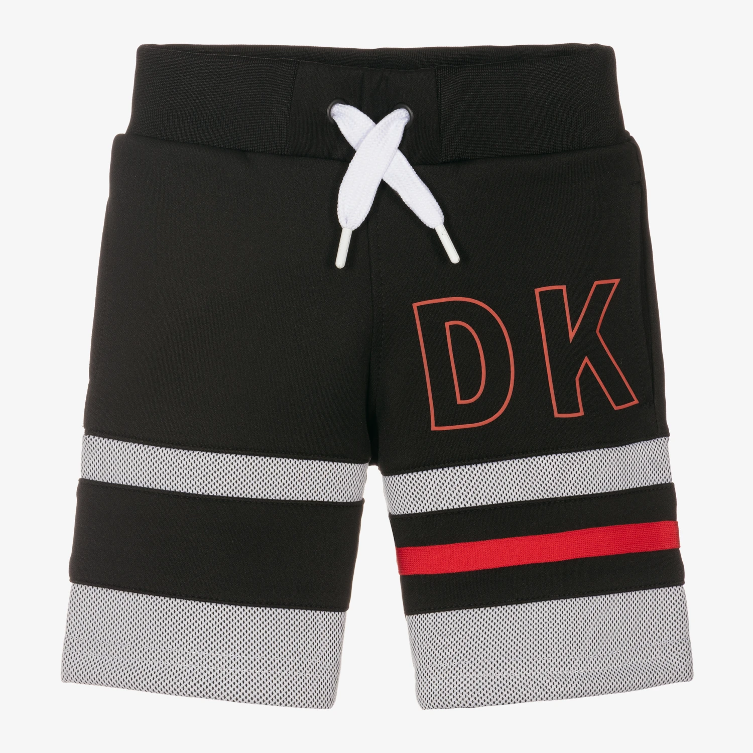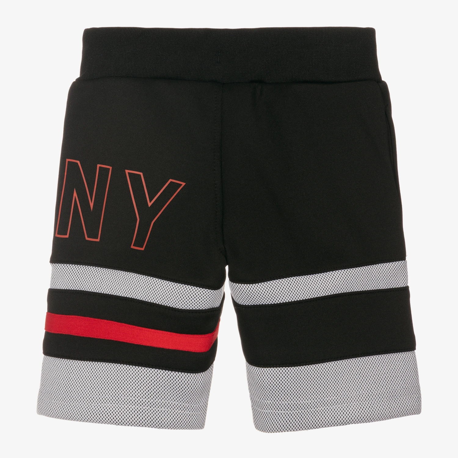 Black jersey shorts for boys by DKNY, made in a polyester jersey. They have a bold red rubber logo print on the front and back, with red trims and white perforated detailing. They have two side pockets and a drawstring waist.