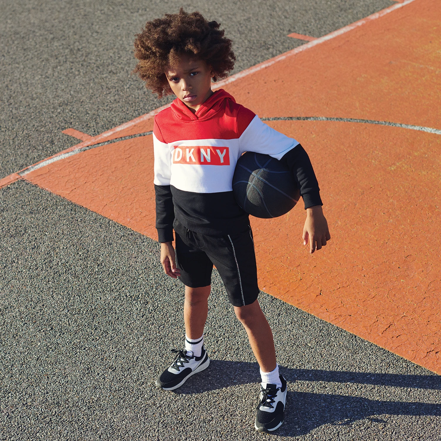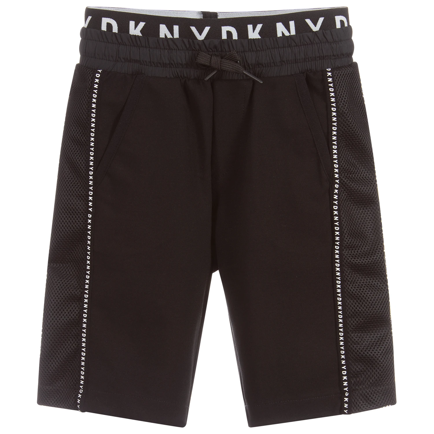 Boys black sporty shorts by DKNY, made from thick viscose blend jersey with soft mesh panels on each side. These casual shorts have white branded trims and a soft, elasticated, double layered waistband with ‘DKNY’ logo’s.