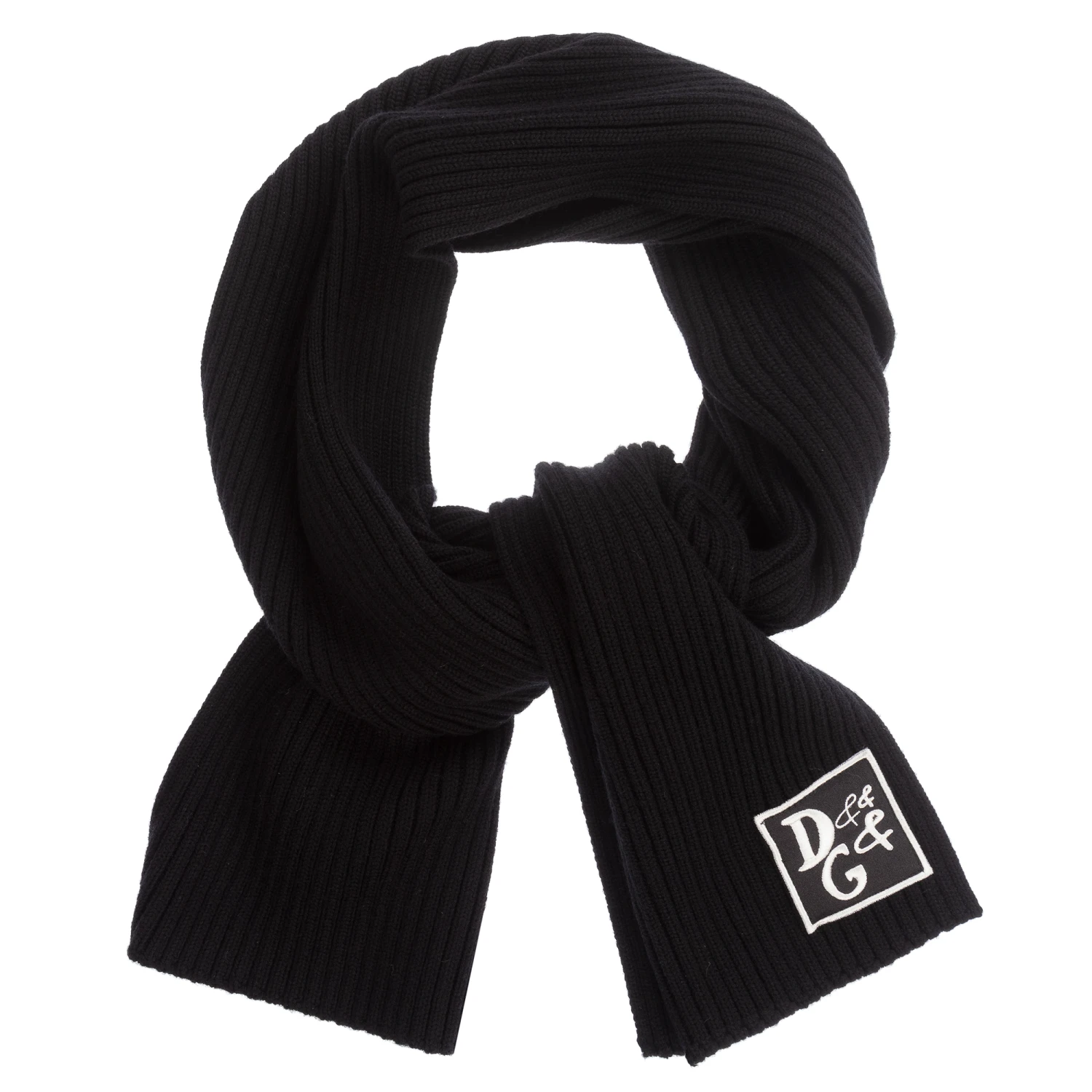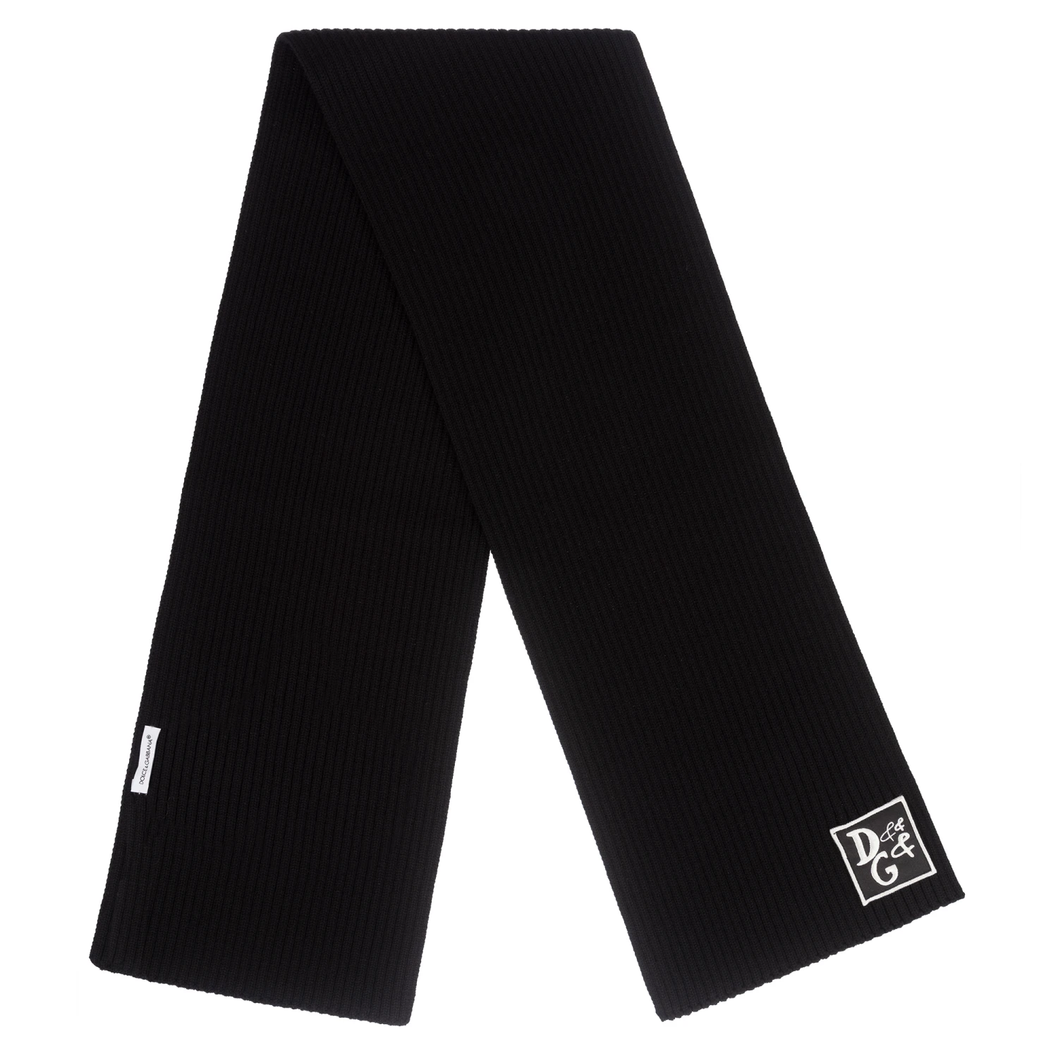 Black wool scarf by luxury brand Dolce & Gabbana. It made in a stretchy ribbed knit and has a black and white logo appliqué.