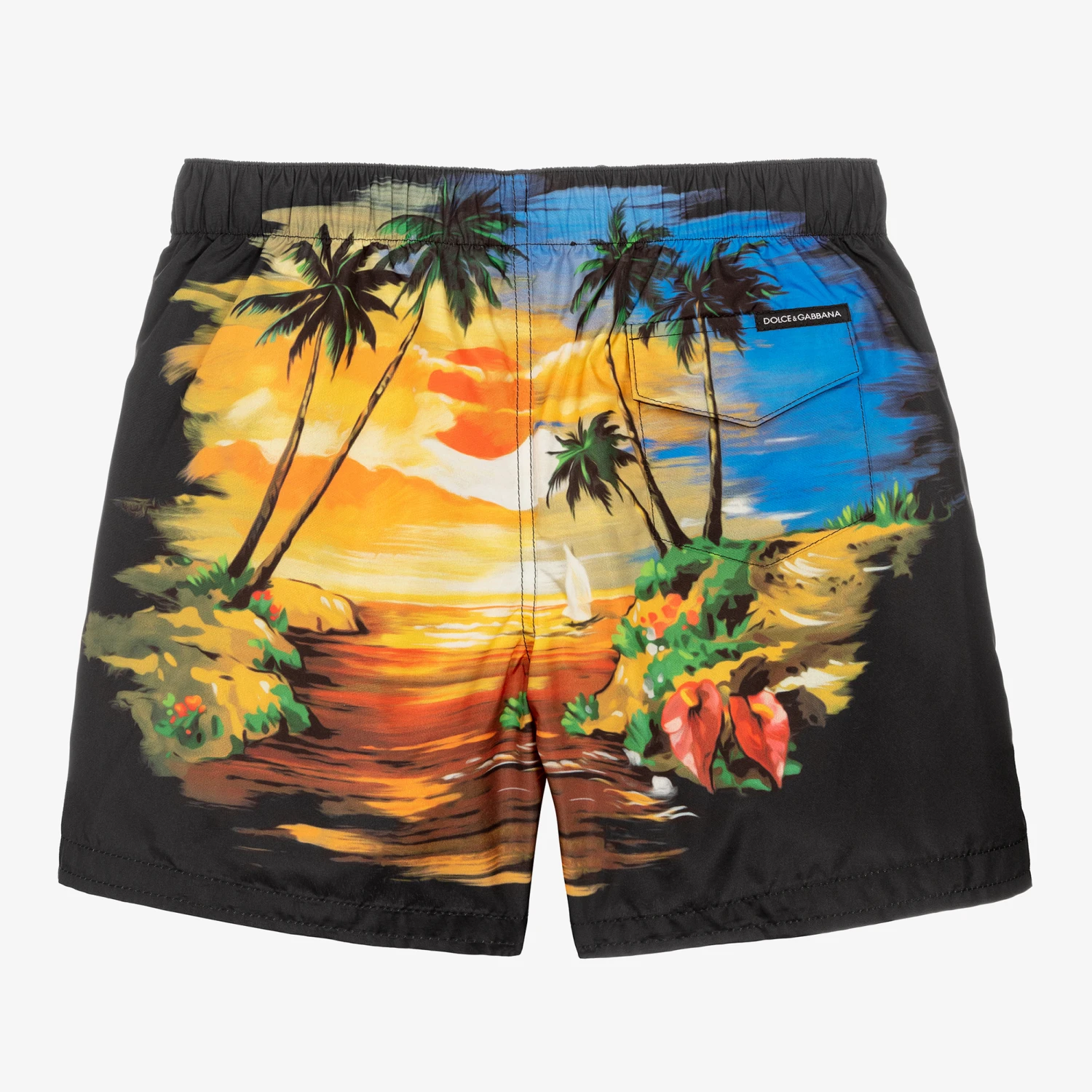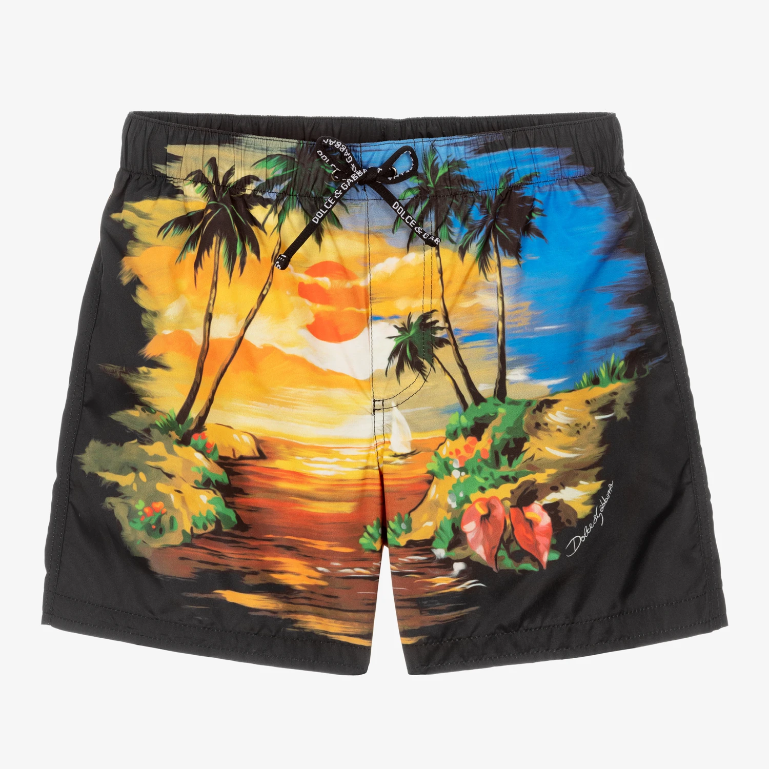 Summery black swim shorts for boys from Italian luxury brand Dolce & Gabbana, made in silky and lightweight fabric. Lined with soft mesh, they have a vibrant Hawaiian print on the front and back with subtle script logos, inspired by the adult collection. There is a comfortable elasticated waist with a drawstring fastening for an adjustable fit.