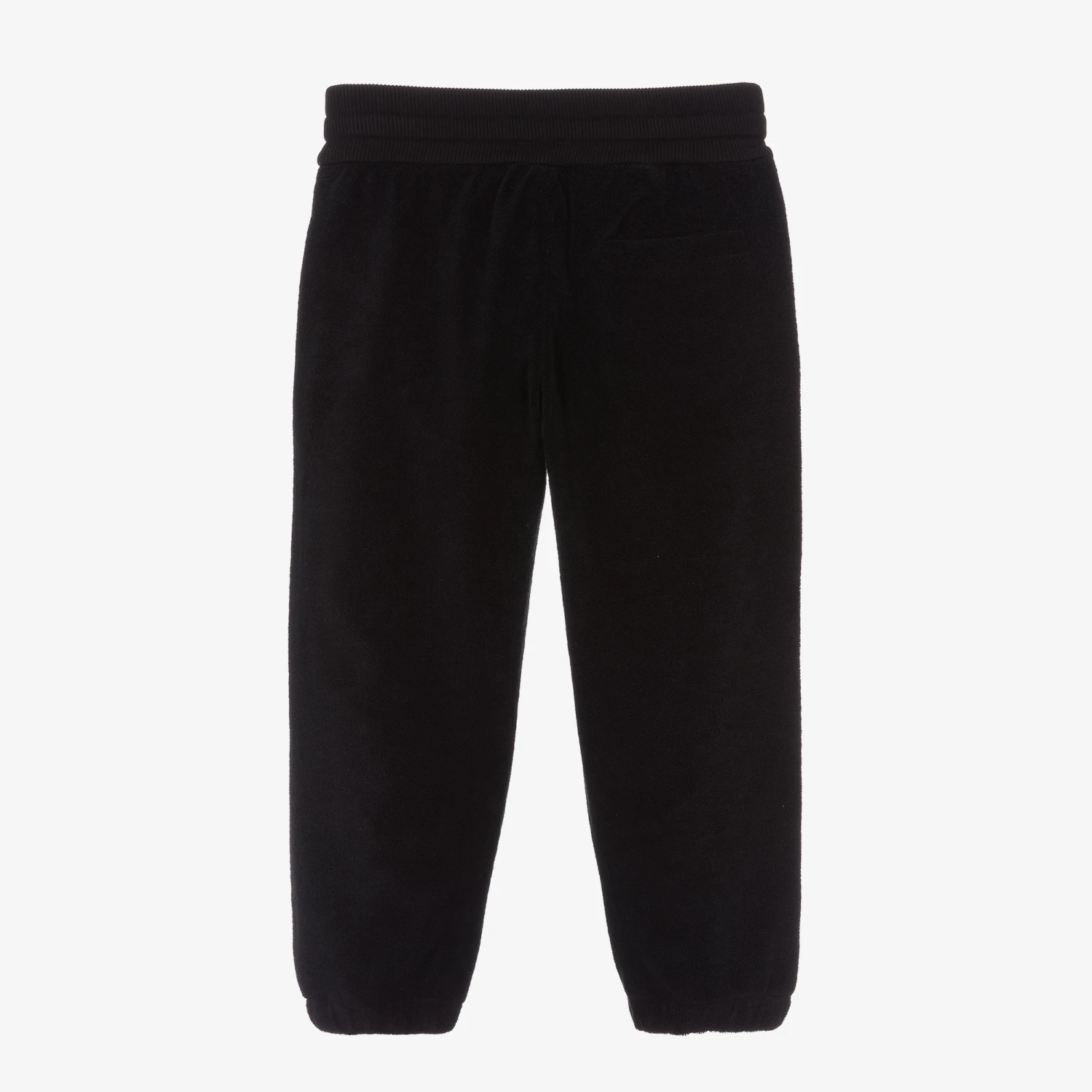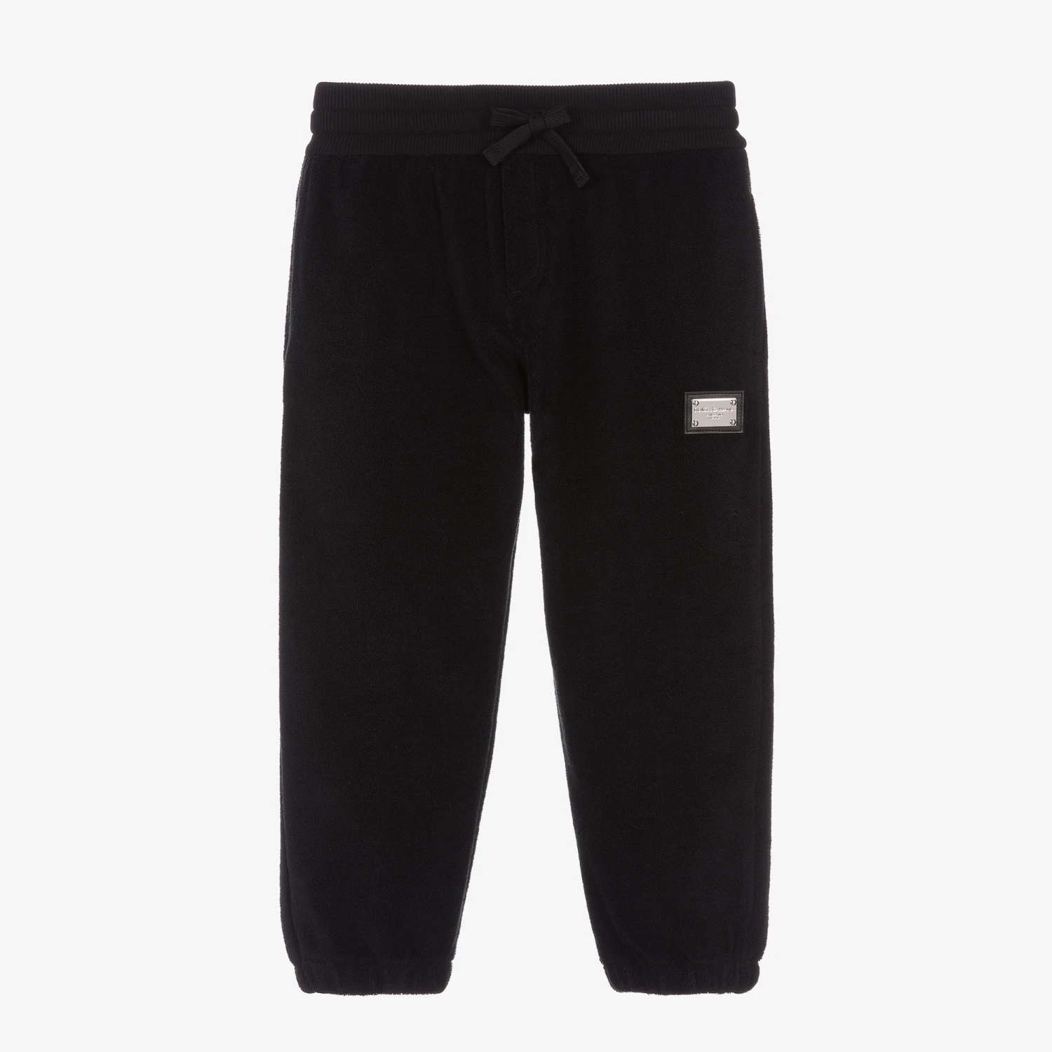 For casual comfort and understated elegance, these black terry cotton Mini-me joggers for boys are by luxury Italian brand Dolce & Gabbana. Lovely for lounging, they have gently elasticated ankles and a ribbed drawstring waist for an adjustable fit. There are two side seam pockets and a single back pocket, with a leather and branded metal plate on one leg adding a designer statement.