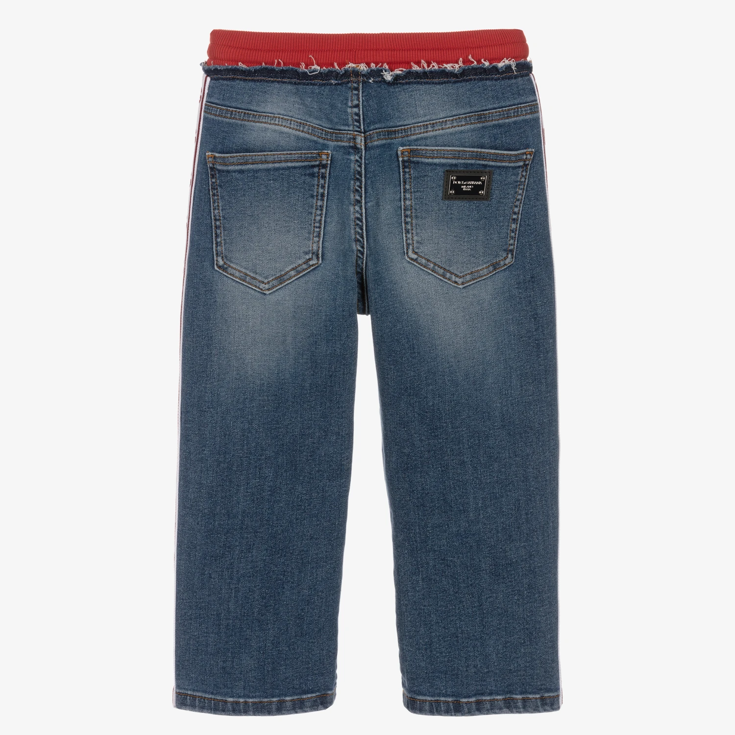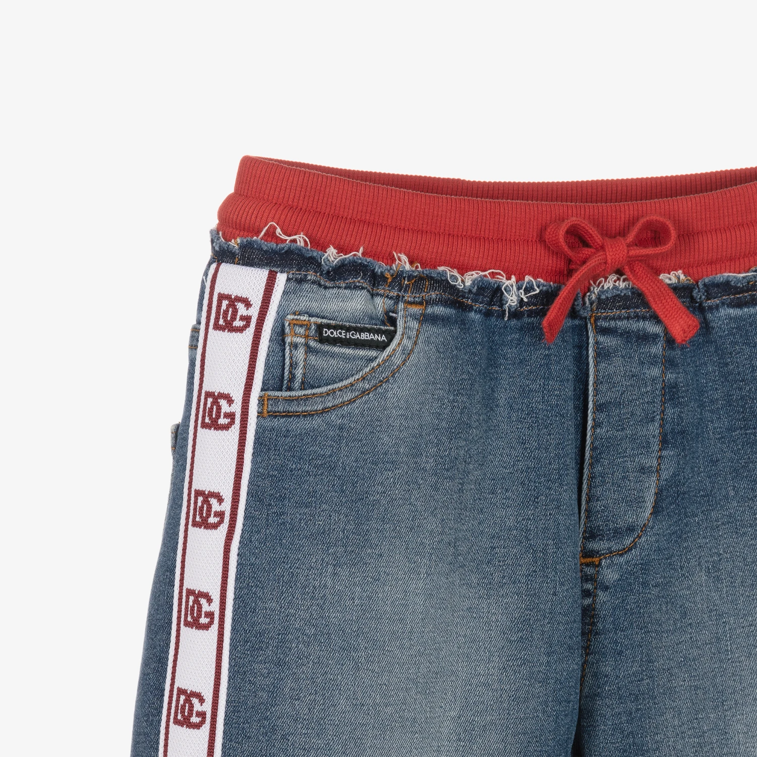 Casual oversized trousers for boys by Dolce & Gabbana, in a mid-blue washed cotton denim. This unique luxury piece is designed in a five-pocket jeans and joggers cross-over look. They have eye-catching, white and red DG logo jacquard knit taping on the sides with a silver metal and faux leather logo plate on one of the back pockets for a signature look. The ribbed red waistband has a drawstring for an adjustable fit and frayed detailing underneath to accentuate the vintage vibe.