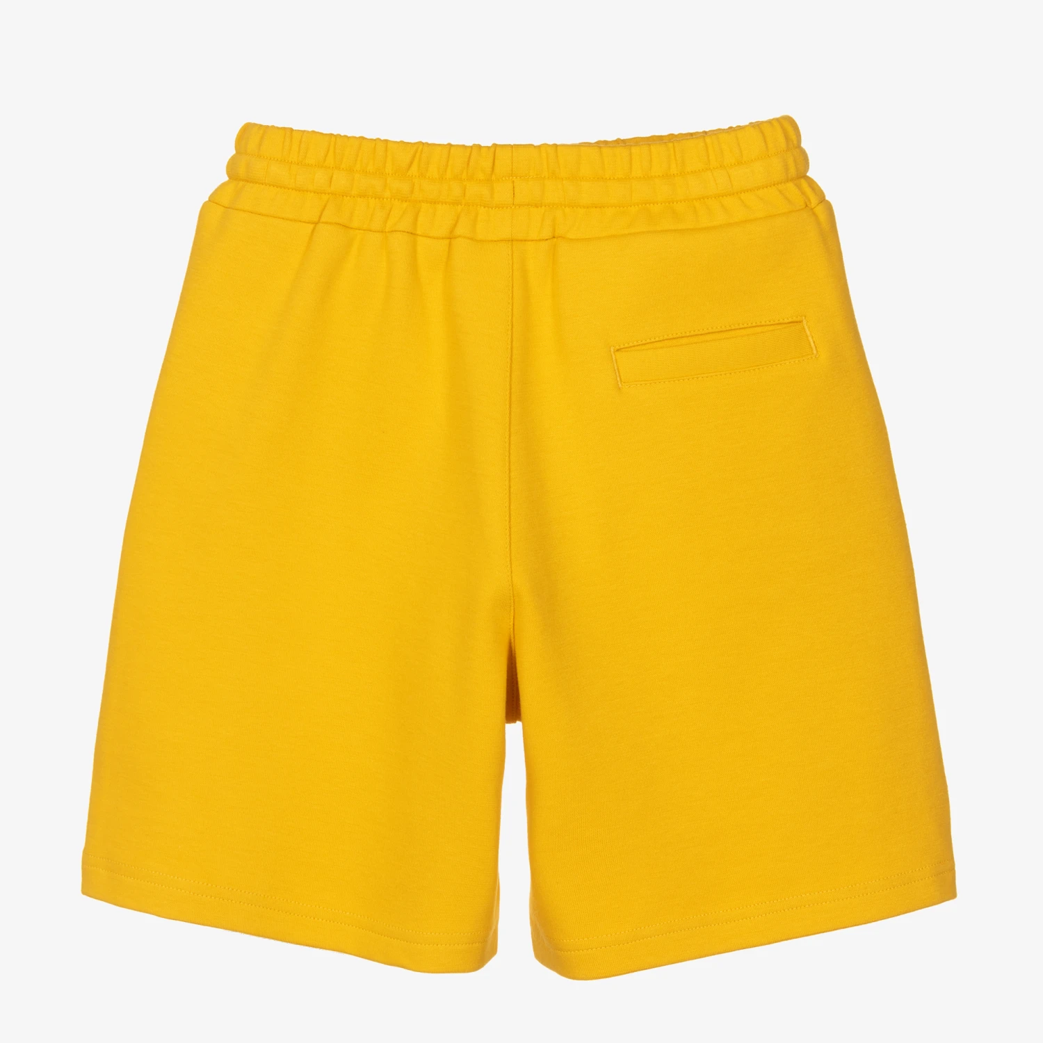 Boys yellow Bermuda length shorts by luxury brand, Dolce & Gabbana. Made in medium-weight cotton sweatshirt jersey, they have an adjustable drawstring waist and side pockets. The designer’s DG logo is embroidered at the hip, and there is a besom pocket on the back.