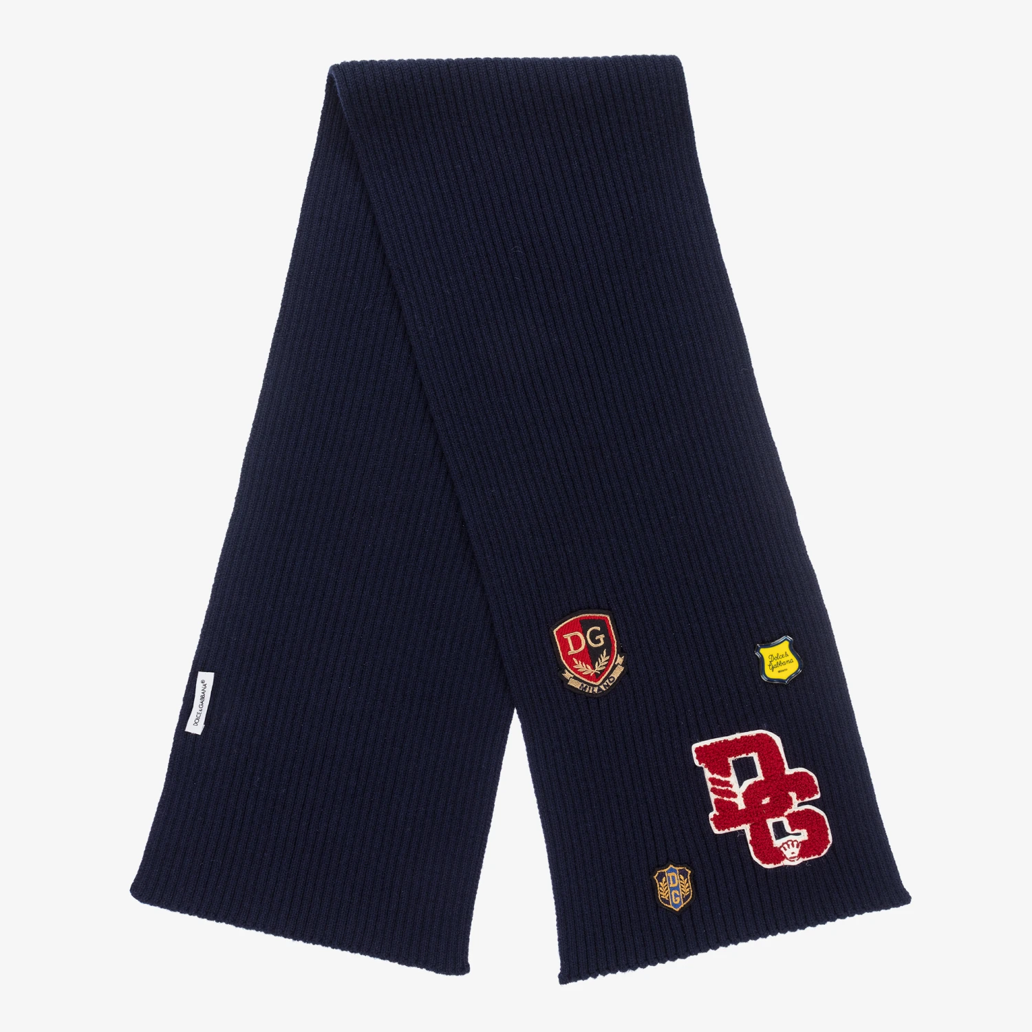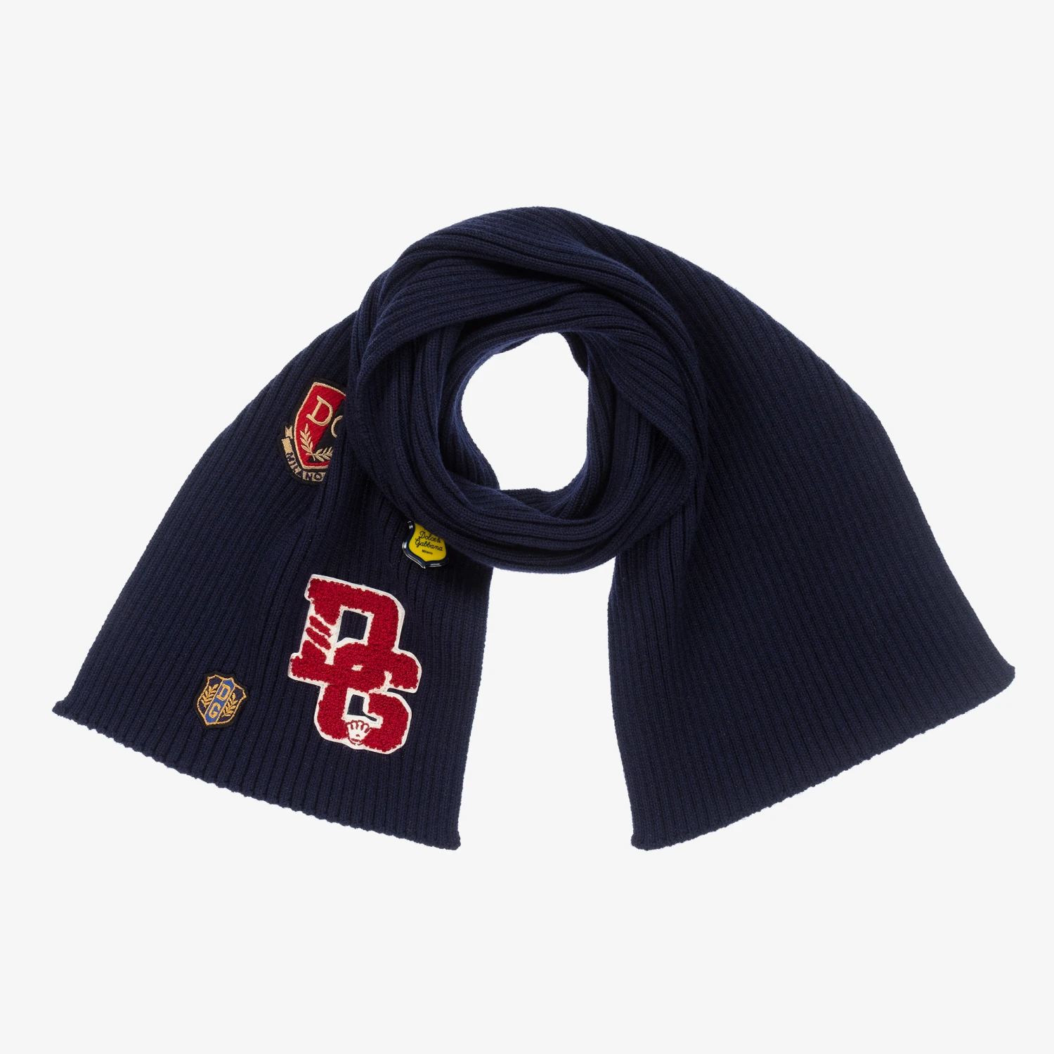 Boys navy blue wool knitted scarf by luxury Italian designer, Dolce & Gabbana. Beautifully soft, it is decorated with varsity inspired D&G logo patches in blue, red and ivory, with towelling details and a yellow brass logo.