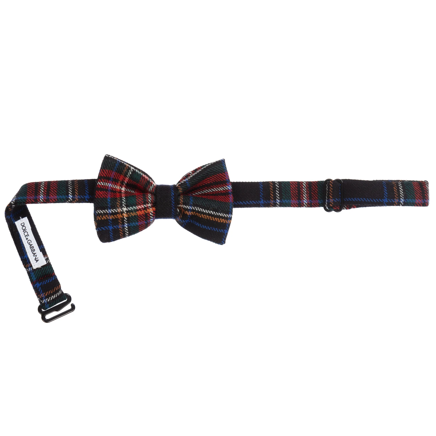 Teen boys blue and red tartan bow tie by luxury brand Dolce & Gabbana. It is made in a soft wool blend, with an adjustable neck strap and a hook fastening.